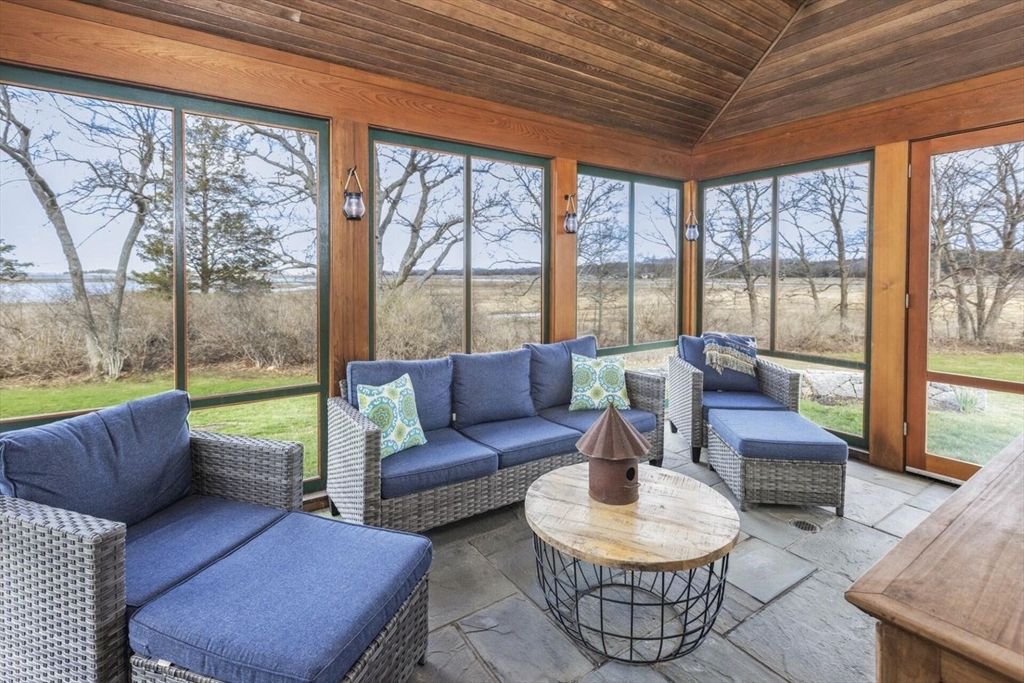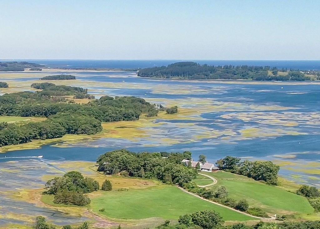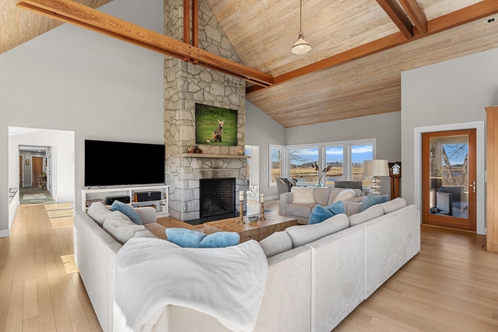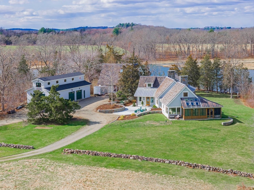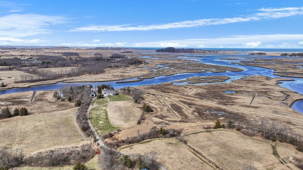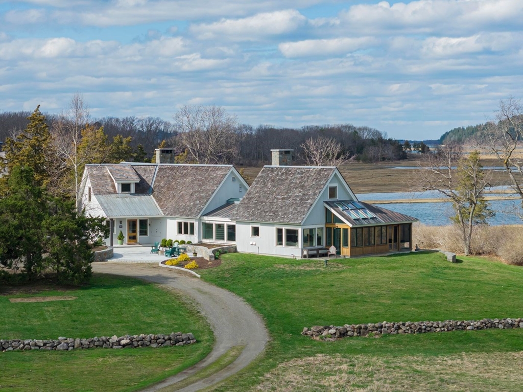 “Rivers Edge” a 4.6± acre waterfront estate offers 400' of frontage along the Essex River with sweeping panoramic views of the river, marsh, Crane Beach, Choate Island, and beyond. Abutting conservation land, the Cox Reservation, and across the river to the 165-acre Cogswell’s Grant, the setting provides privacy and permanently preserved natural beauty. The property offers a custom-designed 2002 Contemporary-style main residence with views from nearly every room, a separate three-bedroom guest house with elevated views of the marsh, and a substantial two-story barn/garage with scale and versatility for vehicles, boats, animals or workshop use. Walls of glass, vaulted wood-paneled ceilings, stone and natural materials create an interior that feels deeply connected to the outdoors. Notably, the residences are sited outside the flood zone—an uncommon distinction along the coast. Surrounded by nature, this bucolic property feels remote but is just minutes from the quaint village of Essex.