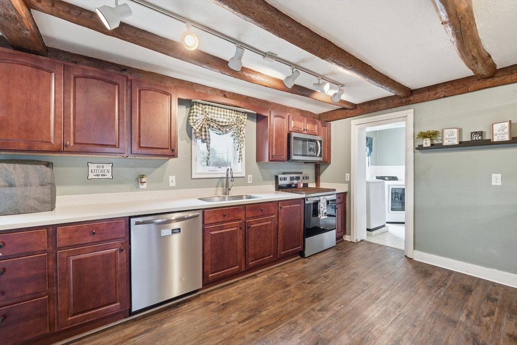 A true work, live, and play property! Discover a beautifully maintained farmhouse offering 5 beds and 2 full baths, blending classic character with modern updates. Bright, warm living spaces features large windows, hardwood and pine floors, and thoughtful layout. The kitchen has SS appliances, quartz counters, custom cabinetry, and a walk-in pantry. A dedicated laundry room, mudroom, and home office, round out the practical touches. Two large 2-story outbuildings: 33x35 barn plus a 24x34 former office building are ideal for home office, work shop, hobby space, small business HQ, or an ADU conversion. The possibilities are endless! Four garage bays handle vehicles, and overflow storage with ease. Unfinished attic space offers even more storage. Property upgrades include a wired-in generator, central air, newer roof, and solar panels to keep energy costs low. Conveniently located off major routes 91 and 5/10, for visibility and easy access. This is not just a home - it's a lifestyle!
