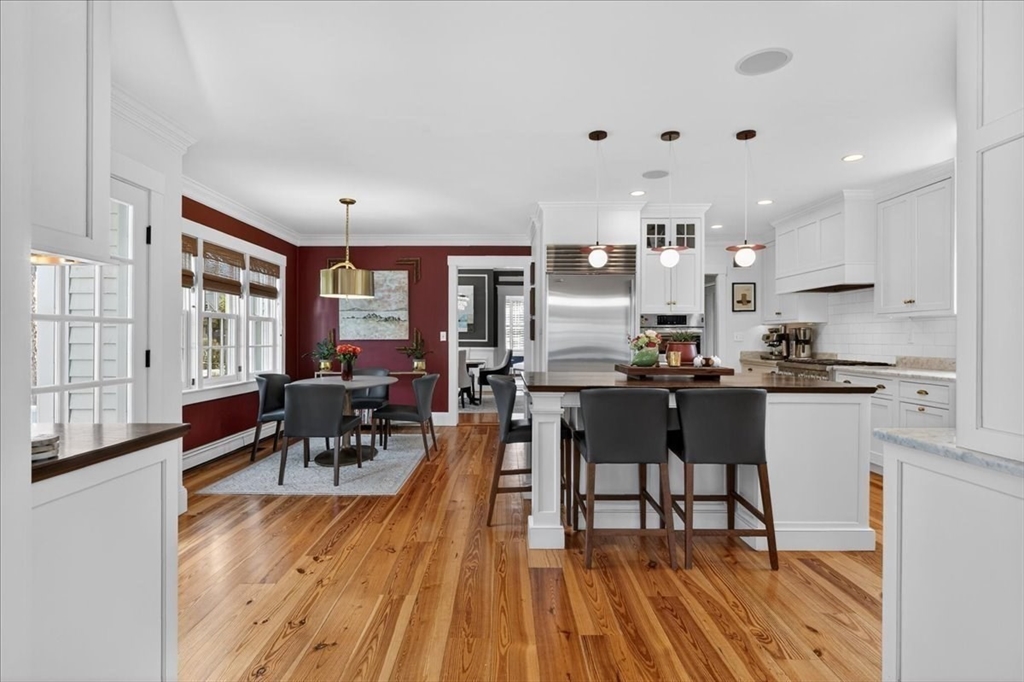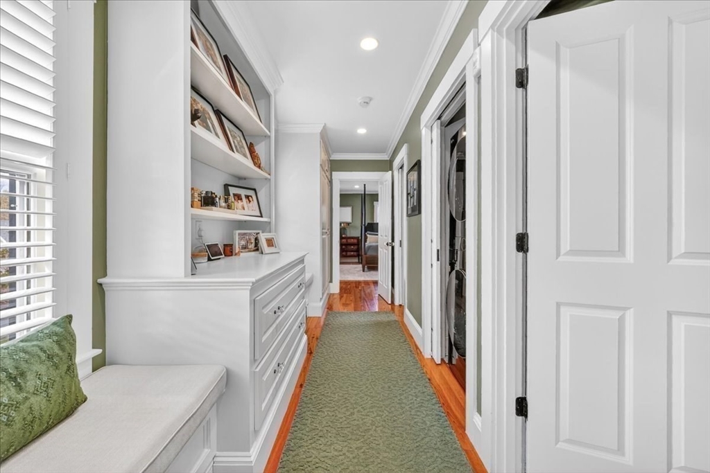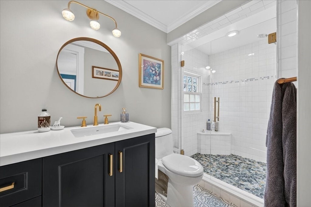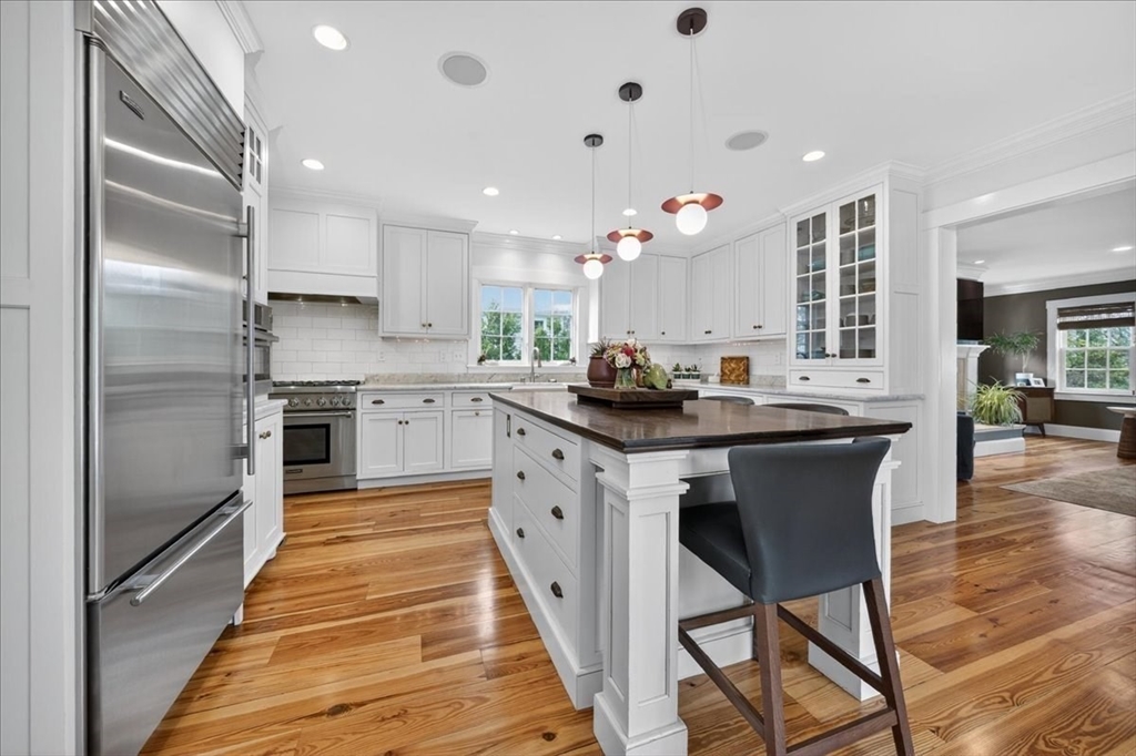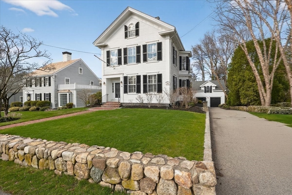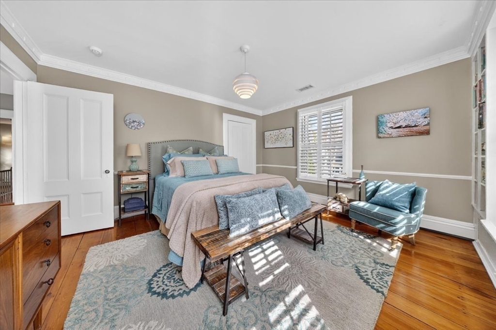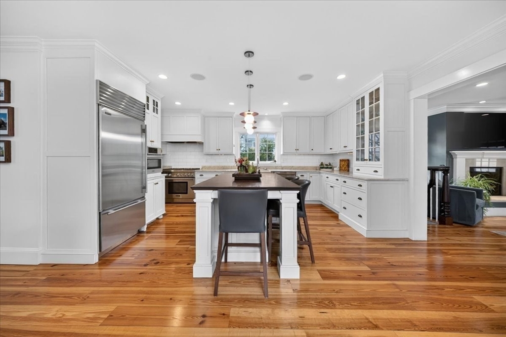 Stylish Colonial home with Carriage House, a stone’s throw from Hingham’s quaint downtown center! Main house boasts 4 bedrooms, 3.5 baths, office (or Guest Bed) & media room. Crown molding and hardwood floors throughout. An open plan chef’s kitchen comes with Thermador appliances- a six gas burner stove top, Sub-Zero fridge & custom cabinetry, leading to an expansive family room with gas fire. Formal dining room with bay window & elegant living room complete this floor. Access the Primary suite through a private hallway, with full bath, walk-in closet, laundry & custom cabinets. Two generous bedrooms and one smaller (or office) also on the 2nd floor. The spacious LL walk-out mud room and office have Buderus radiant heated floors, as do two full baths upstairs. Separate Carriage House includes a new full bath, kitchenette, cathedral ceiling with wooden beams & double garage. A private brick patio overlooks a charming backyard and lawn. Easy access to Boston via commuter ferry/train.
