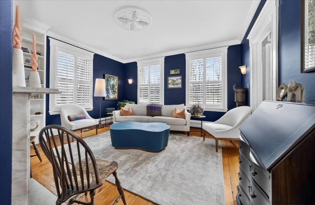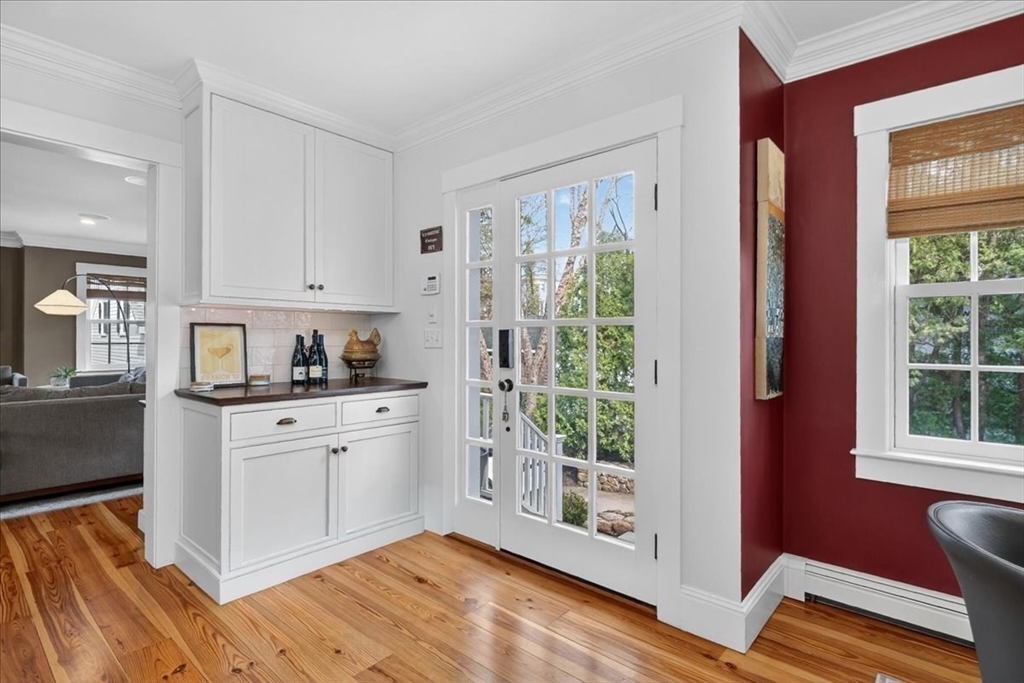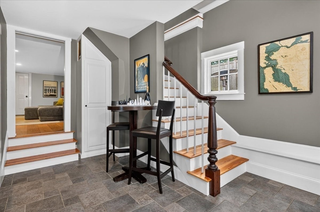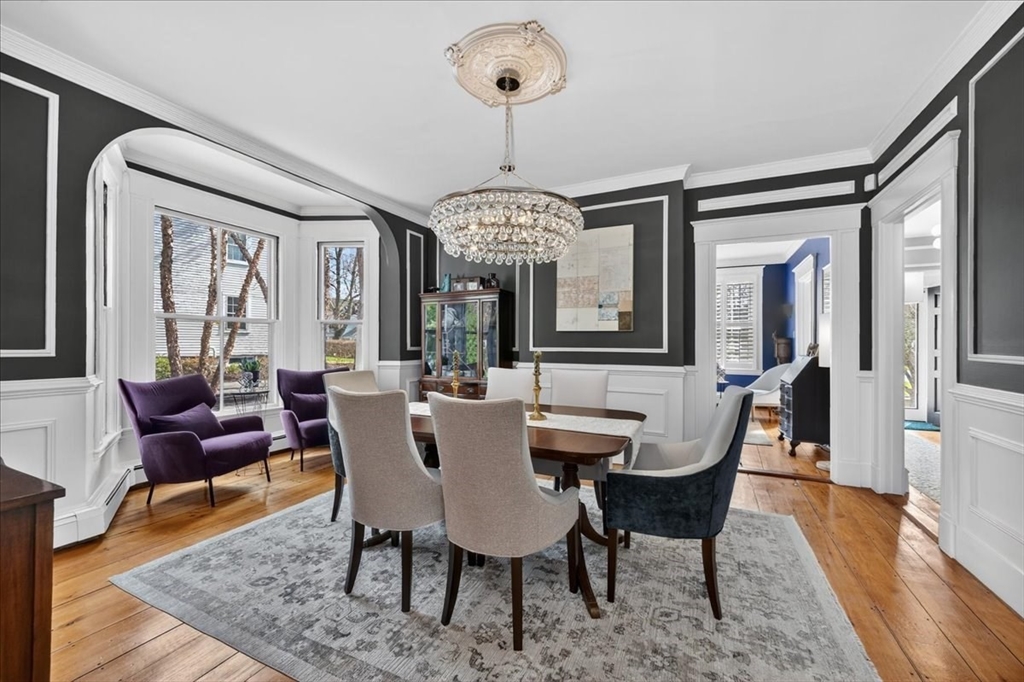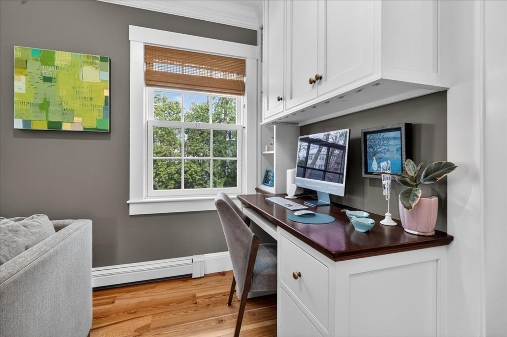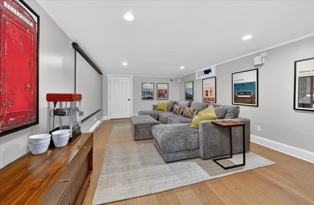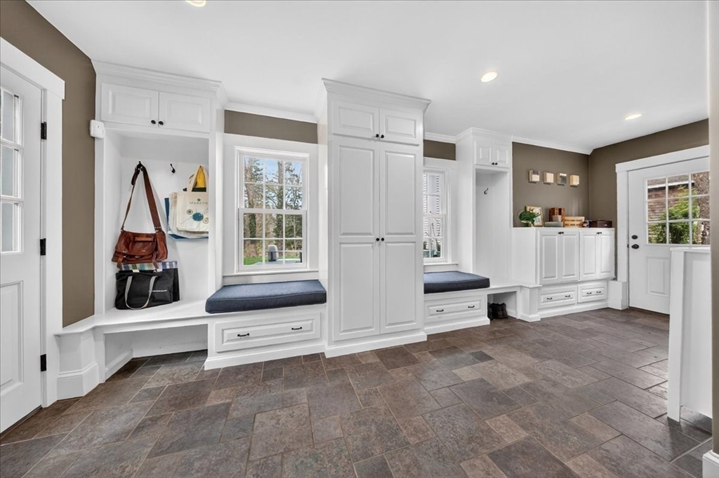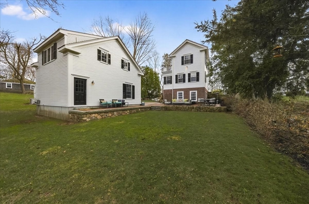 Stylish Colonial home with Carriage House, a stone’s throw from Hingham’s quaint downtown center! Main house boasts 4 bedrooms, 3.5 baths, office (or Guest Bed) & media room. Crown molding and hardwood floors throughout. An open plan chef’s kitchen comes with Thermador appliances- a six gas burner stove top, Sub-Zero fridge & custom cabinetry, leading to an expansive family room with gas fire. Formal dining room with bay window & elegant living room complete this floor. Access the Primary suite through a private hallway, with full bath, walk-in closet, laundry & custom cabinets. Two generous bedrooms and one smaller (or office) also on the 2nd floor. The spacious LL walk-out mud room and office have Buderus radiant heated floors, as do two full baths upstairs. Separate Carriage House includes a new full bath, kitchenette, cathedral ceiling with wooden beams & double garage. A private brick patio overlooks a charming backyard and lawn. Easy access to Boston via commuter ferry/train.