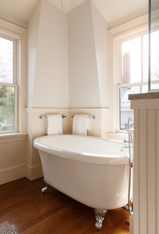 Set on a tree-lined street in Cambridge's Radcliffe, this thoughtfully updated 1890s home blends historic character with modern upgrades, including a high-end kitchen, oak flooring, a fenced patio/yard, and an attached heated garage. With high ceilings throughout, the main level is designed for everyday living, featuring a living room with gas fireplace, a dedicated dining area, and a kitchen finished with Thermador appliances and limestone counters. A powder room and direct access to the garage and backyard complete the floor. Upstairs, the primary ensuite bedroom offers ample closet space and a bath with a double vanity, clawfoot soaking tub & separate shower, and radiant heated floors. Two additional bedrooms share a full bath, and laundry is tucked nearby. The lower level provides flexible space with hardwood floors and natural light—ideal for a family room and office, or studio. Close to Harvard Square, the Red Line, and Mass Ave favorites like Giulia, Barcelona, and Bagelsaurus.