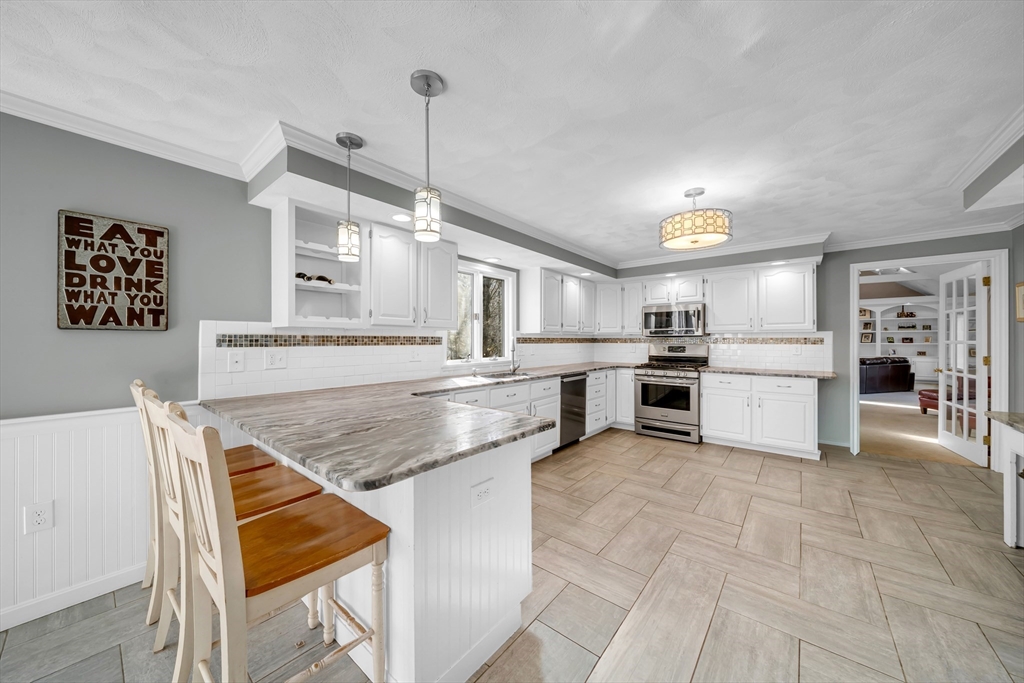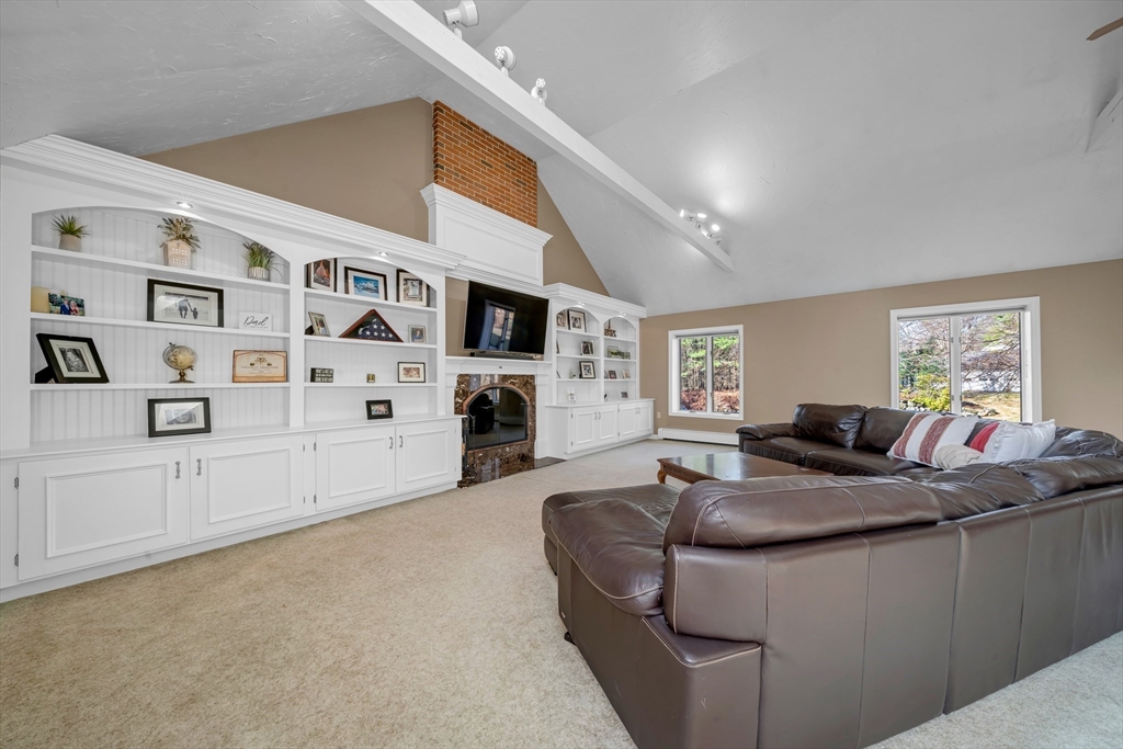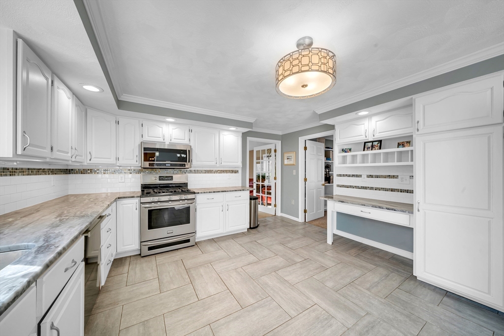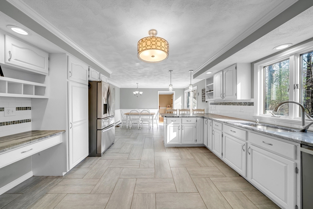 Corner lot, tucked among the trees, this stunning 4+ bedroom, 2.5 bath home offers exceptional comfort and character. The showstopping great room features soaring cathedral ceilings with skylights, exposed beams, a brick fireplace, and custom built-ins. The expansive white kitchen boasts stone countertops, stainless appliances, and a large peninsula with bar seating, flowing seamlessly into the formal dining room and living room both with gleaming hardwood floors and french doors to the deck. The primary suite includes a sitting area, walk-in closet, and private bath with soaking tub and separate shower. Additional bedrooms offer flexibility for guests, a home office, or creative pursuits. Convenient first floor playroom/office. A newer heating system adds peace of mind. Outside, enjoy a paver patio with fire pit and a large deck, all set against a private, wooded backdrop perfect for entertaining. Highly sought after neighborhood with little turnover.