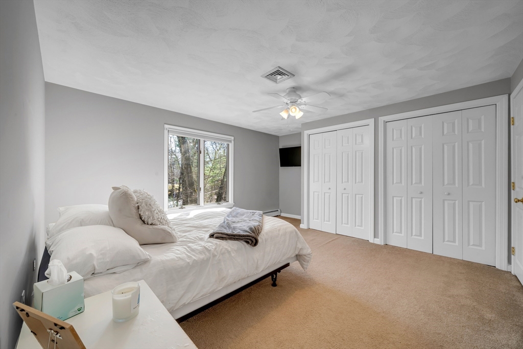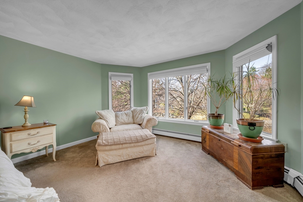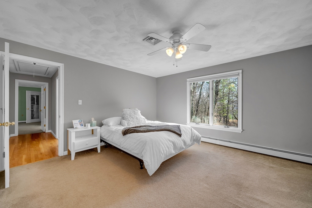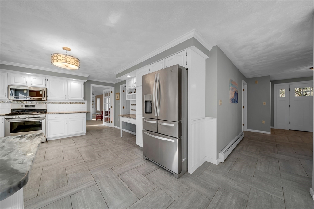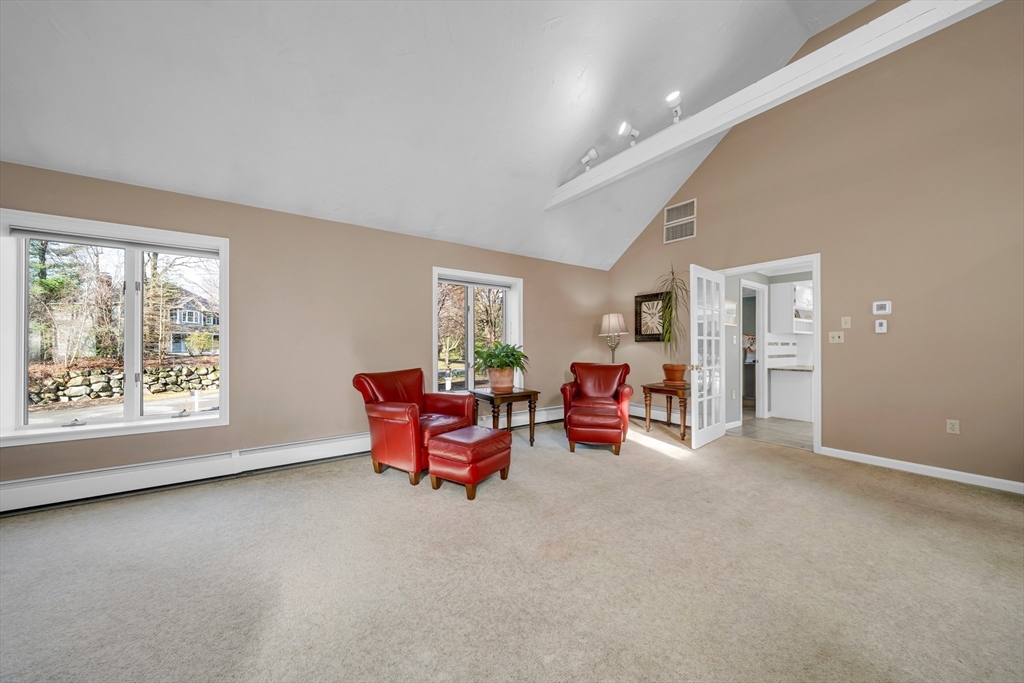 Corner lot, tucked among the trees, this stunning 4+ bedroom, 2.5 bath home offers exceptional comfort and character. The showstopping great room features soaring cathedral ceilings with skylights, exposed beams, a brick fireplace, and custom built-ins. The expansive white kitchen boasts stone countertops, stainless appliances, and a large peninsula with bar seating, flowing seamlessly into the formal dining room and living room both with gleaming hardwood floors and french doors to the deck. The primary suite includes a sitting area, walk-in closet, and private bath with soaking tub and separate shower. Additional bedrooms offer flexibility for guests, a home office, or creative pursuits. Convenient first floor playroom/office. A newer heating system adds peace of mind. Outside, enjoy a paver patio with fire pit and a large deck, all set against a private, wooded backdrop perfect for entertaining. Highly sought after neighborhood with little turnover.