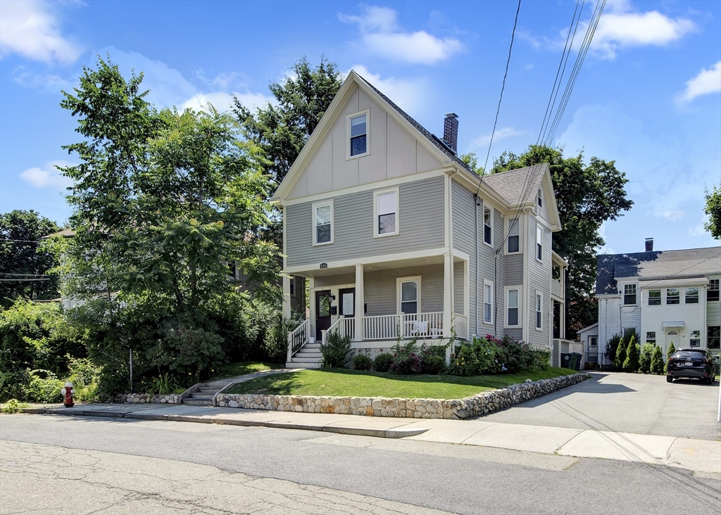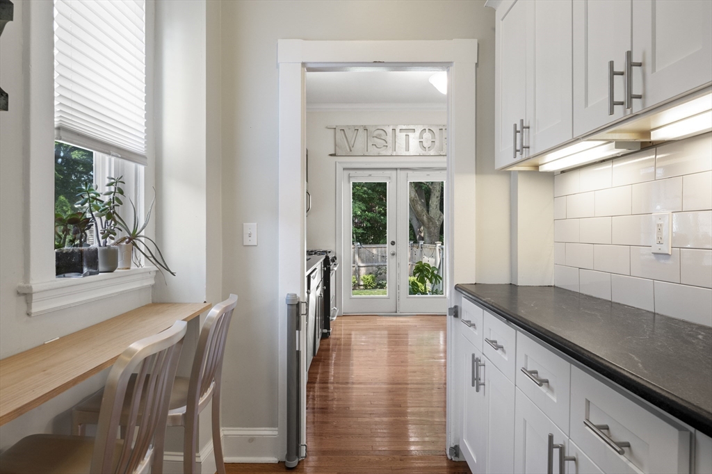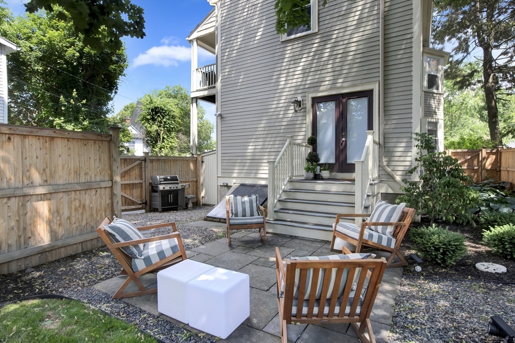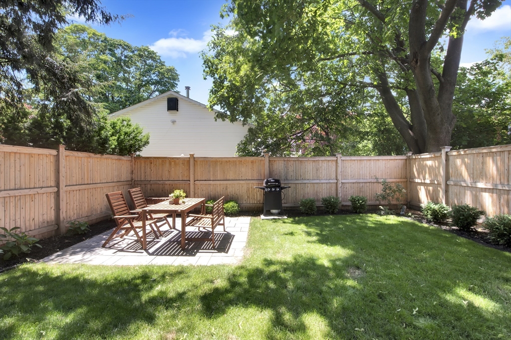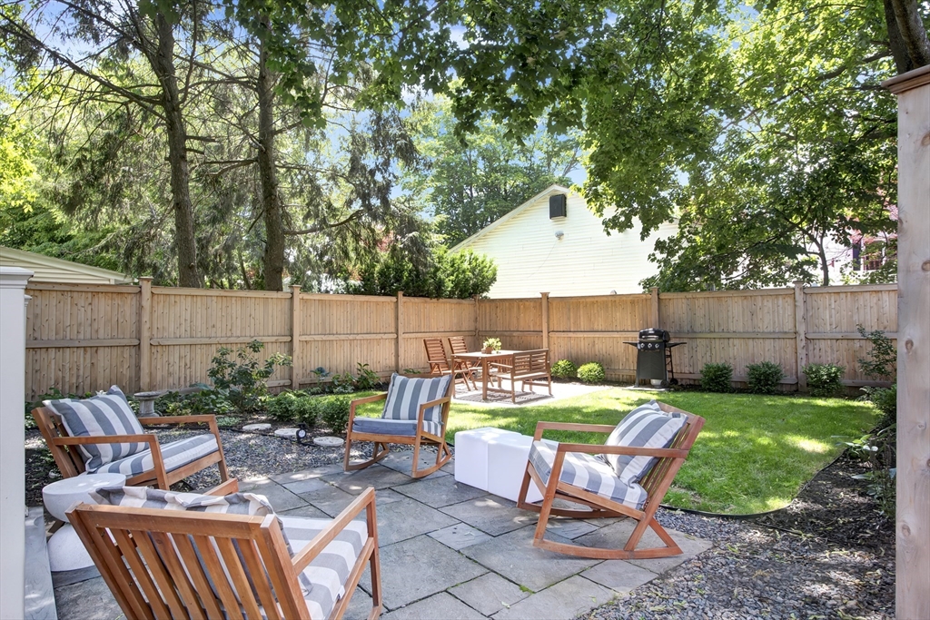 This exceptional two bedroom, two bath condominium blends timeless character with thoughtful updates, offering a refined and comfortable living experience. The living room is framed by elegant crown molding and soaring ceilings, creating a warm and sophisticated setting for both everyday living and entertaining. The eat in kitchen is beautifully appointed with stone countertops, a tasteful backsplash, and wood cabinetry. Both bedrooms offer a sense of calm retreat. The primary bedroom boasts an ensuite bath with double sinks and a walk in closet. Additional highlights include four tandem parking spaces along with a private patio perfect for outdoor relaxation and access to a shared garden that extends the green space. Ideally situated in a convenient and highly desirable location, close to the Mass Pike, Newtonville Commuter stop, shopping and restaurants. This home offers easy access to local amenities, dining, and everyday essentials, making it as practical as it is inviting.