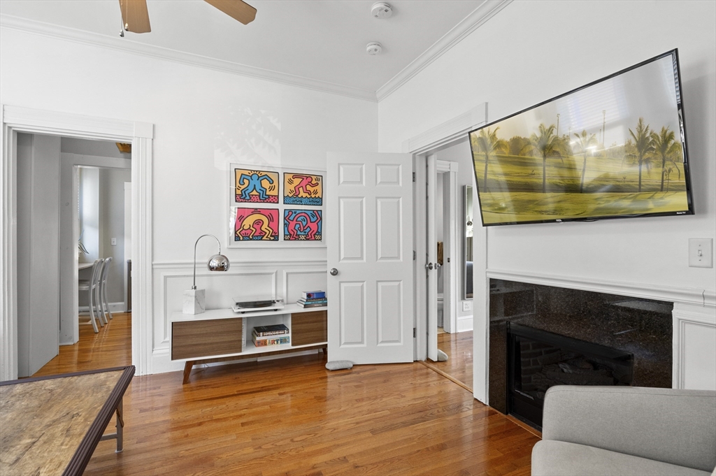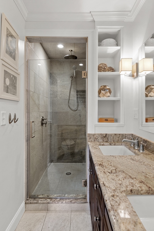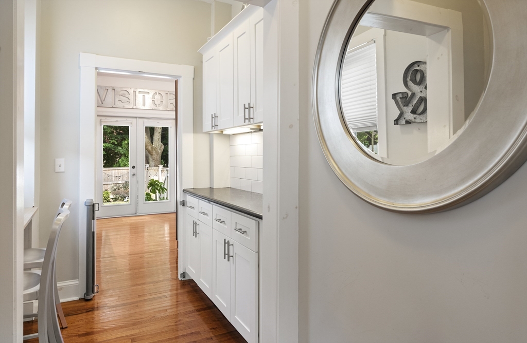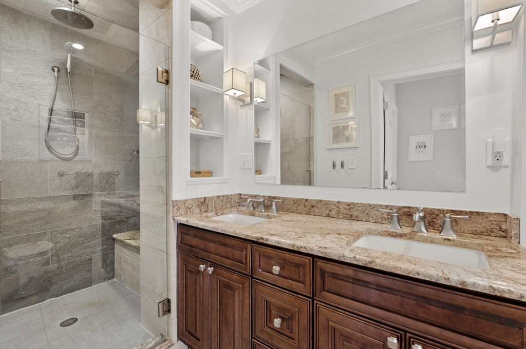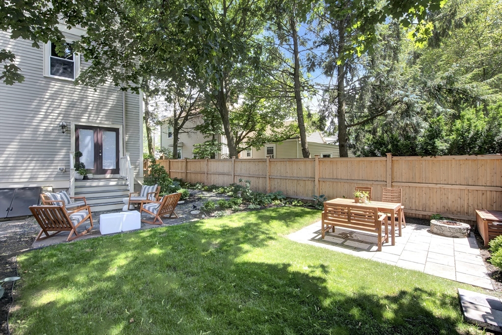 This exceptional two bedroom, two bath condominium blends timeless character with thoughtful updates, offering a refined and comfortable living experience. The living room is framed by elegant crown molding and soaring ceilings, creating a warm and sophisticated setting for both everyday living and entertaining. The eat in kitchen is beautifully appointed with stone countertops, a tasteful backsplash, and wood cabinetry. Both bedrooms offer a sense of calm retreat. The primary bedroom boasts an ensuite bath with double sinks and a walk in closet. Additional highlights include four tandem parking spaces along with a private patio perfect for outdoor relaxation and access to a shared garden that extends the green space. Ideally situated in a convenient and highly desirable location, close to the Mass Pike, Newtonville Commuter stop, shopping and restaurants. This home offers easy access to local amenities, dining, and everyday essentials, making it as practical as it is inviting.