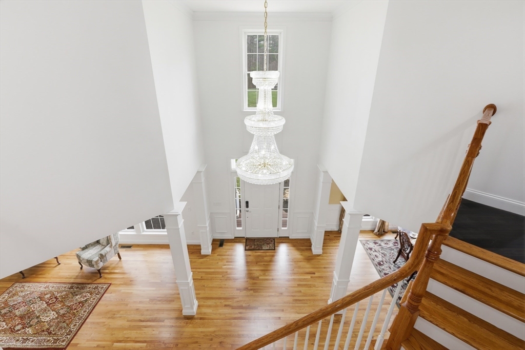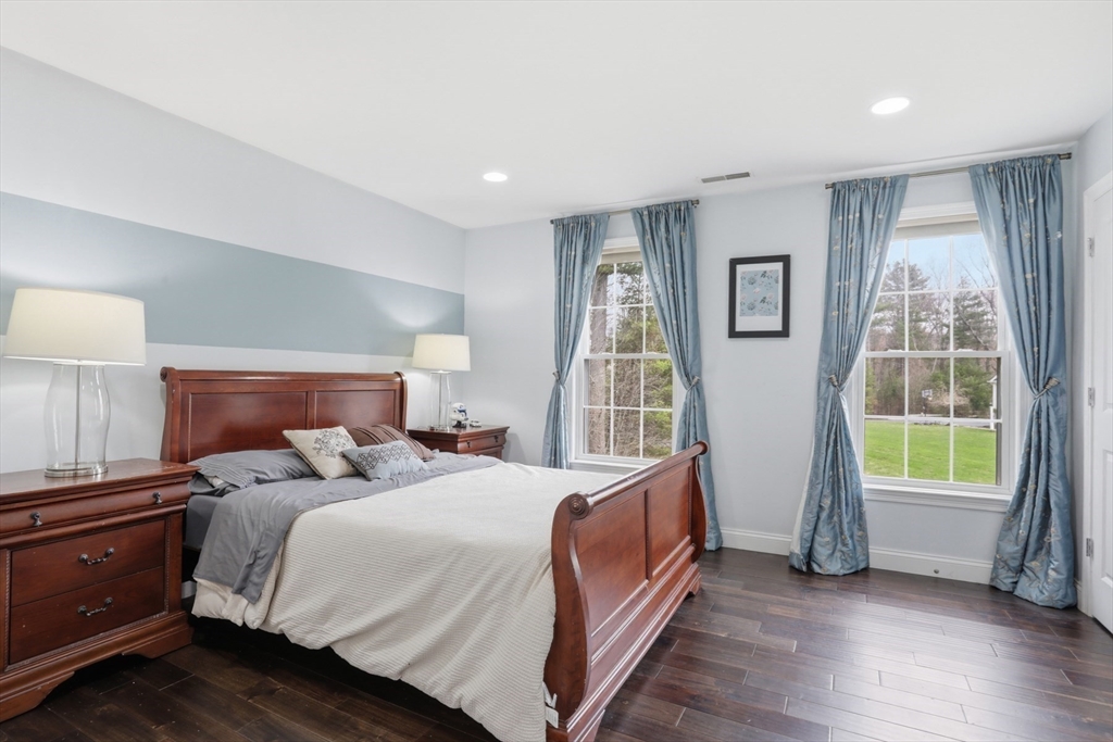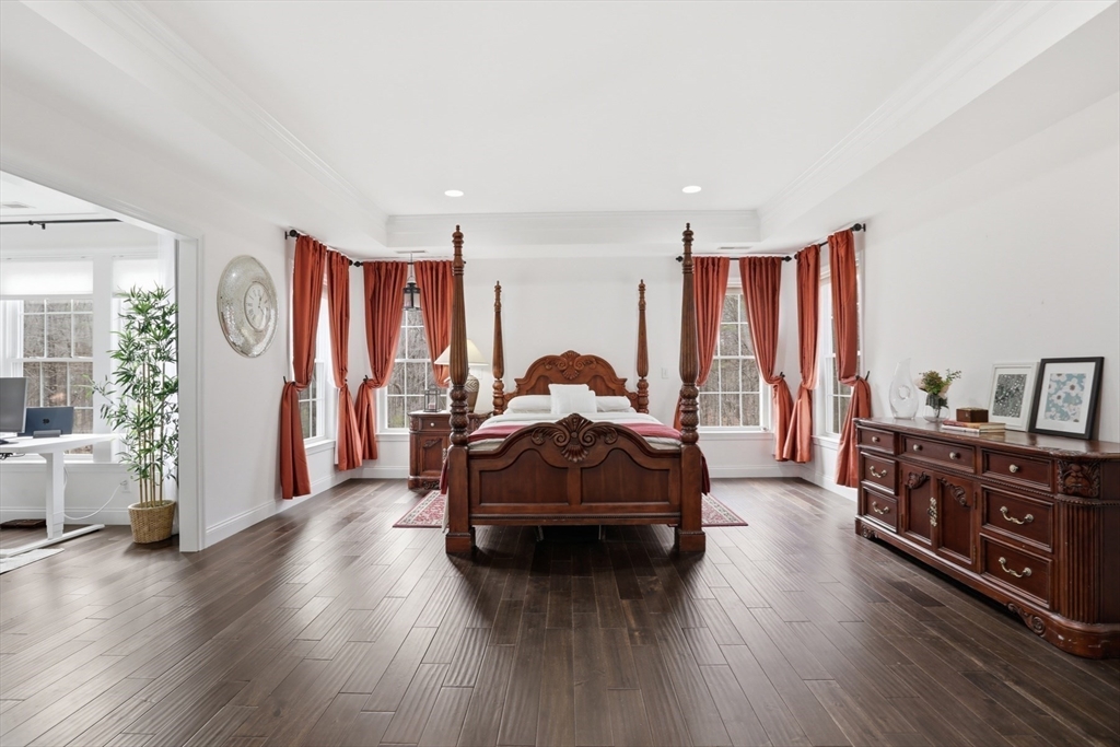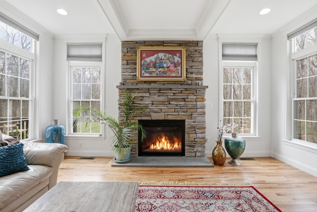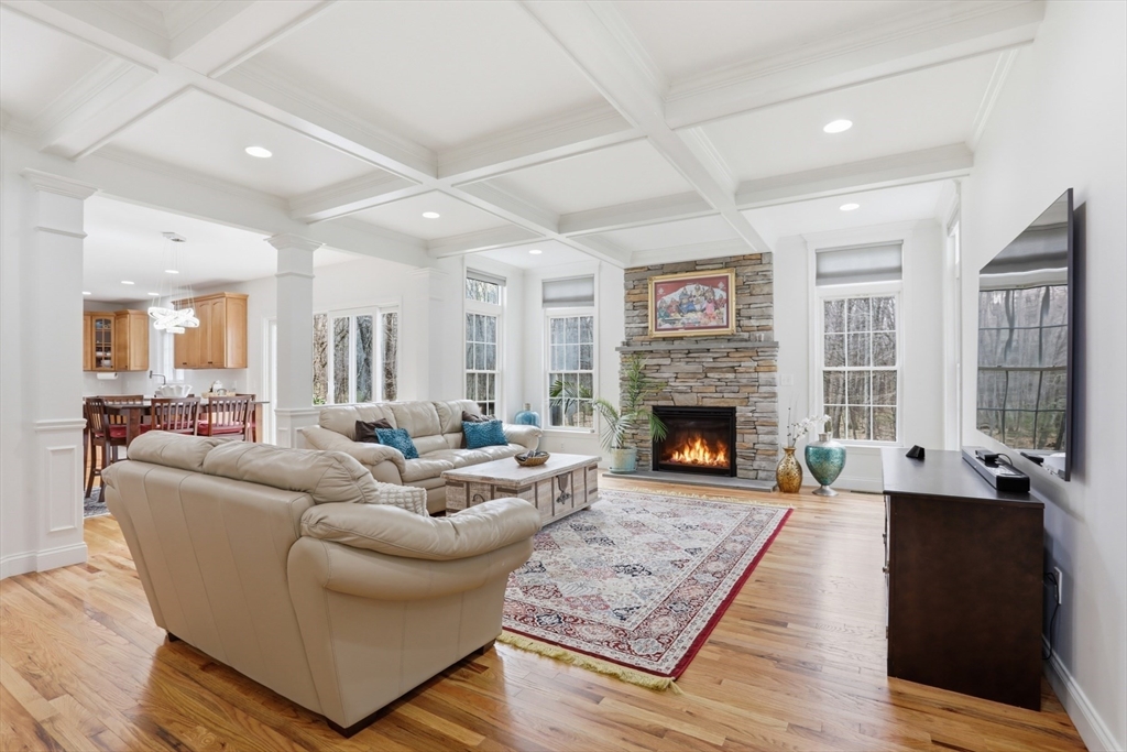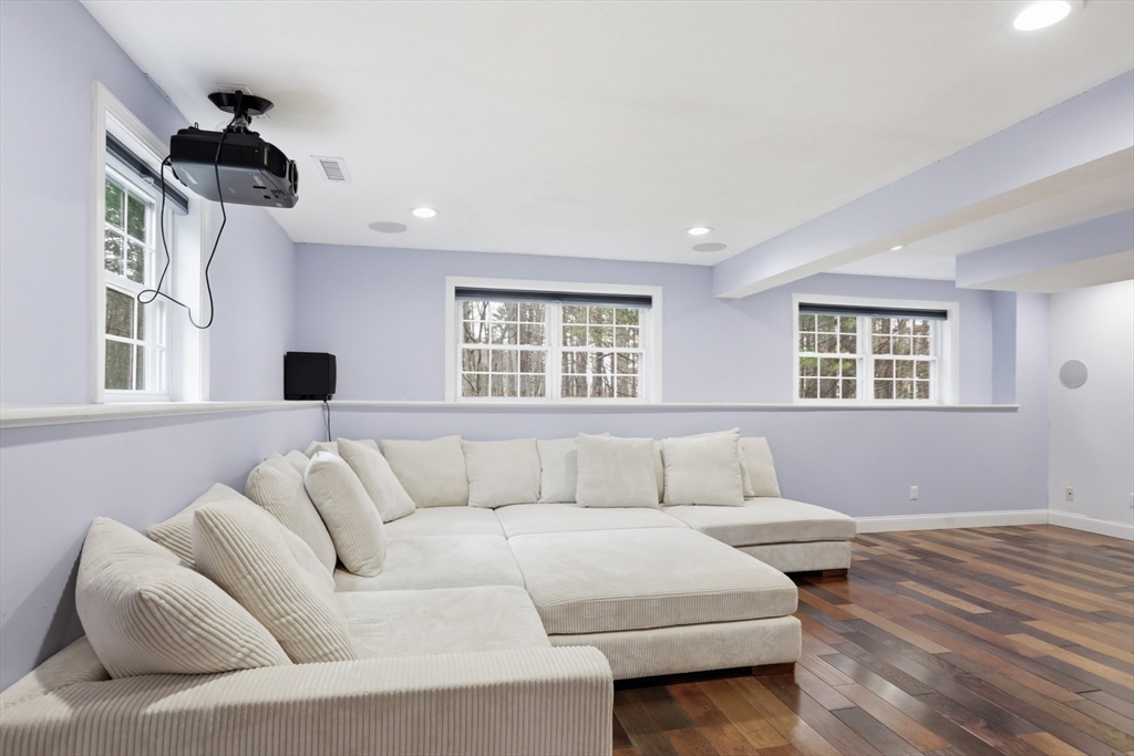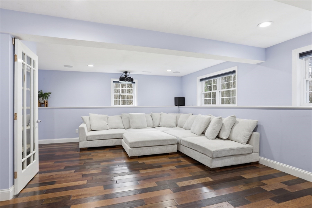 Set back from the main road, this stately Robbins Mill Colonial stands proud on one of the best lots in the neighborhood abutting conservation land and with lawn enough for field sports plus a future pool. A dramatic two-story foyer with an elegant crystal chandelier welcomes you to this open floor plan with flexible spaces. The gourmet kitchen impresses with a large island, quartz countertops and backsplash, and an easy flow into back yard or the family room with its stone fireplace and coffered ceiling. Dedicated entertaining and office space, plus a 1st floor bonus room for work, play or hobbies complete the 1st floor. Upstairs, the primary suite offers generous closet space, a spa-like bath, and sitting area or extra office, plus there are 3 additional bedrooms with ensuite or shared bath. The lower level adds 2,500+ SF including a theater room, Bose sound, ¾ bath, and potential for a home gym or in-law suite. Fresh paint, updated counters & faucets, plus owned solar panels.