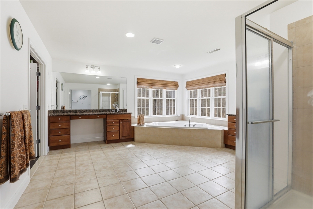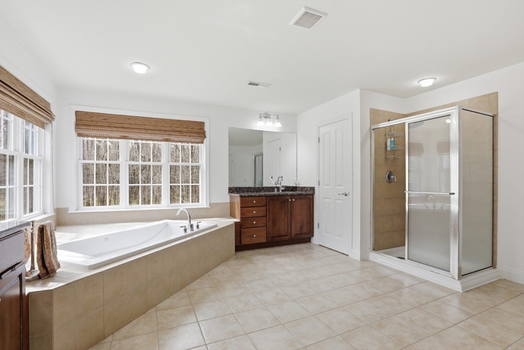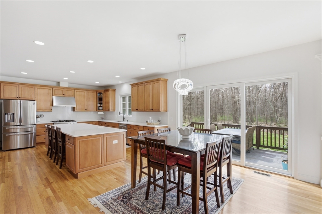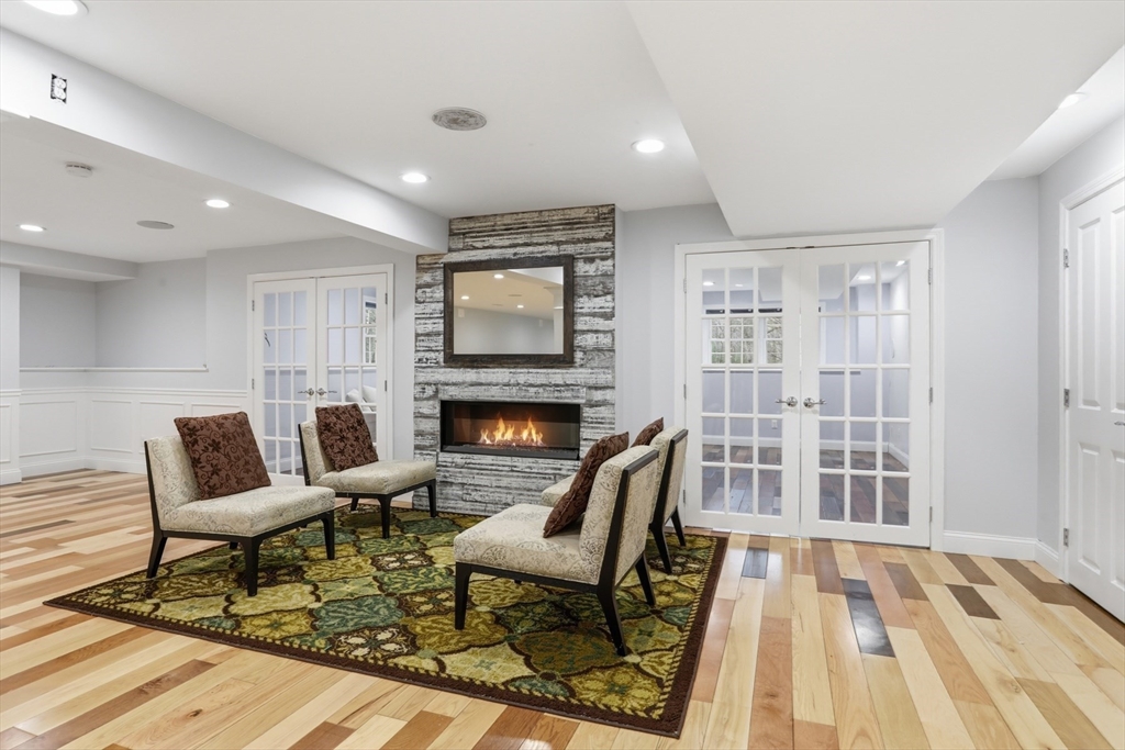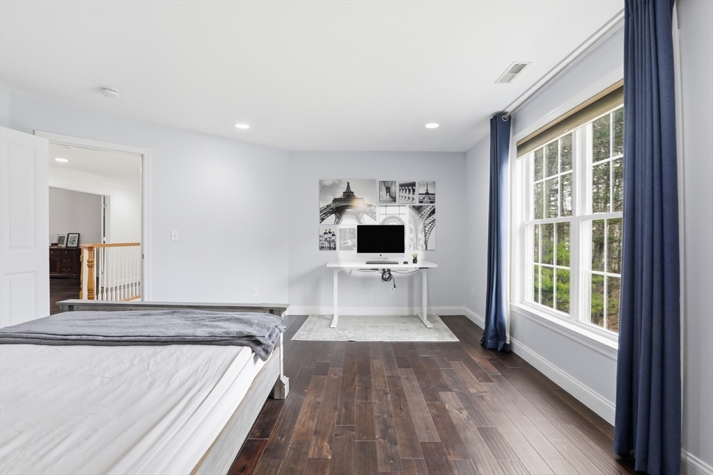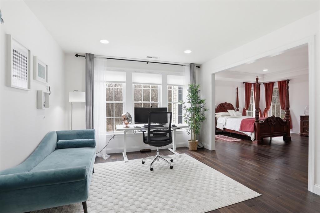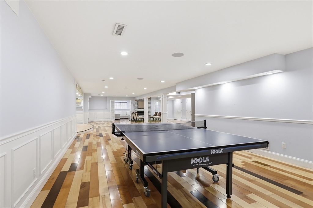 Set back from the main road, this stately Robbins Mill Colonial stands proud on one of the best lots in the neighborhood abutting conservation land and with lawn enough for field sports plus a future pool. A dramatic two-story foyer with an elegant crystal chandelier welcomes you to this open floor plan with flexible spaces. The gourmet kitchen impresses with a large island, quartz countertops and backsplash, and an easy flow into back yard or the family room with its stone fireplace and coffered ceiling. Dedicated entertaining and office space, plus a 1st floor bonus room for work, play or hobbies complete the 1st floor. Upstairs, the primary suite offers generous closet space, a spa-like bath, and sitting area or extra office, plus there are 3 additional bedrooms with ensuite or shared bath. The lower level adds 2,500+ SF including a theater room, Bose sound, ¾ bath, and potential for a home gym or in-law suite. Fresh paint, updated counters & faucets, plus owned solar panels.