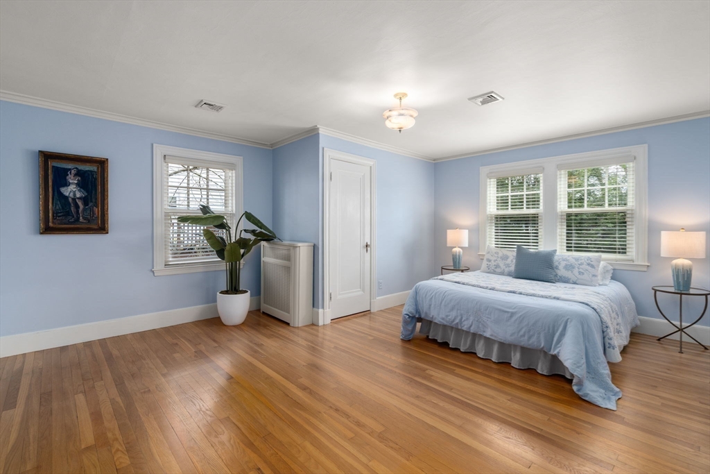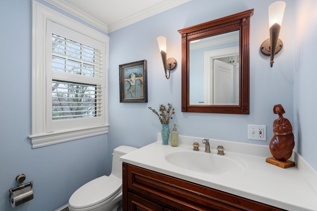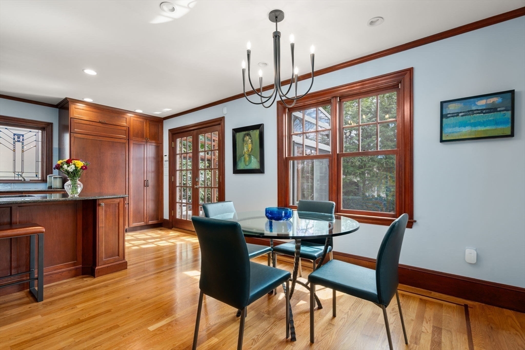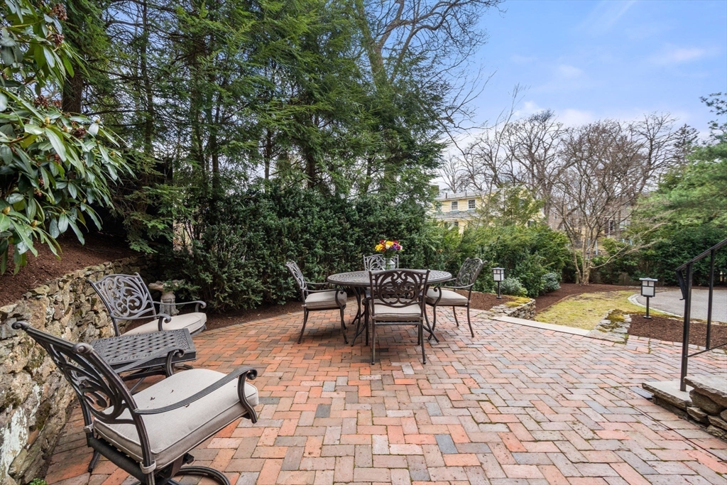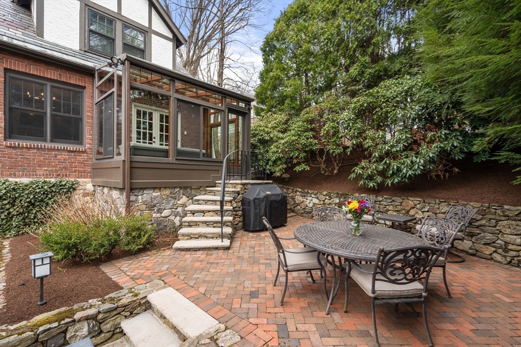 On a picturesque street in Newton Centre, this Tudor Revival blends timeless charm with modern amenities in a sought after neighborhood. The gabled front entrance reveals a welcoming foyer, graceful staircase and views of the front-to-back living room with a manor-style fireplace and beamed ceiling. French doors lead to a bright office with built-ins and outdoor terrace. 3/4 wainscoting and leaded-glass windows frame the elegant dining room, perfect for entertaining. In the architect-designed kitchen find custom cabinets, high-end appliances, a dining area and an attached sunroom with views of the private backyard and patio. Follow the spacious 2nd floor landing to a tranquil primary suite with modern bath and walk-in closets plus 2 more bedrooms and updated bath. Versatile skylit 3rd floor bedroom suite with full bath and walk-in-closet. The LL family room has custom built-ins, sound system plus a bath and mudroom. Mason-Rice district near City Hall, Library, Bulloughs Pond and more!