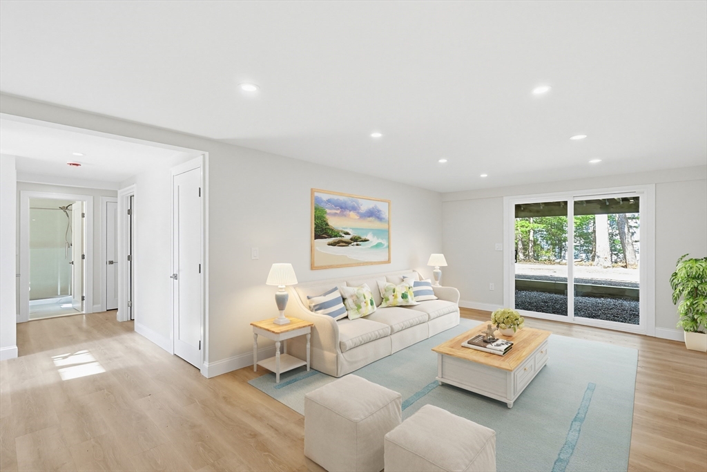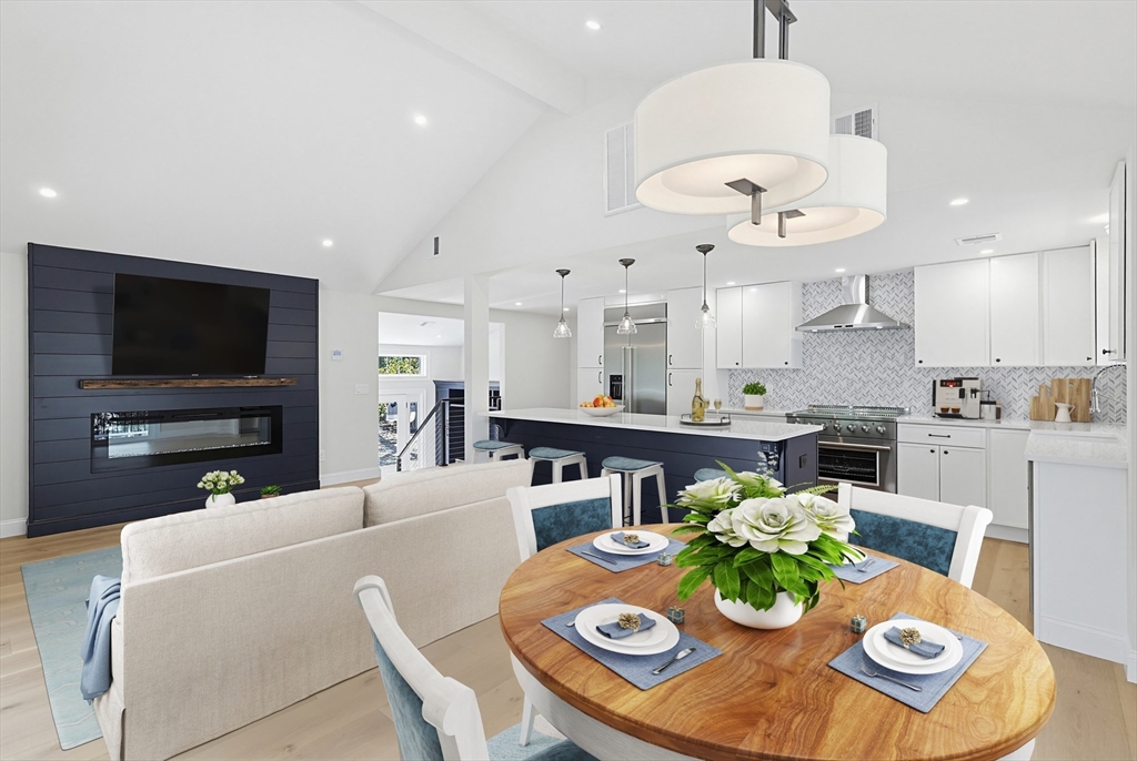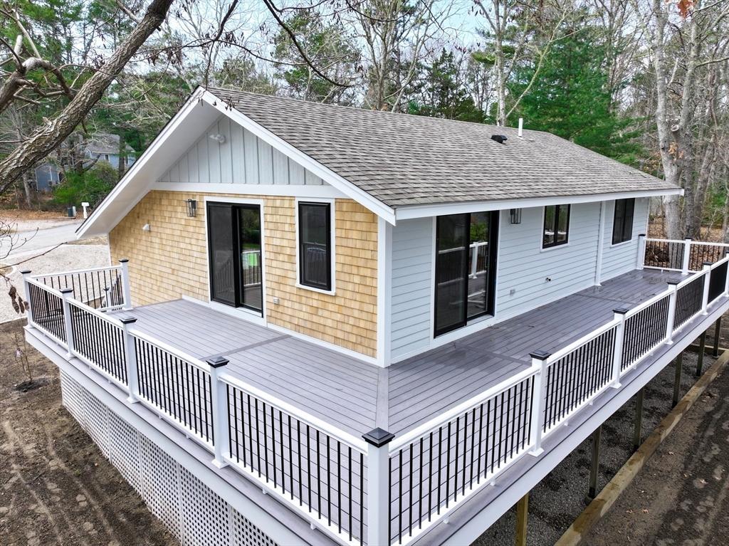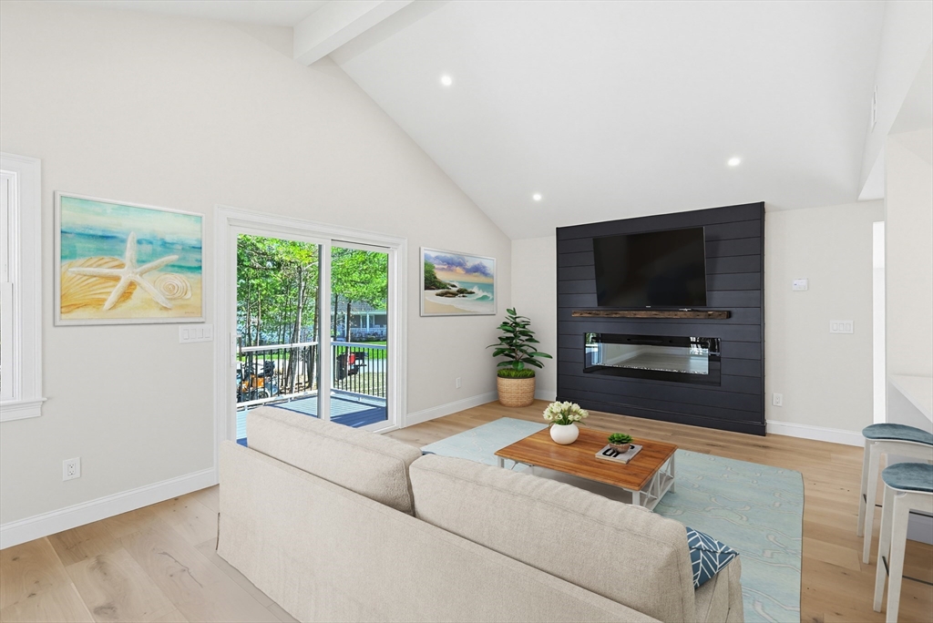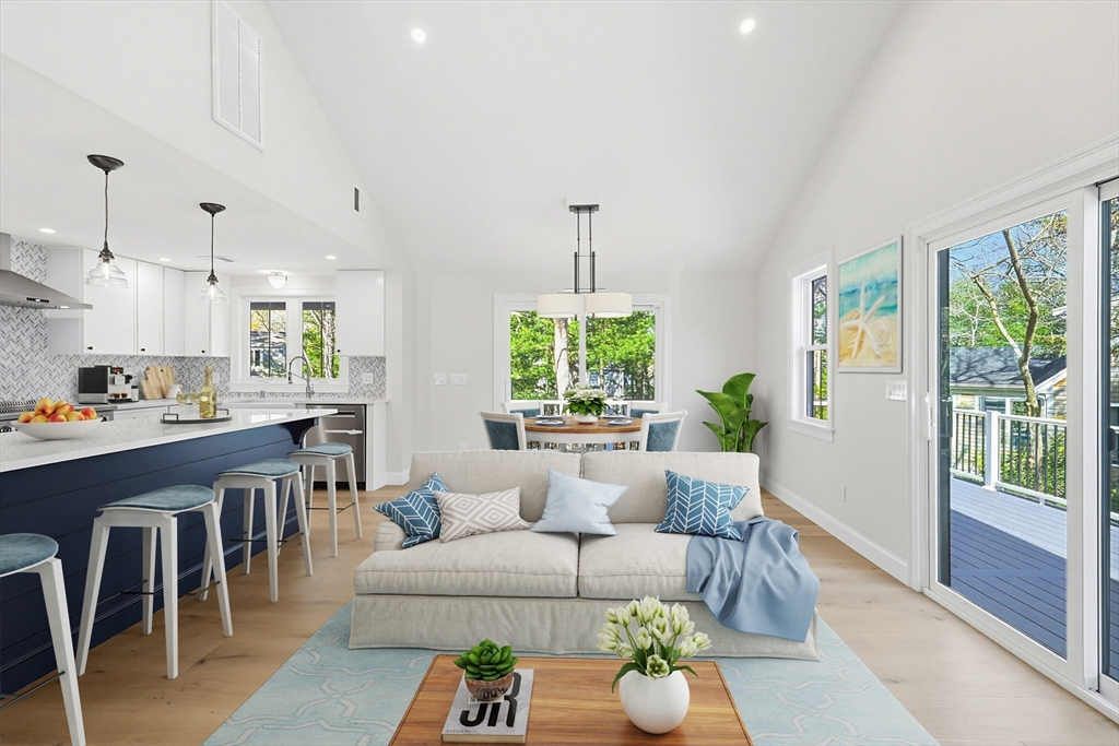 Impeccable renovations are complete on this stunning modern/contemporary New Seabury gem. Distinctive craftsmanship shines throughout, including a custom mudroom w/ built-ins, reclaimed wood, & a matching accent wall w/ a sleek built-in electric FP for a warm focal point. Designer kitchen features white cabinetry, quartz countertops, reclaimed glass backsplash, high-end SS appliances, and an oversized island. An open floor plan w/ cathedral ceilings makes living/dining effortless, with glass sliders leading to an expansive wraparound deck. 9.5" White Oak hdwd floors extend to the primary suite, offering a custom closet system & upscale private bath. A well-placed laundry/half bath connects both levels.The LL provides ideal privacy w/ a separate living room, 2 bedrooms, stunning full bath, & walk-out slider. Cable railings, high-efficiency heat pump sys, plus DEEDED beach rights to Fells Pond! New S. amenities avail w/membership including golf, priv beach/club, fitness center & more!