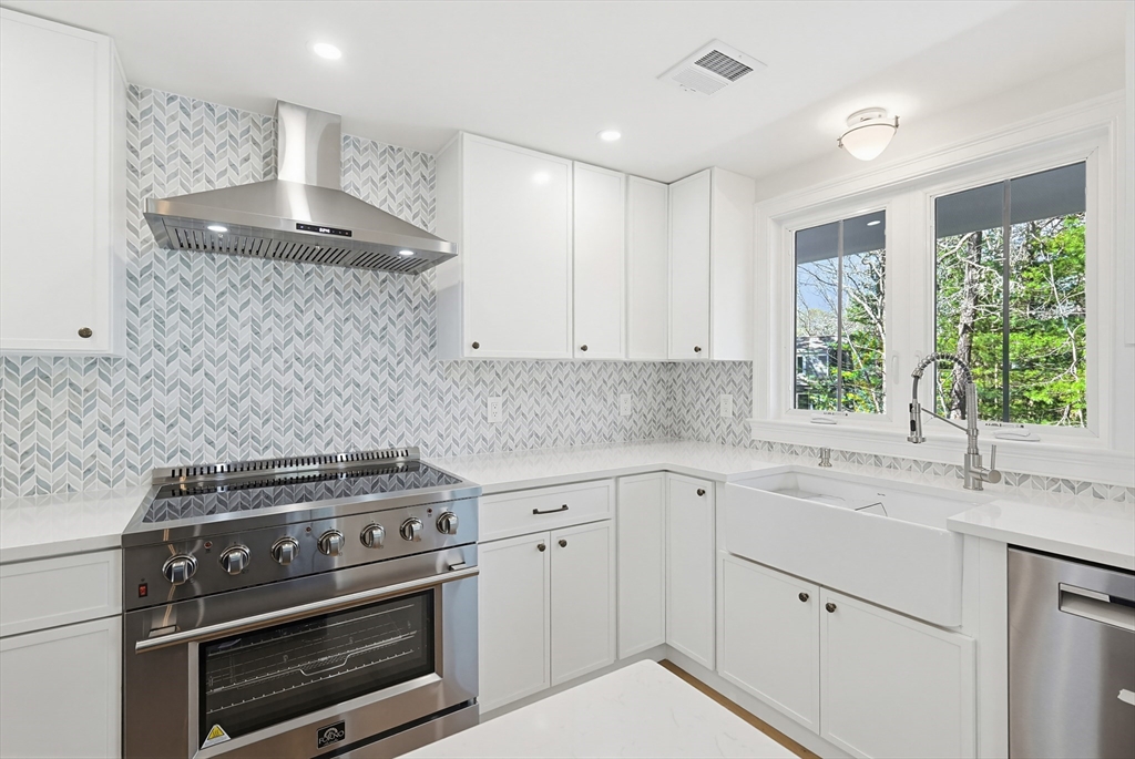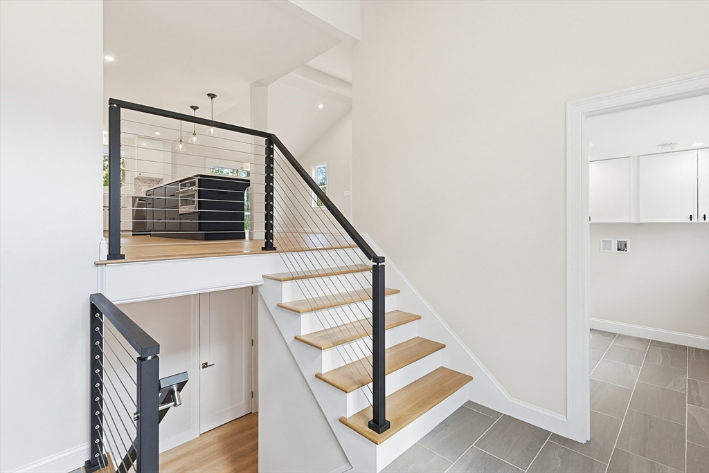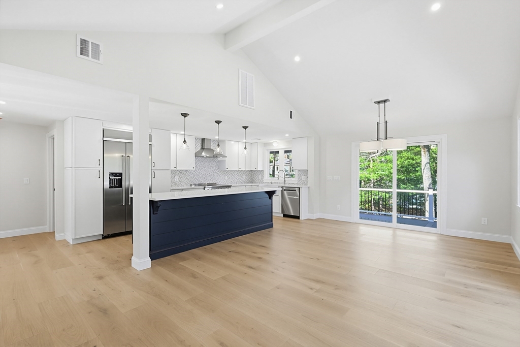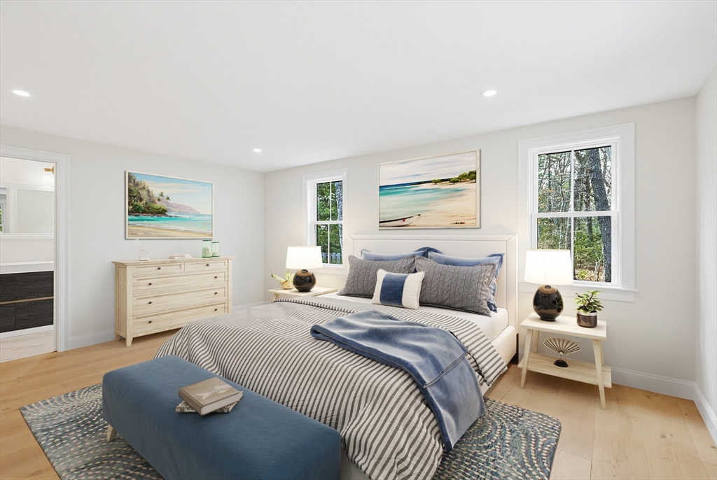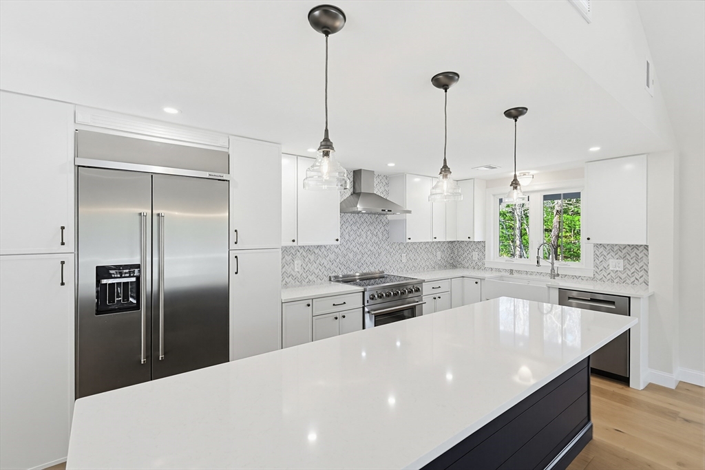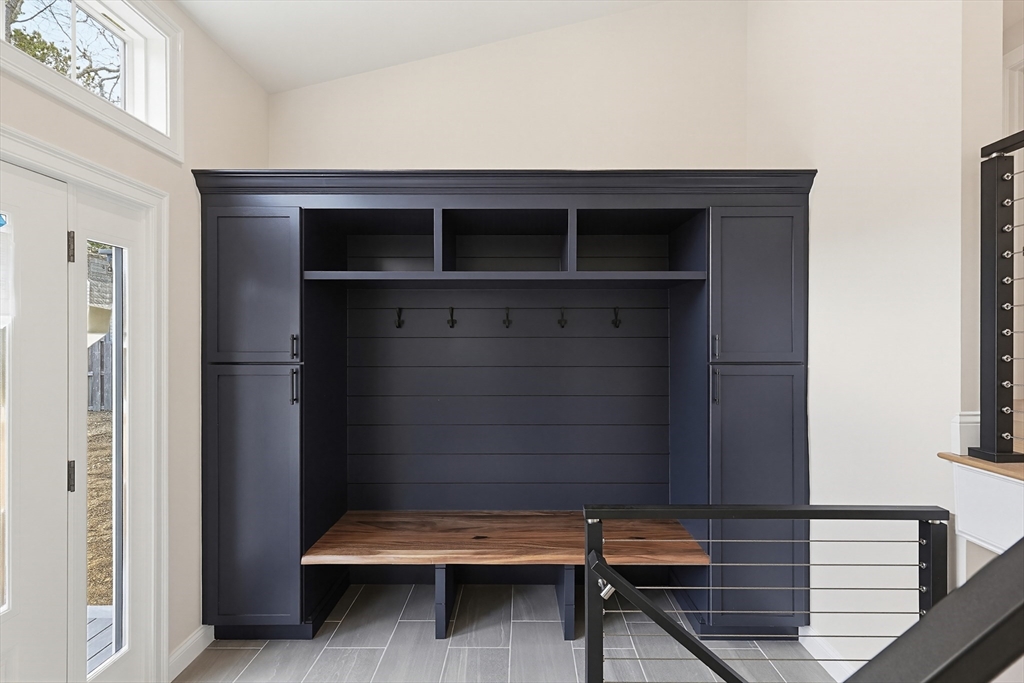 Impeccable renovations are complete on this stunning modern/contemporary New Seabury gem. Distinctive craftsmanship shines throughout, including a custom mudroom w/ built-ins, reclaimed wood, & a matching accent wall w/ a sleek built-in electric FP for a warm focal point. Designer kitchen features white cabinetry, quartz countertops, reclaimed glass backsplash, high-end SS appliances, and an oversized island. An open floor plan w/ cathedral ceilings makes living/dining effortless, with glass sliders leading to an expansive wraparound deck. 9.5" White Oak hdwd floors extend to the primary suite, offering a custom closet system & upscale private bath. A well-placed laundry/half bath connects both levels.The LL provides ideal privacy w/ a separate living room, 2 bedrooms, stunning full bath, & walk-out slider. Cable railings, high-efficiency heat pump sys, plus DEEDED beach rights to Fells Pond! New S. amenities avail w/membership including golf, priv beach/club, fitness center & more!