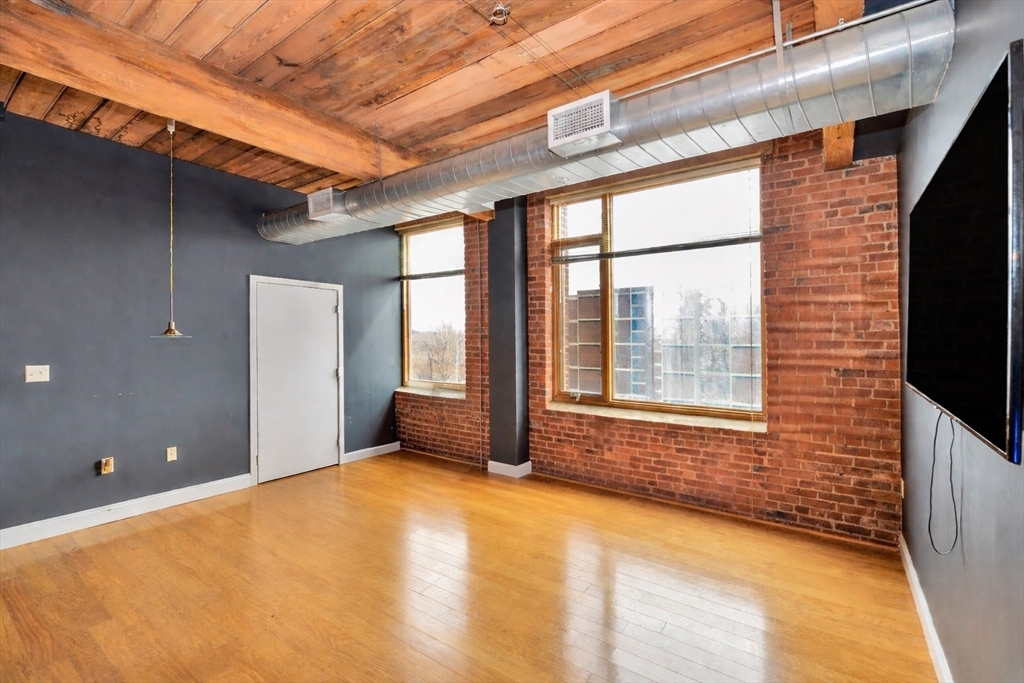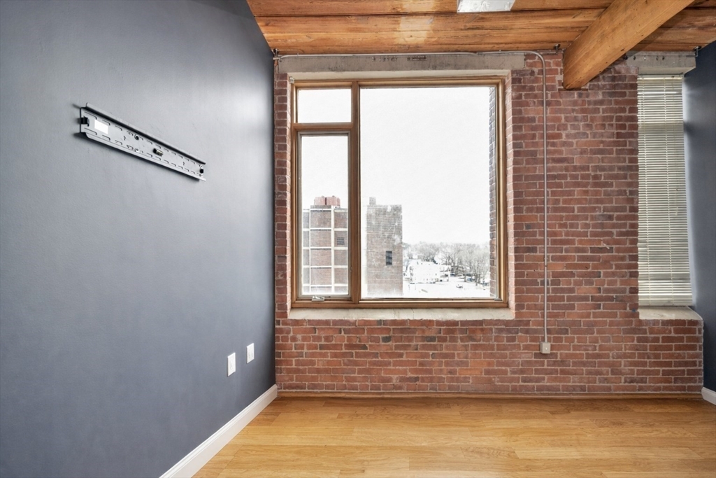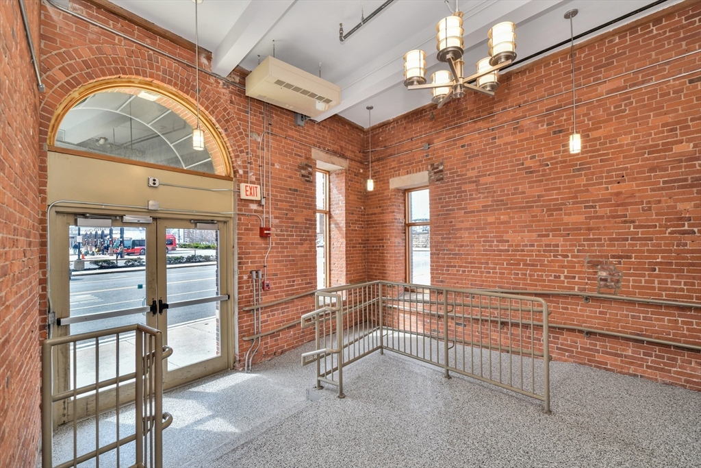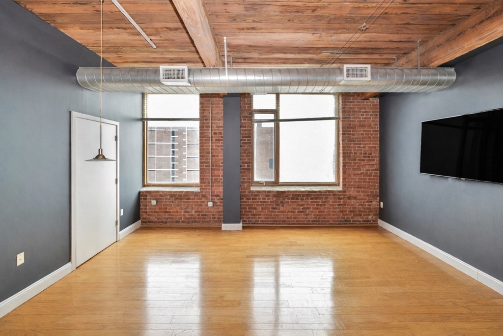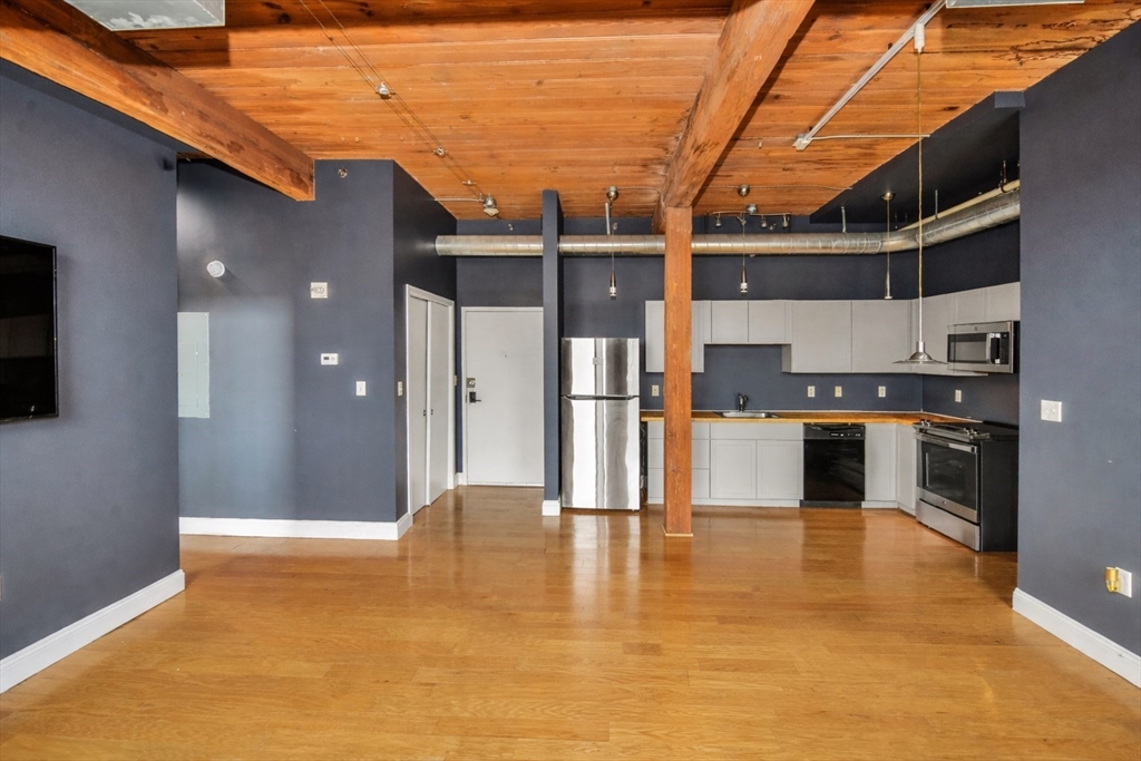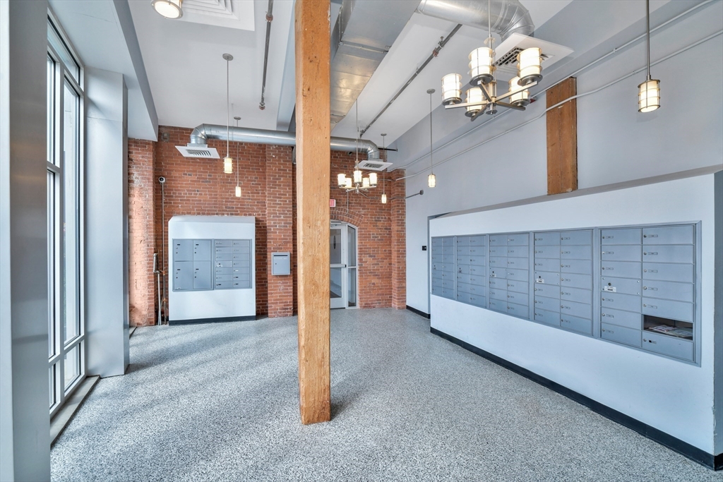 Beautifully updated 2BR/2BA Industrial Loft. Soaring 13-foot wood beam ceilings, exposed brick walls, and oversized windows flood the space with natural light, creating an airy, gallery-like atmosphere that perfectly balances industrial character with contemporary comfort. Updated kitchen with finished butcher block countertops, stainless steel appliances, laminate flooring, and contemporary paint. Modernized bathrooms featuring vanity with granite countertops, mirrors with integrated lights and elongated smart toilets. In-unit laundry. Sixth-floor location directly across from Brockton MBTA Station and BAT Bus Terminal—ideal for commuters. Building amenities include fitness center, club room, secure parking, and storage. Pet-friendly (1 pet under 40 lbs). Professional management, elevators.