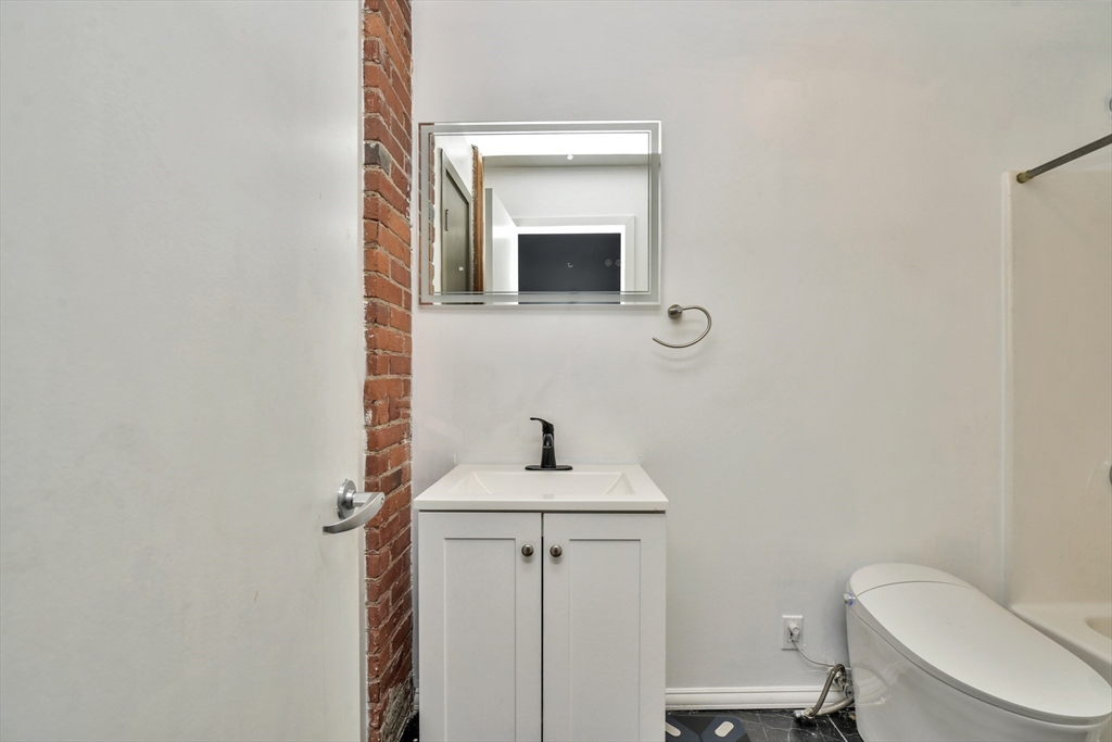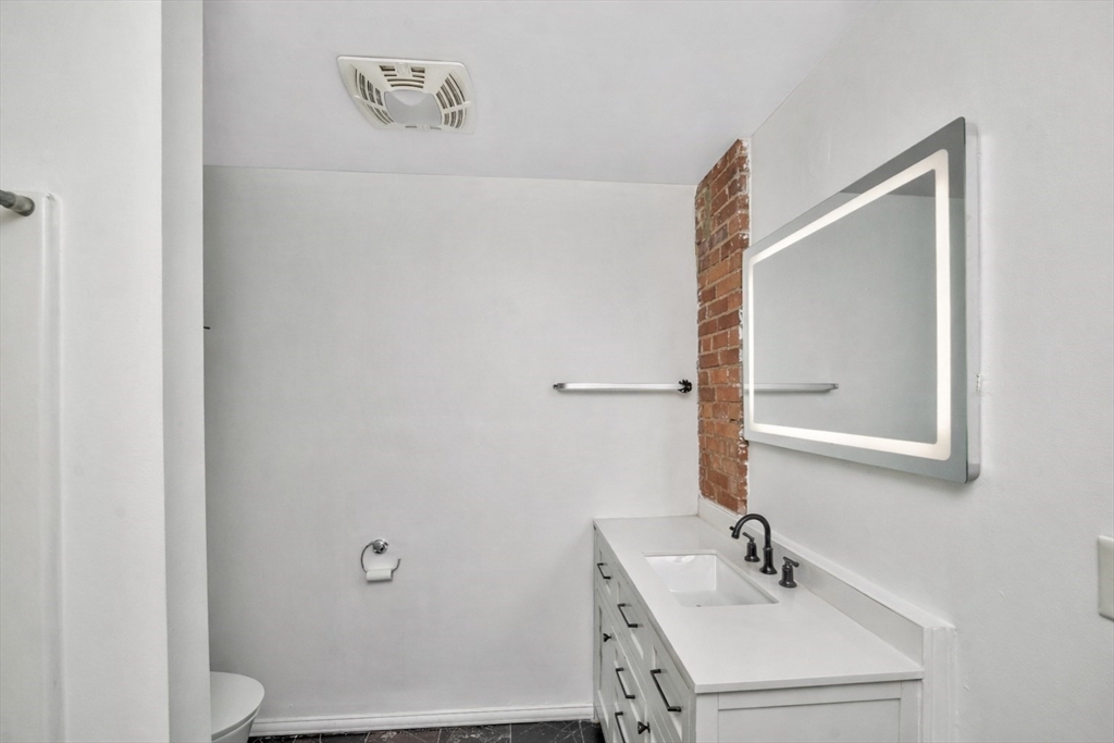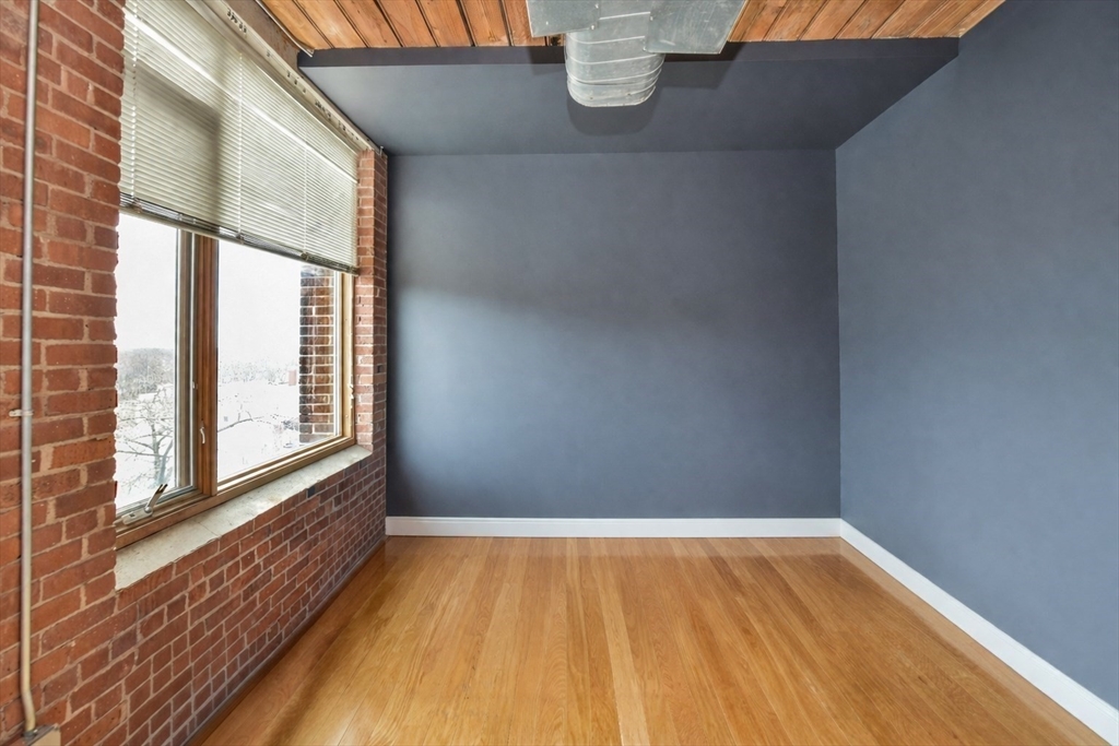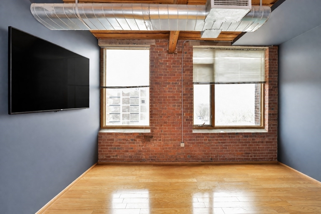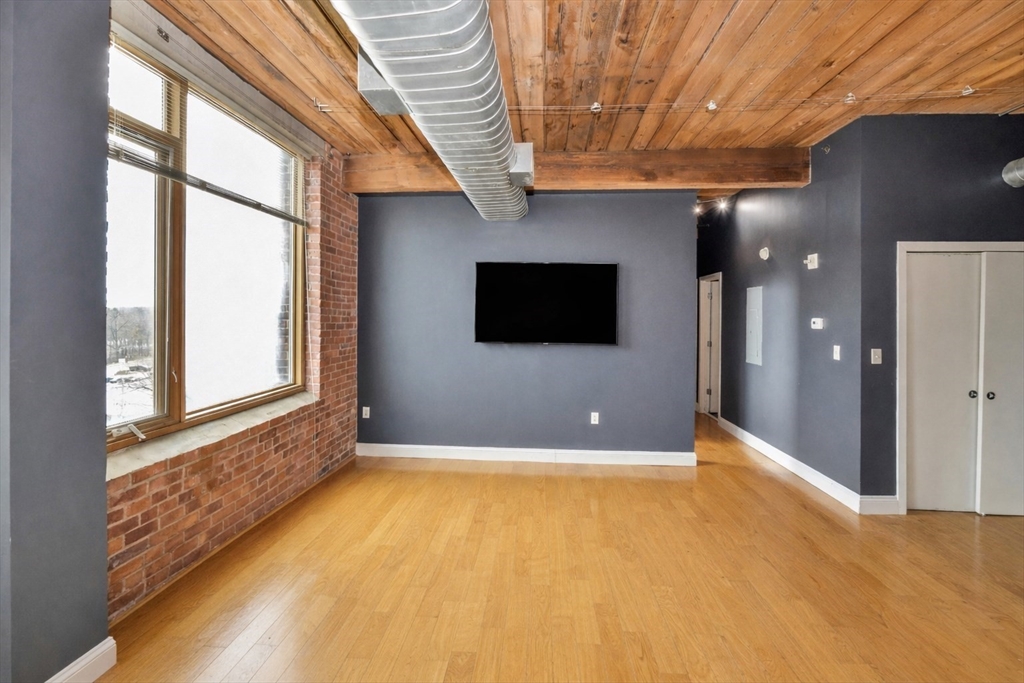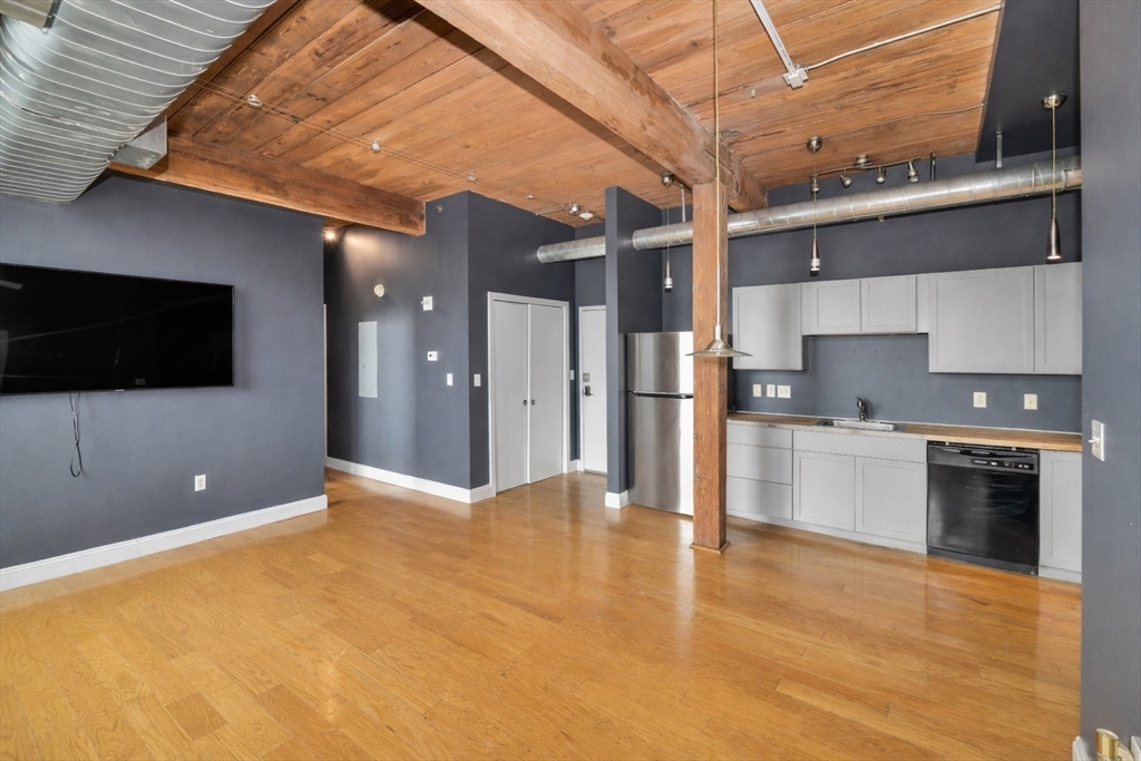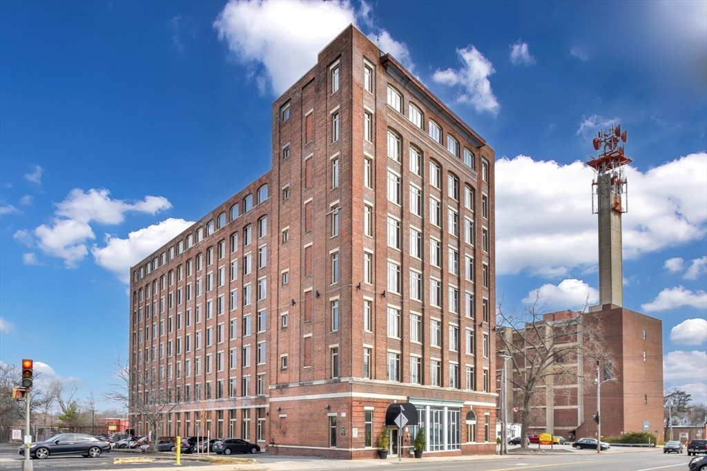 Beautifully updated 2BR/2BA Industrial Loft. Soaring 13-foot wood beam ceilings, exposed brick walls, and oversized windows flood the space with natural light, creating an airy, gallery-like atmosphere that perfectly balances industrial character with contemporary comfort. Updated kitchen with finished butcher block countertops, stainless steel appliances, laminate flooring, and contemporary paint. Modernized bathrooms featuring vanity with granite countertops, mirrors with integrated lights and elongated smart toilets. In-unit laundry. Sixth-floor location directly across from Brockton MBTA Station and BAT Bus Terminal—ideal for commuters. Building amenities include fitness center, club room, secure parking, and storage. Pet-friendly (1 pet under 40 lbs). Professional management, elevators.