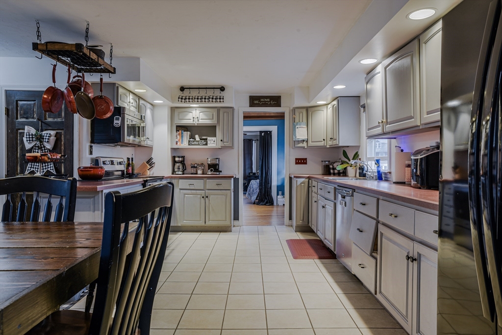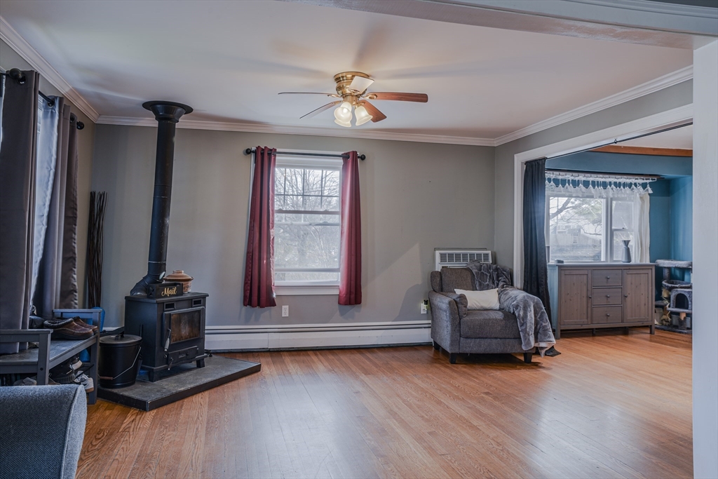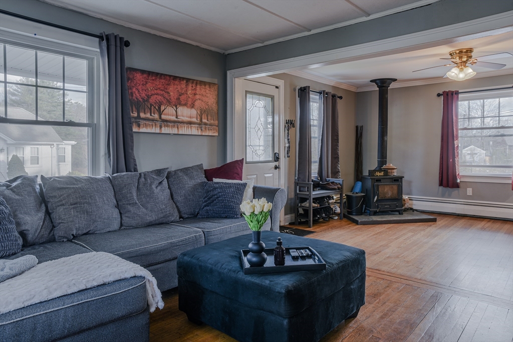 Spacious and Versatile! This 4-bedroom converted from a 5 bedroom offers a versatile floor plan with the option of having a 1st floor primary suite or the option of having an extended family suite which includes it's own private entrance and porch area, living area, large bedroom and full bathroom. The main home also has a front porch entry and large kitchen has plenty of counter/cabinet space, peninsula island, stainless appliances and tiled floor. Living room offers a newer wood stove and is open to the cathedral ceiling dining room and stairway to the 2nd level where you will find two bedrooms and another room which could be used for a playroom, office or another closet. This home is conveniently located just minutes to the highway, commuter rail and shopping all while being tucked away on a nice side street location! Updates include a high efficiency gas heating system (converted from oil heat), attic insulation, luxury vinyl flooring, water tank, & wood stove