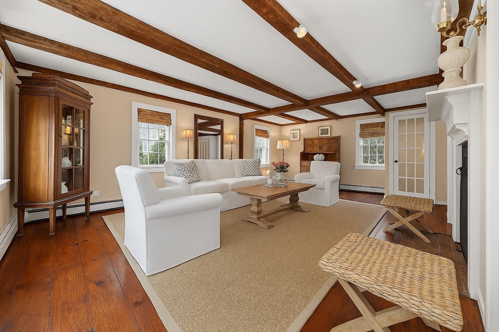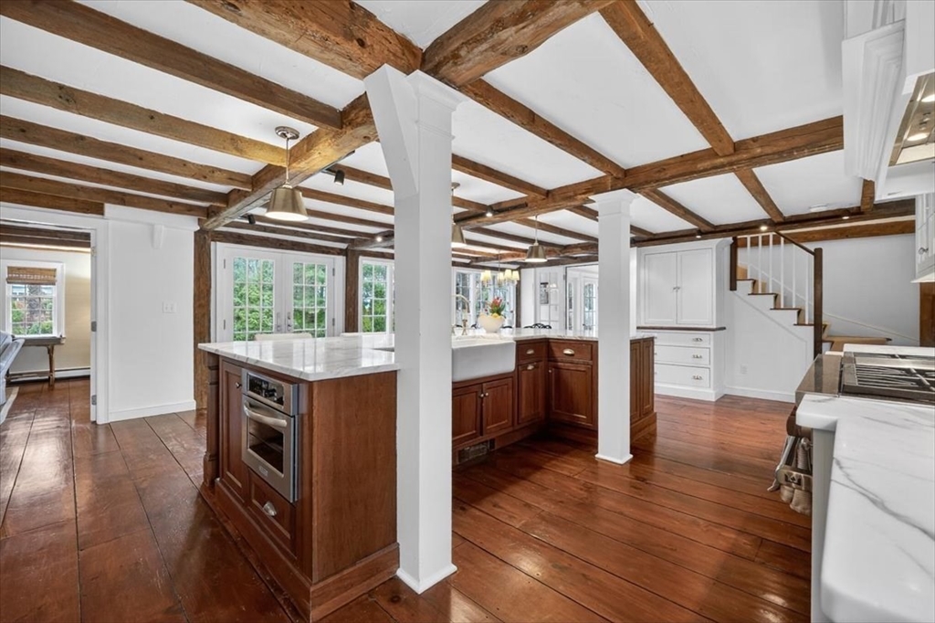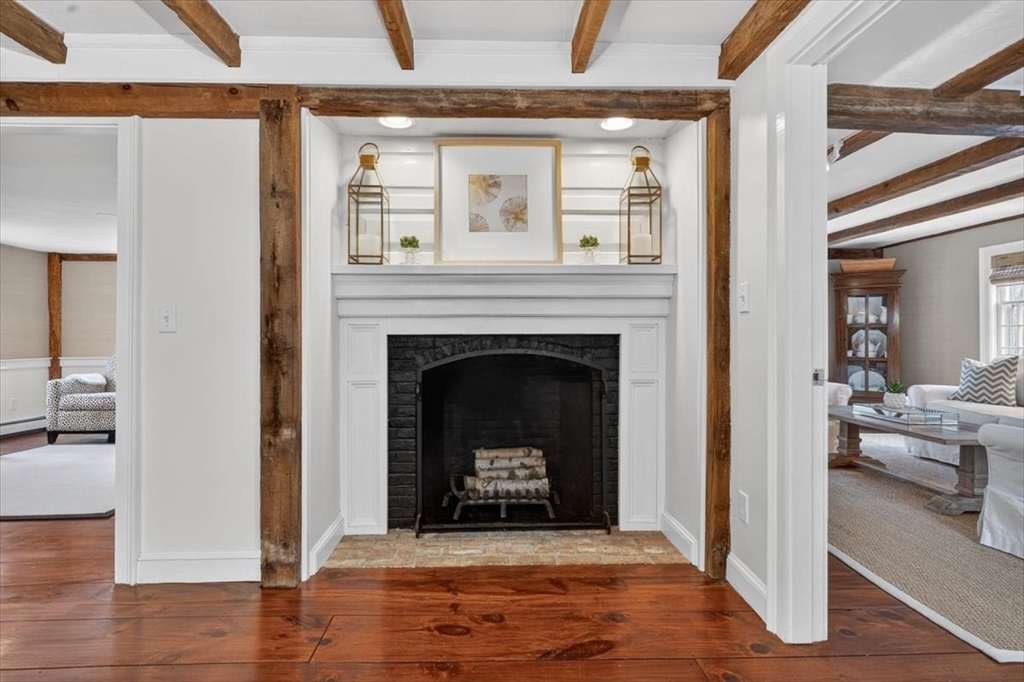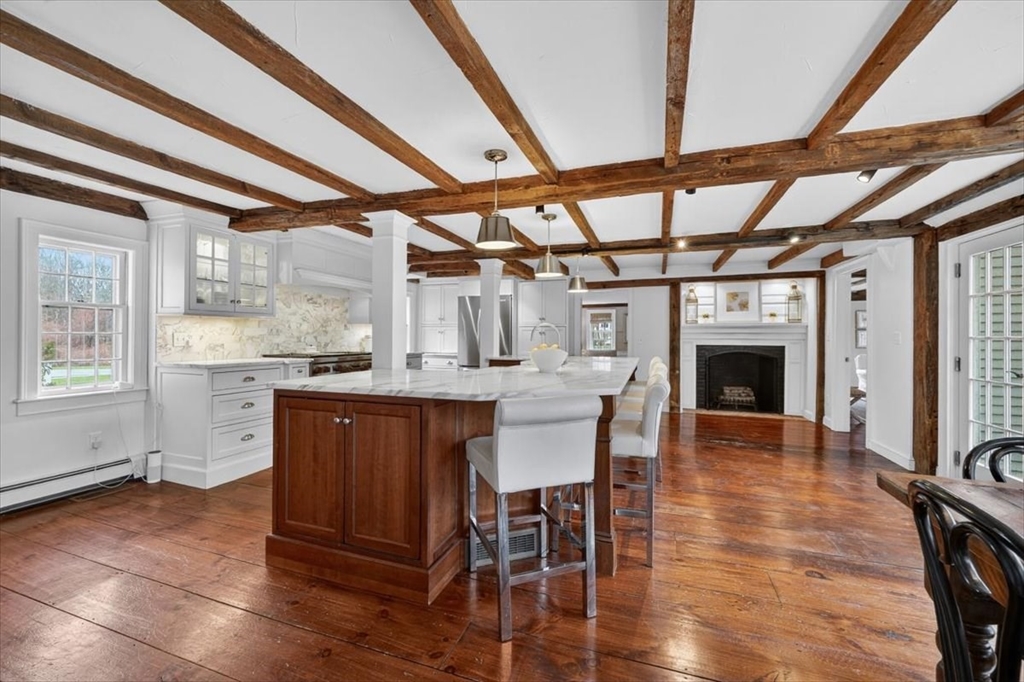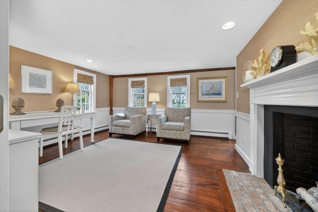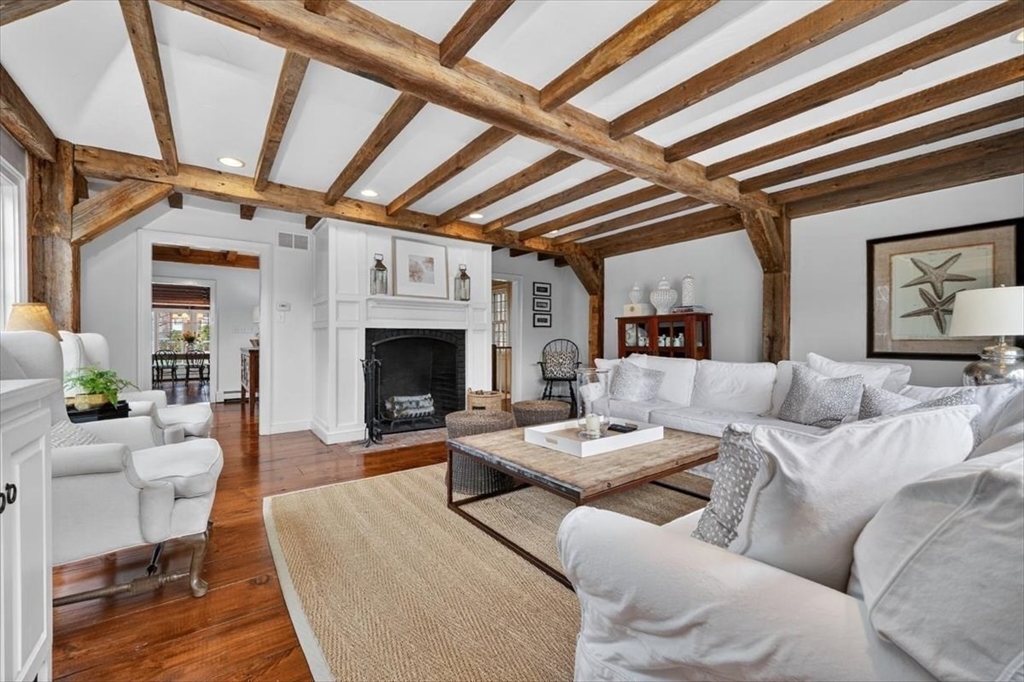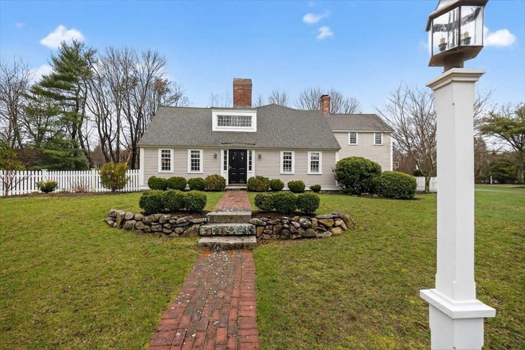 In the heart of historic Duxbury village, on a flat, open lot with mature plantings, sits this modern expansive Cape. Step inside this much-loved home to be captivated by the charm and character that abounds in every room. The gourmet kitchen is a showstopper with Calcutta gold marble countertops, a center island fit for a crowd, Wolf gas range, stainless appliances and ample storage. This spacious masterpiece incorporates a sitting area with fireplace and a dining area, all with wide pine floors. Rarely will you find a home that offers historic charm and modern amenities. This stunning kitchen centers the living room at one end, office and formal sitting room at the other. There are 3 spacious bedrooms on the second floor, 2 full baths, walk-in closet and dressing room in the primary suite. The 2 car attached garage leads to a screened porch (used as a mudroom for this family), and doors from the kitchen lead to a private patio and backyard. Welcome to charm and sophistication.