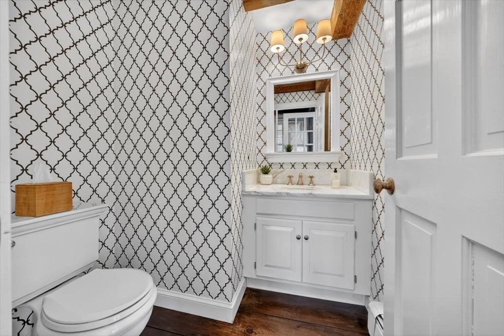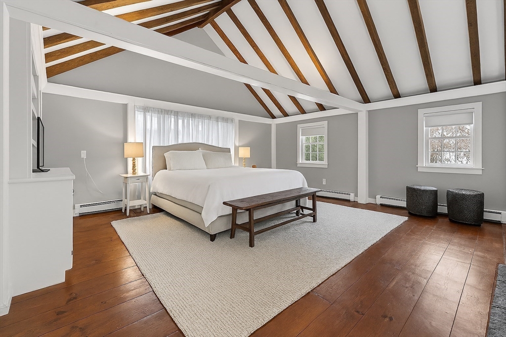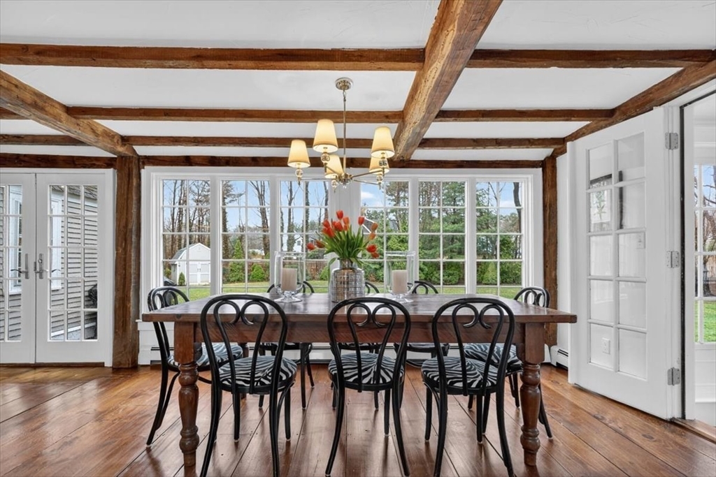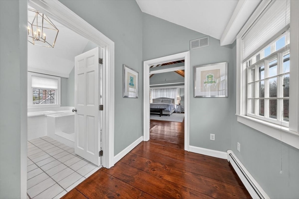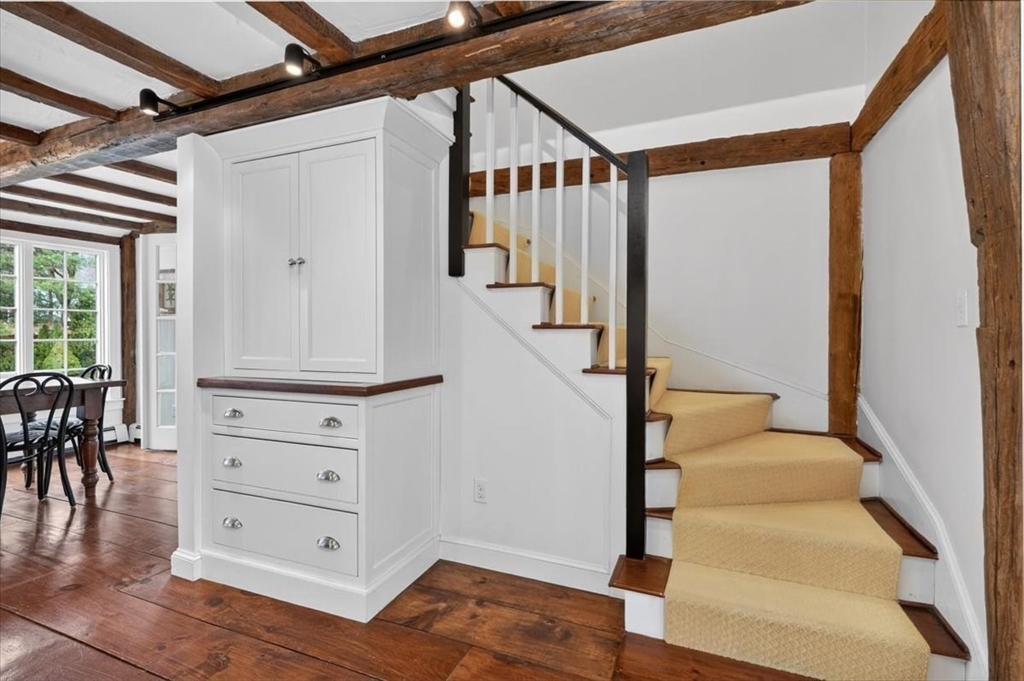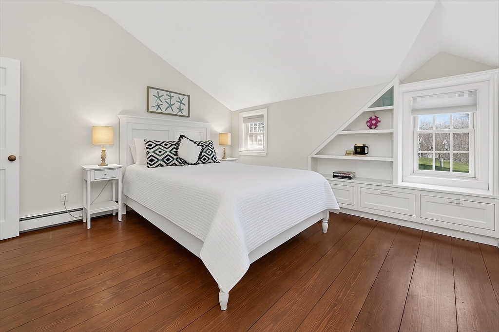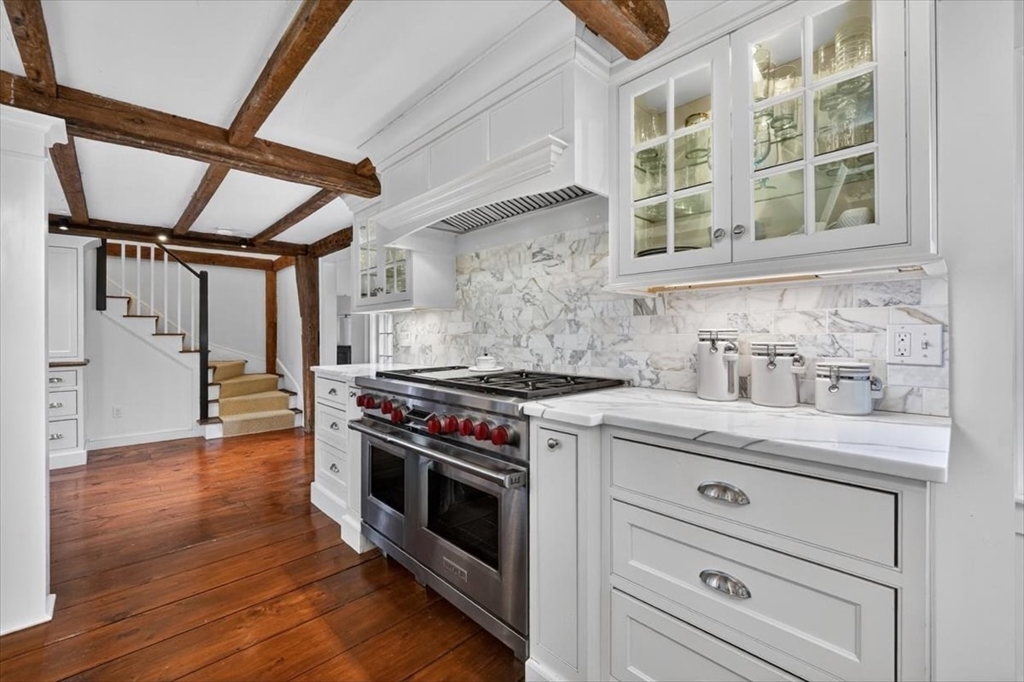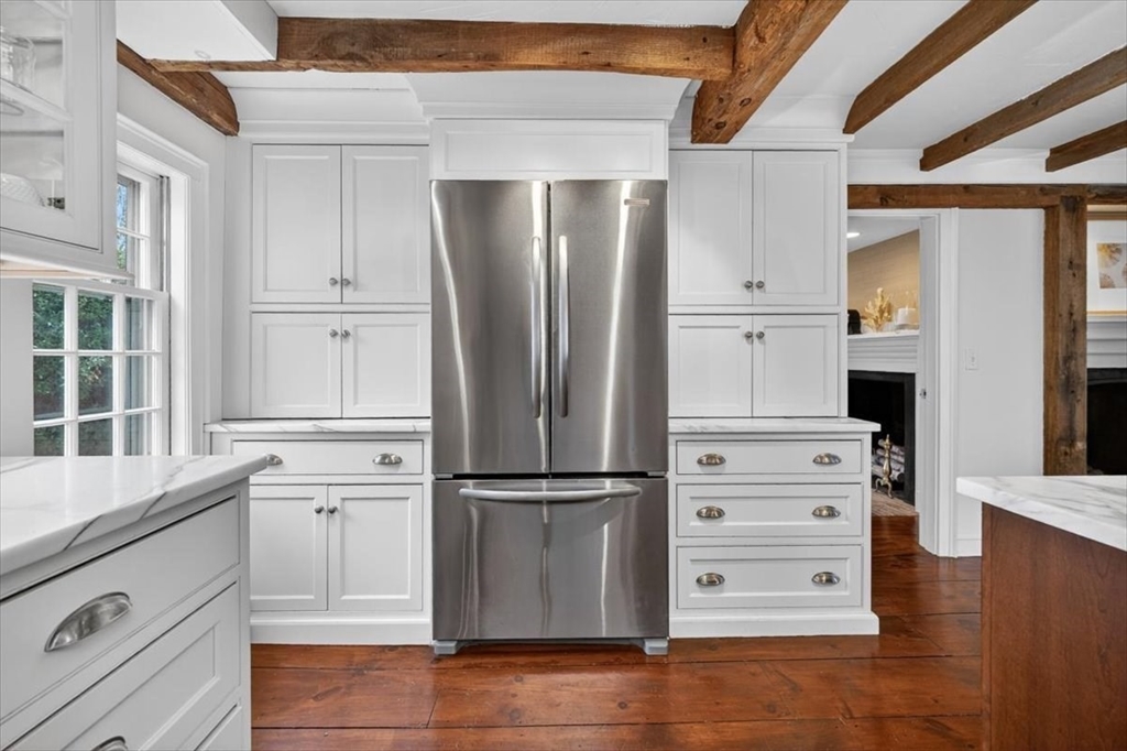 In the heart of historic Duxbury village, on a flat, open lot with mature plantings, sits this modern expansive Cape. Step inside this much-loved home to be captivated by the charm and character that abounds in every room. The gourmet kitchen is a showstopper with Calcutta gold marble countertops, a center island fit for a crowd, Wolf gas range, stainless appliances and ample storage. This spacious masterpiece incorporates a sitting area with fireplace and a dining area, all with wide pine floors. Rarely will you find a home that offers historic charm and modern amenities. This stunning kitchen centers the living room at one end, office and formal sitting room at the other. There are 3 spacious bedrooms on the second floor, 2 full baths, walk-in closet and dressing room in the primary suite. The 2 car attached garage leads to a screened porch (used as a mudroom for this family), and doors from the kitchen lead to a private patio and backyard. Welcome to charm and sophistication.