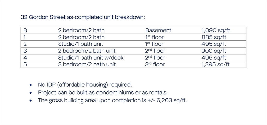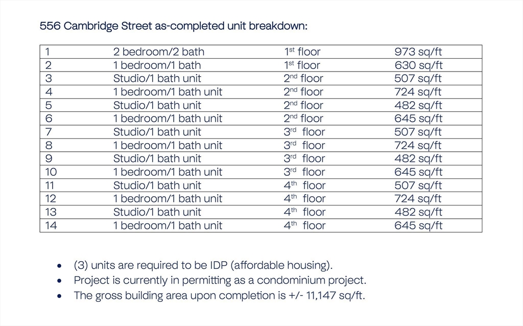 This is your chance to own 556 Cambridge Street, an existing office building and 32 Gordon Street, an existing 3 family, on contiguous lots, together w/approved plans to raze the office building and replace it with a 4 story, 14 unit residential building + separately approved plans to convert the 3 family to a 6 family via gut rehab, expansion into the basement + the addition of roof dormers. The 556 Cambridge Street property is being permitted as a condominium project w/11 market rate + 3 affordable units and a mix that includes (1) 2 bed/2 bath, (7) 1 beds + (6) studios. The 32 Gordon Street property can be developed for sale or rent and is designed to have (2) 1 beds, (3) 2 bed/2 baths + (1) 3 bed/2 bath unit, all market rate. The existing commercial building has short term tenants. The 3 family has longer term tenants. 2 separate deeds sold as a package w/building permits ready to issue. Put your money to work and transform this desirable corner of Allston into 20 new units!