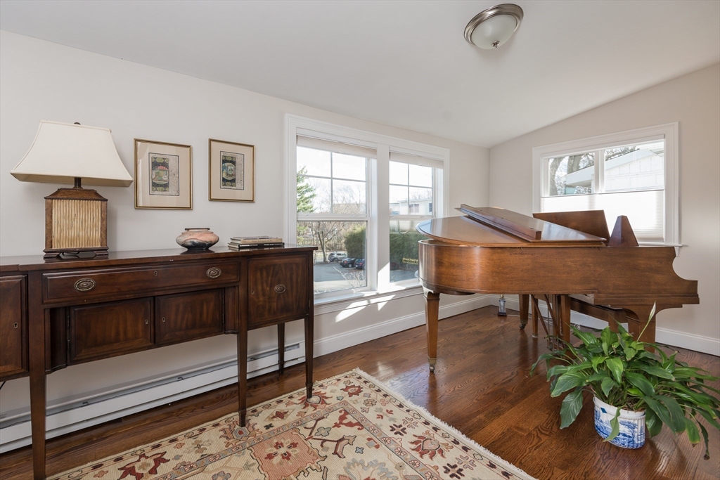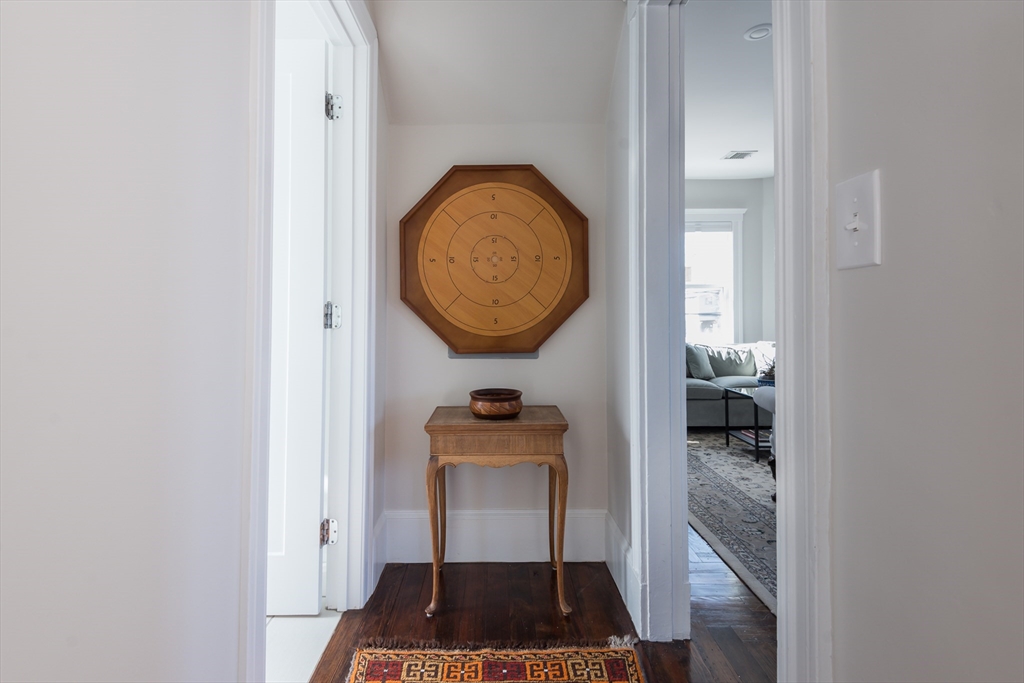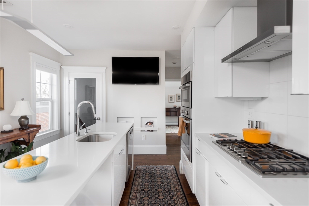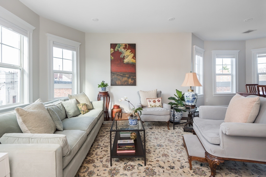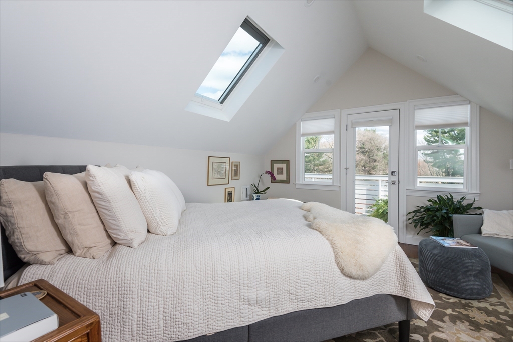 Spacious, stylish, and thoughtfully designed, 4 bed, 2 1/2 bath condo w/ loads of charm + all the modern amenities! Open floor plan features living/dining space and a beautiful kitchen w European style cabinetry, Bosch appliances, quartz counters, barn door pantry, and wide staircase leading to the lush backyard w/ patio, irrigation, and an Urban Shed for bikes and storage. This level also includes 2 bedrooms (one used as a TV room) w large closets, a tiled bath, bright sunroom, and private front deck. Retreat upstairs to the peaceful skylit primary bedroom w/ roof deck, ensuite double vanity 3/4 bath & 2 walk-in closets, and home office / nursery. And, rarely found in a 2nd floor unit, is a lower level ideal for family room, 4th bedroom, or reconfiguration for both! Fully reno'd in 2017 w/ lovely updates since. Gorgeous grounds, leafy backyard with patio, eco friendly gravel driveway, car charger, storage shed, right in the heart of East Arlington, walking distance to everything.