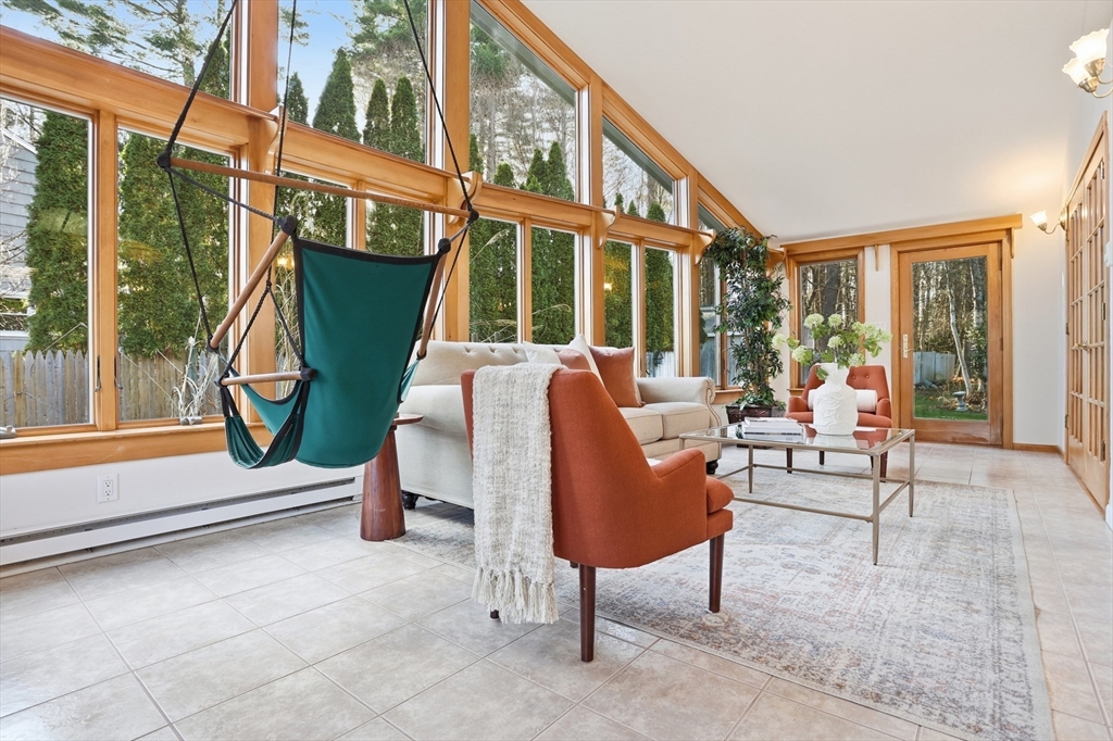 Charming ranch-style home offering 3 bedrooms and 2.5 baths, thoughtfully designed for comfortable single-level living. A bright four-season sunroom provides the perfect space to relax and enjoy views of the beautifully landscaped yard year-round. The versatile lower level offers excellent potential for an in-law suite, home office, or rec room. Energy-efficient upgrades include a newer heat pump system and owned solar panels for added savings. Outside, the property shines with a gorgeous yard featuring well-established gardens and classic stone walls, creating a peaceful and picturesque setting.