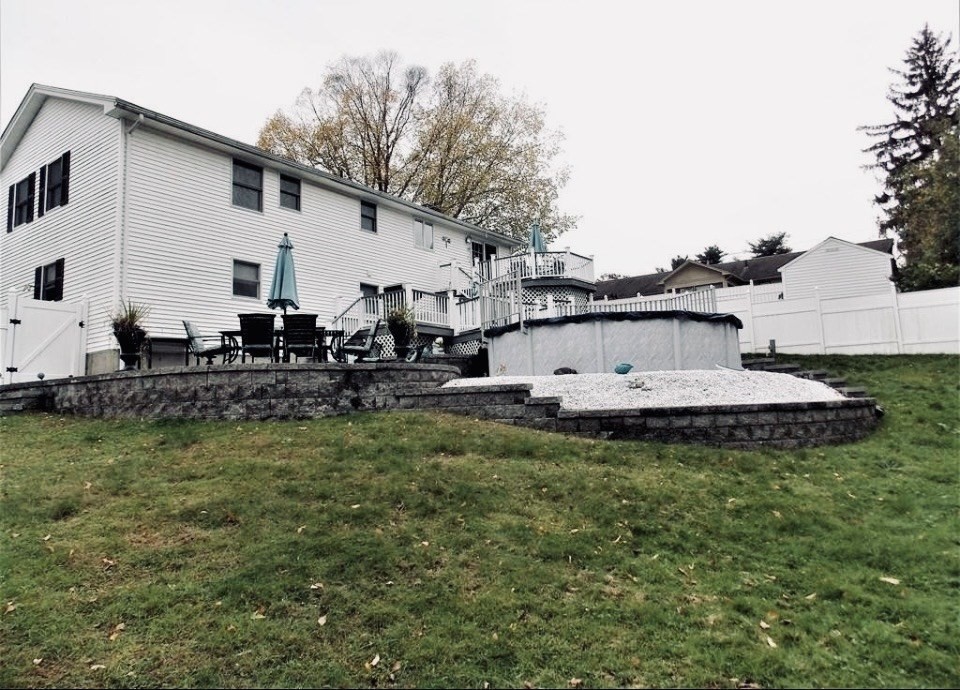 This Raised Ranch is a fantastic find, especially with a brand new roof, 4/5 bedrooms, 3 baths, a modern open kitchen and a 3 tiered deck setup with 18' pool in the backyard. Main Floor features an open floor plan with vaulted ceilings and a fireplace. Kitchen & Baths: High-end finishes including granite countertops and a primary bathroom with a marble double vanity and a soaking tub. Space for Everyone: With 4 total bedrooms (2 up, 2 down), bonus room down stairs used as 5th bedroom and 3 bathrooms, there is plenty of room for family, guests, and/or a home office. Outdoor Living: The three-tiered Trex deck and 18' above-ground pool within a fenced yard make it an entertainer’s dream. 1 car attached garage and plenty of parking on the newly built stone driveway. Showings begin at the OPEN HOUSE, SUNDAY April 12th, 11:30-1:00 For showings after the open house please give notice. Pets on premises.
