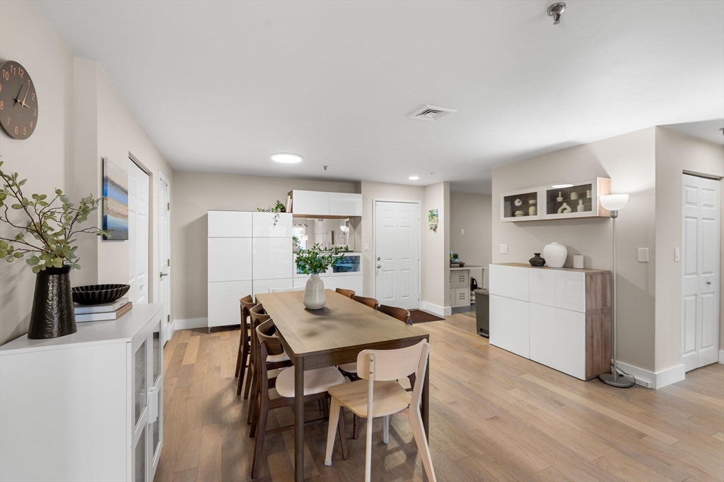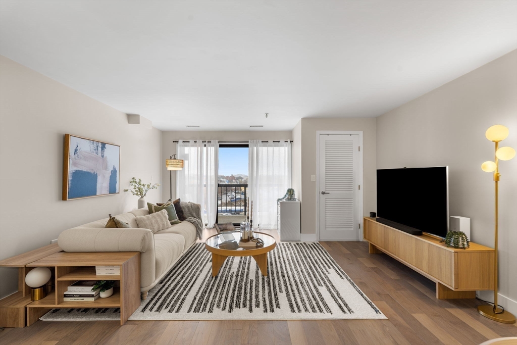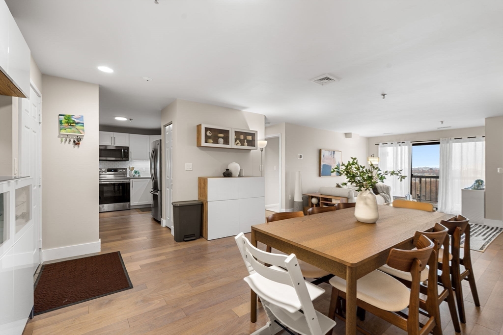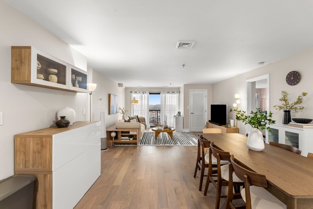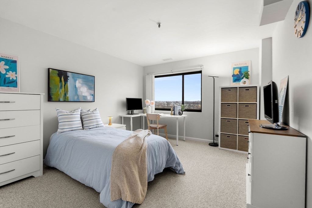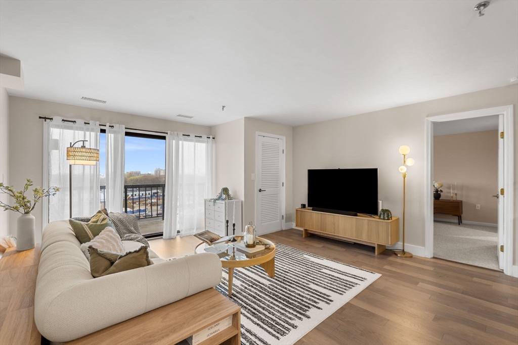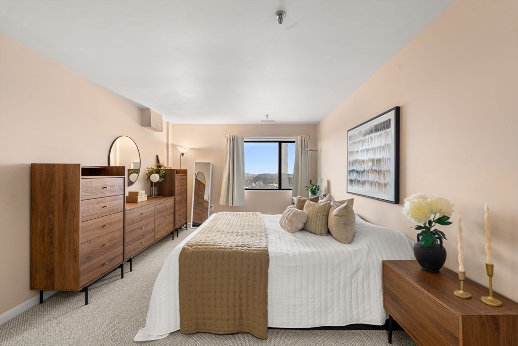 Rare find at Mystic Valley River Park, dual parking, stunning views, and a beautifully updated interior all on the 7th floor. Wake up to sweeping views of the Mystic River and the Boston skyline from your private balcony, and come home to a space you'll love every day.The kitchen shines with white shaker cabinets, granite countertops, a tasteful tile backsplash, and stainless steel appliances, perfect for cooking and entertaining. Hardwood floors flow throughout, with new carpet in both bedrooms for added comfort. Two full baths, clean and move-in ready.This unit checks every box, in-unit laundry, 1 deeded garage space (no more cold cars in winter!), and 1 additional uncovered parking spot, a combo that's hard to come by. Step outside and everything is within reach, Wellington Station, local dining, the river trail, and easy access to Routes 93 & 28. With 24-hour concierge, commuting into Boston has never been easier. This one won't last.