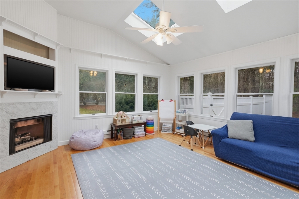 This beautifully maintained home offers 4 bedrooms and 3 full baths with plenty of space to live and entertain. Inside you'll find a welcoming living room featuring HW floors, surround sound, custom built-ins, and a cozy gas fireplace, perfect for relaxing. The open dining area with recessed lighting & a wet bar flows effortlessly into the kitchen, complete with granite countertops, breakfast bar, & ample lighting. A bright and cheerful sunroom w/ skylights, HW flooring, a slider and its own gas fireplace provides comfort. Upstairs, you’ll find four generously sized bedrooms, all with HW flooring, along with a beautifully renovated full bath featuring linen storage. A convenient laundry room with skylight adds everyday ease. The partially finished basement expands your living space with a family room behind French doors and a full bath! Outside, features a patio, fully fenced yard on a desirable corner lot with two driveways, a one-car garage, and a freshly painted exterior (2025).