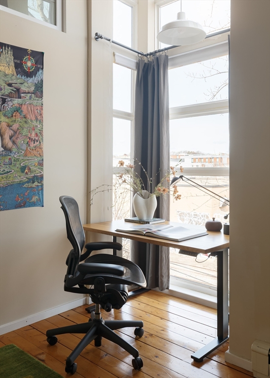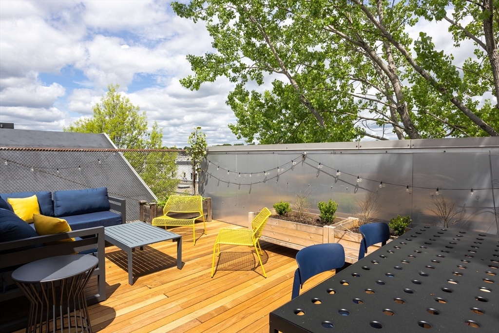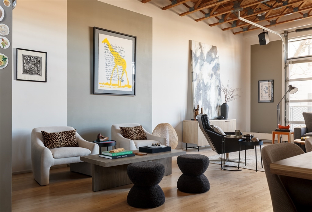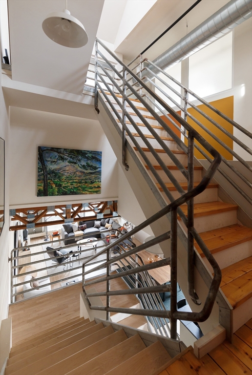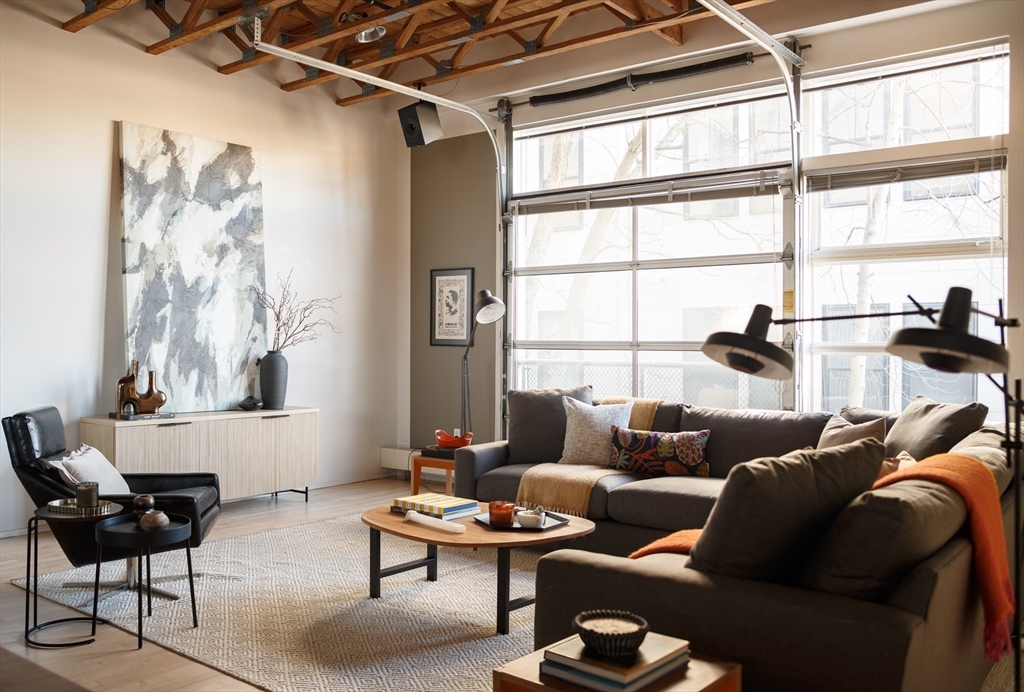 Rare end-unit "townhouse" loft with massive private roof deck, originally designed and renovated by the developer as his own home. The main living area spans 46 feet, framed by large windows on three sides and 12-foot ceilings. The upper-level loft soars even higher. Layout includes two main bedrooms plus three additional flex spaces ideal for guest quarters or offices. The bath suite is thoughtfully arranged with a separate changing room and dedicated laundry area. The home is efficiently heated by water and cooled by a separate central AC system. A private roof deck is accessed via a full-sized stairwell, with enough sun for tomatoes and outdoor shower. Below are two garage parking spots and a secure storage room. Village is a small, quiet street, discreetly dotted with $2M+ modern, architecturally significant homes. Enjoy a quick stroll to the burgeoning Kirkland Village or 15-minute walk to Harvard Square via Professors' Row. Booming Union Sq can be seen from the roof deck.