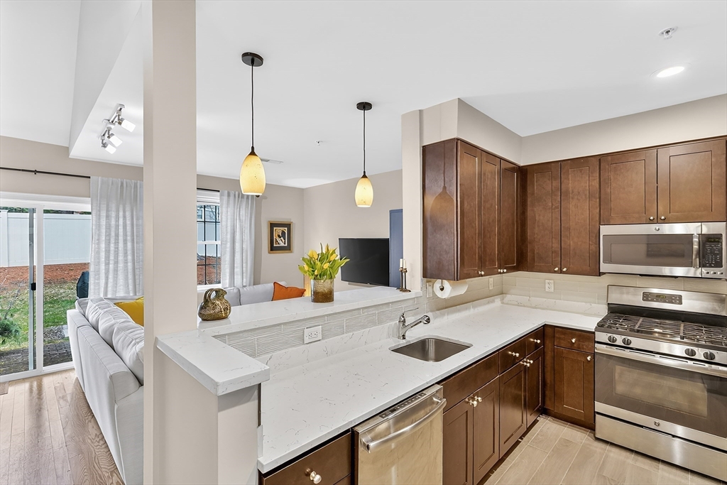 Well maintained stylish home in prime Norwood location. Townhouse style condo at Endicott Woods. Elegant kitchen with ample cabinetry, quartz countertop, tiled back splash, stainless steel appliances and breakfast bar. Large open layout living room has vaulted ceilings and is great for family and friends gathering!!! Dining room fits full size dining table for formal dinners. Sliding doors open to a private patio. Two spacious bedrooms and full bathroom with walk-in shower are located on the second floor. Primary bedroom with walk-in closet and additional closet. Second floor Loft space is a great bonus room that could be your office, playroom or TV room!! Laundry closet on the second floor. Entry foyer with coat closet, powder room. Direct access to one car garage with storage cabinets. Tankless hot water system, two zones heating and A/C. Location is close to major highways, public transportation, Norwood Center shops. Great unit if you are buying first home or downsizing