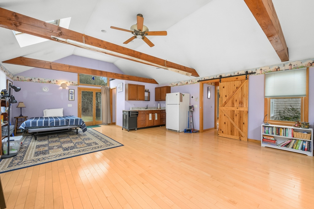 Nestled in 0.8 acres of beautiful landscapes and wood, and within a 10–15 minute drive to beaches, the Cape Cod National Seashore, scenic trails, and local shopping (with Provincetown just beyond), this sun-drenched 3-bed, 2.5-bath, 3,601 sqft home offers a peaceful and expansive haven. Inside, natural light spills across open, generous living spaces, highlighting hardwood floors and a flexible layout designed for both gathering and quiet retreat. Potential ADU or in-law suite features exposed beams and beautiful barn doors, creating a sense of warmth in the vast open space, while multiple living areas provide room to grow, host, or unwind. A three-car garage and walk-out basement add versatility and future potential. Outside, the gently sloping yard and private surroundings offer space to breathe. Come view this radiant retreat today!