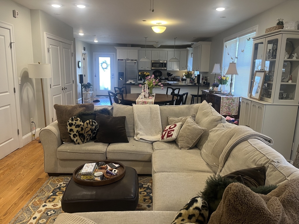 This luxury modern 3-bedroom, 2 bath apartment offers the perfect blend of style and convenience. Located on the second floor, this spacious home features hardwood floors throughout, central air, and in-unit laundry. The open-concept living area provides excellent flow for entertaining and everyday living as well as small deck. The primary suite includes a private bath and generous closet space. Enjoy shared outdoor amenities, including two gas grills, a patio, firepit, and dedicated dog area. One garage parking space included in the rent. Conveniently located near shops, restaurants, and public transportation in desirable West Roxbury