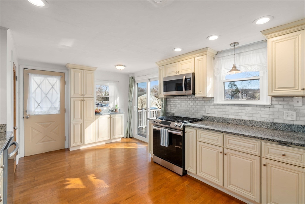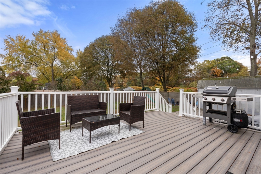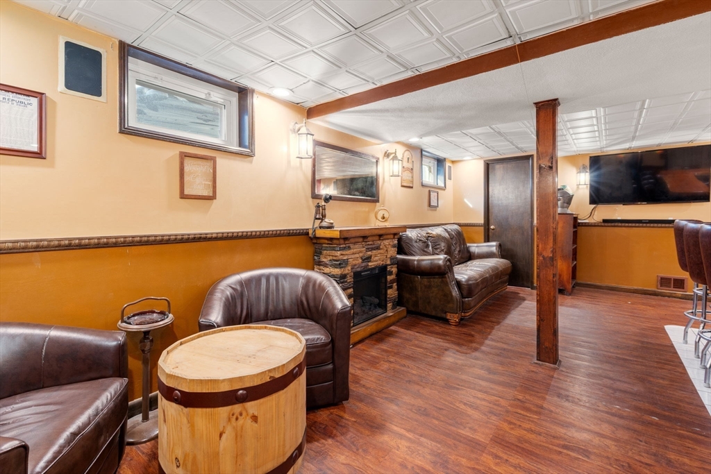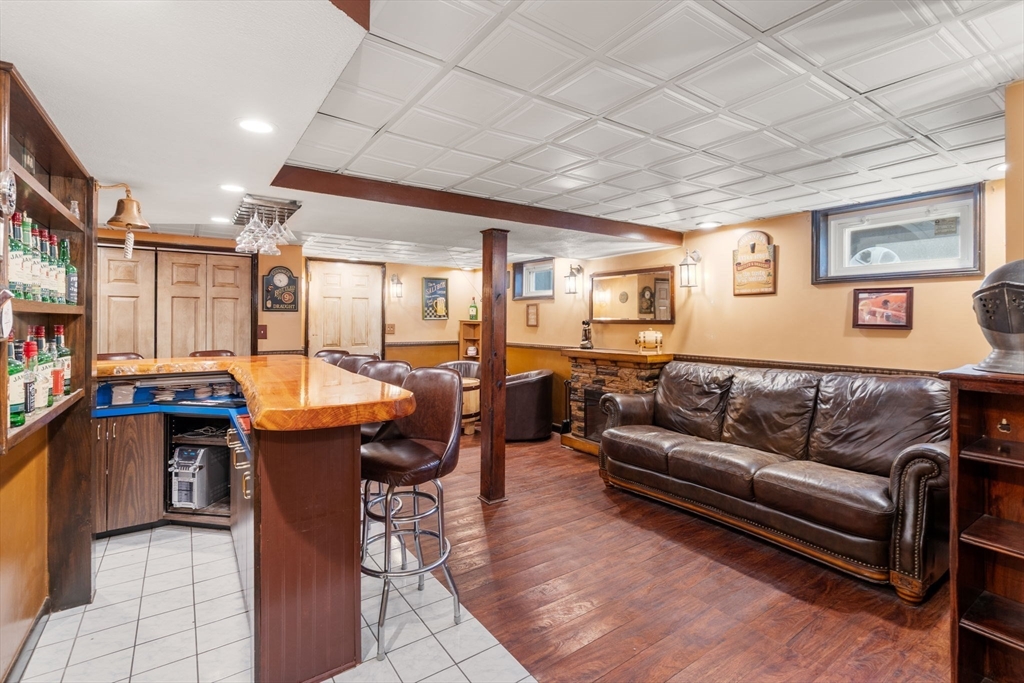 This inviting Peabody home offers 3 bedrooms and 2.5 bathrooms, hardwood floors, stainless steel appliances, and thoughtful updates, including renovated bathrooms, composite decking, and a patio. Enjoy easy indoor-outdoor living with a deck and patio overlooking a fenced yard, perfect for relaxing or entertaining. The finished basement adds flexible space with a bar area and bonus room, great for a playroom, office, or extra living space. Two driveways provide ample parking. Ideally located near shopping, dining, parks, highways, schools, and the scenic walking path around Brown’s Pond.