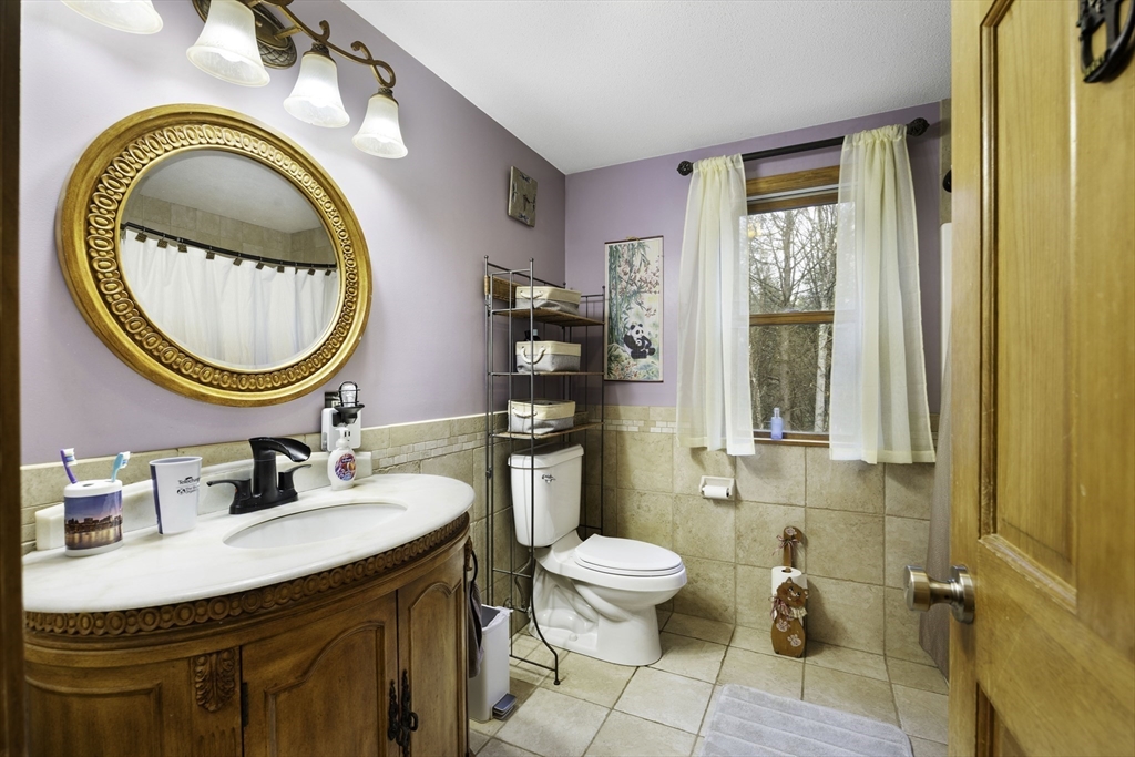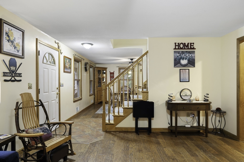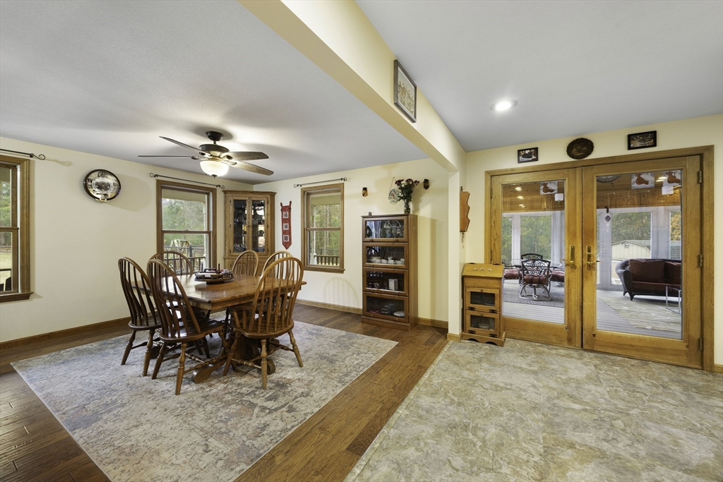Beautiful newer build Cape Cod Home set in a peaceful rural setting. The open floor plan features a spacious kitchen flowing into the dining room/living area, with continuous engineered hardwood throughout the first floor. A stunning 20' by 20' glass enclosed room with pellet stove overlooks the woods, offering a perfect year-round space to relax. The first floor includes a beautiful large bedroom, second floor offers two generously sized additional bedrooms. Enjoy the charming wraparound porch and the tranquil setting enhanced by a babbling brook on the property, providing soothing nature sounds and a picturesque natural view, conservation land abuts this property. This wonderful home comes fully applianced, including washer and dryer. Additional features include a two car garage and two storage sheds and a jacuzzi. Move right in! Enjoy peace of mind with a new roof (2023), and many recent improvements.