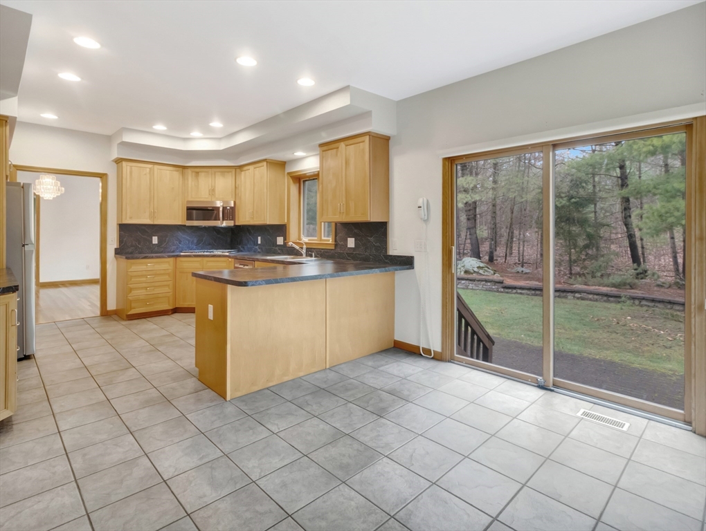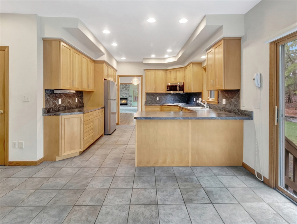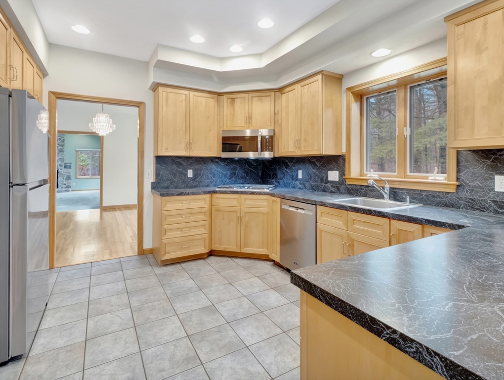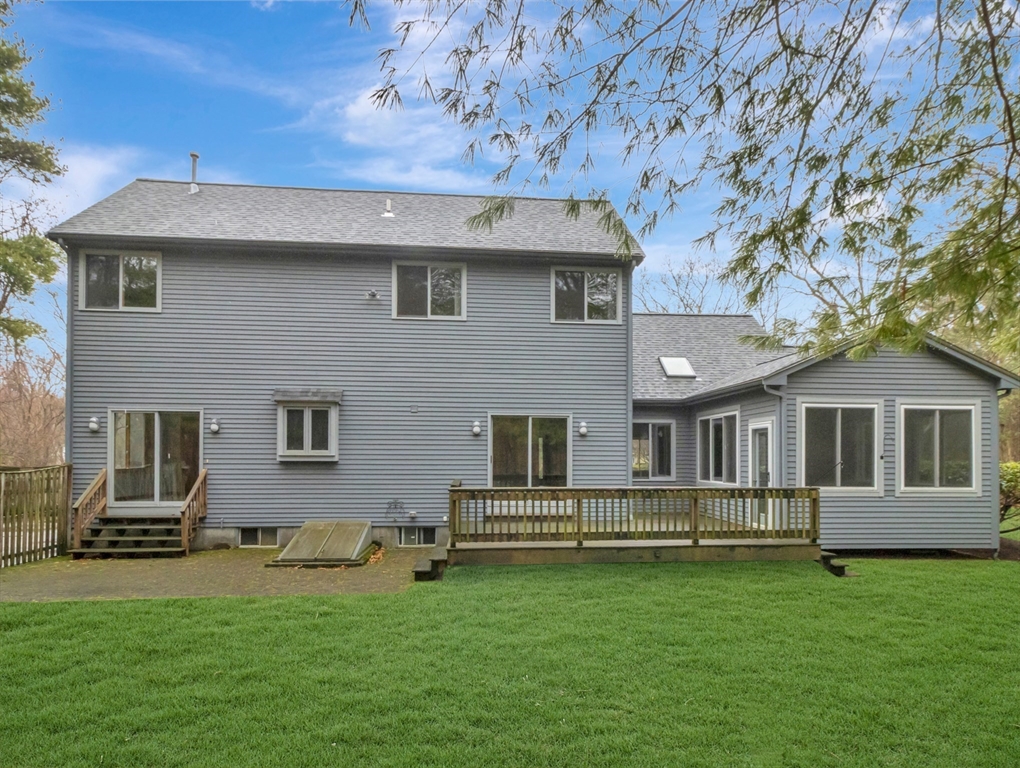 Come visit & fall in love with this wonderful property on almost an acre w/beautiful curb appeal & flowering shrubs & trees including perennial garden & 2 car garage. Relax on the oversized patio or oversized deck looking out at the pretty yard with 8 zone irrigation & stone walls. Light, bright & open floor plan, 9 foot ceilings, amazing family room w/fantastic stone fireplace & comfy window seat leads to gorgeous sun room with lots of glass. Tastefully and thoughtfully done with plenty of space, including a large first-floor office, a pretty kitchen w/gas cooktop & double ovens, awesome primary suite w/walk-in closet, full bathroom w/soaking tub & separate shower. Central air, recessed lights, gleaming hardwood floors, pocket doors, high ceilings, efficient propane gas heat & hot water, central vacuum, custom Hunter Douglas window blinds, lots of closets & storage. Bonus: one-year home warranty included for buyers. Showing starts first open house on Sat April 11th & Sun April 12th