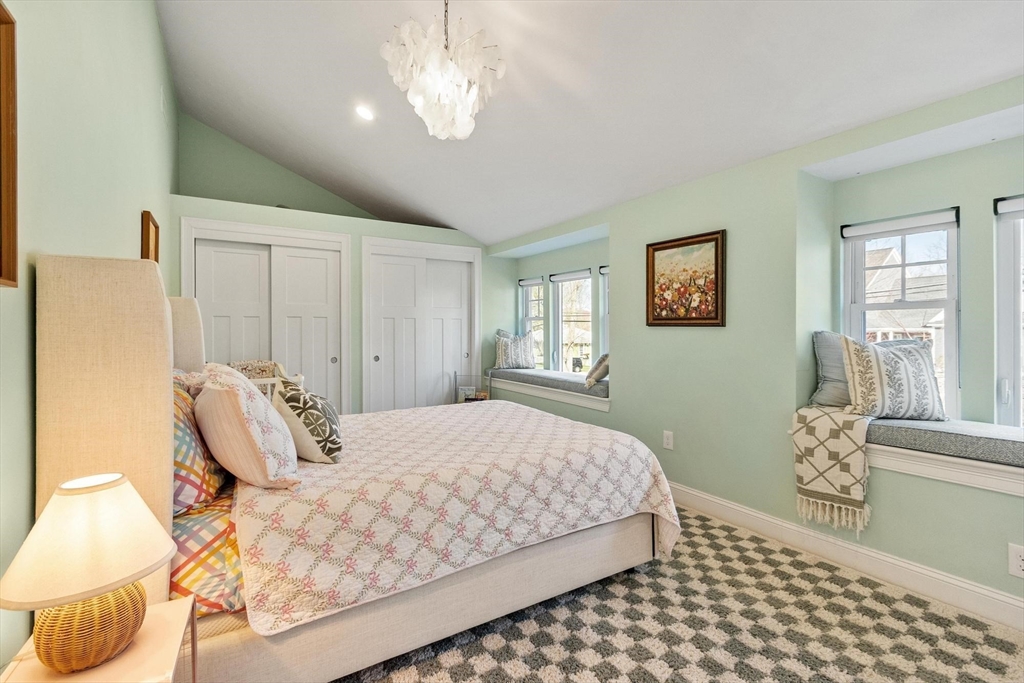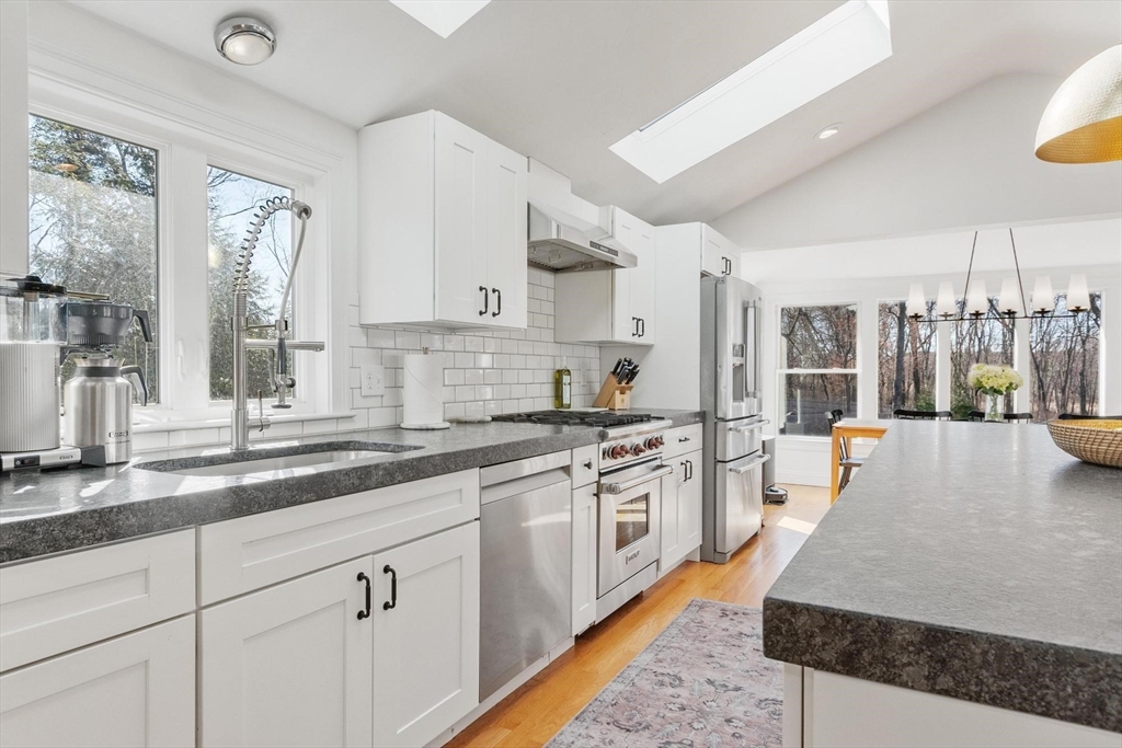 This expansive, light-filled, beautifully crafted California-inspired home impresses at every turn. The thoughtfully designed open floor plan features soaring ceilings, skylights, and oversized windows that bring the outdoors in, creating ideal spaces for both everyday living and entertaining. The fireplaced living area flows seamlessly into the stunning kitchen and breakfast room. A spacious primary suite offers a luxurious bath, two walk-in closets, and a private office nook for a peaceful retreat. Two additional bedrooms, two baths—one ensuite—and a powder room complete the main level. An open staircase leads to a lower level with a family room, bath, guest suite, mudroom, and three-car garage. Set on a level, tree-lined acre with a large deck, this home offers exceptional outdoor enjoyment. Energy-efficient systems include 21 solar panels installed in 2017. Convenient to commuting routes, conservation trails, Minuteman National Park, Heritage Swim & Racquet Club, and Concord Center