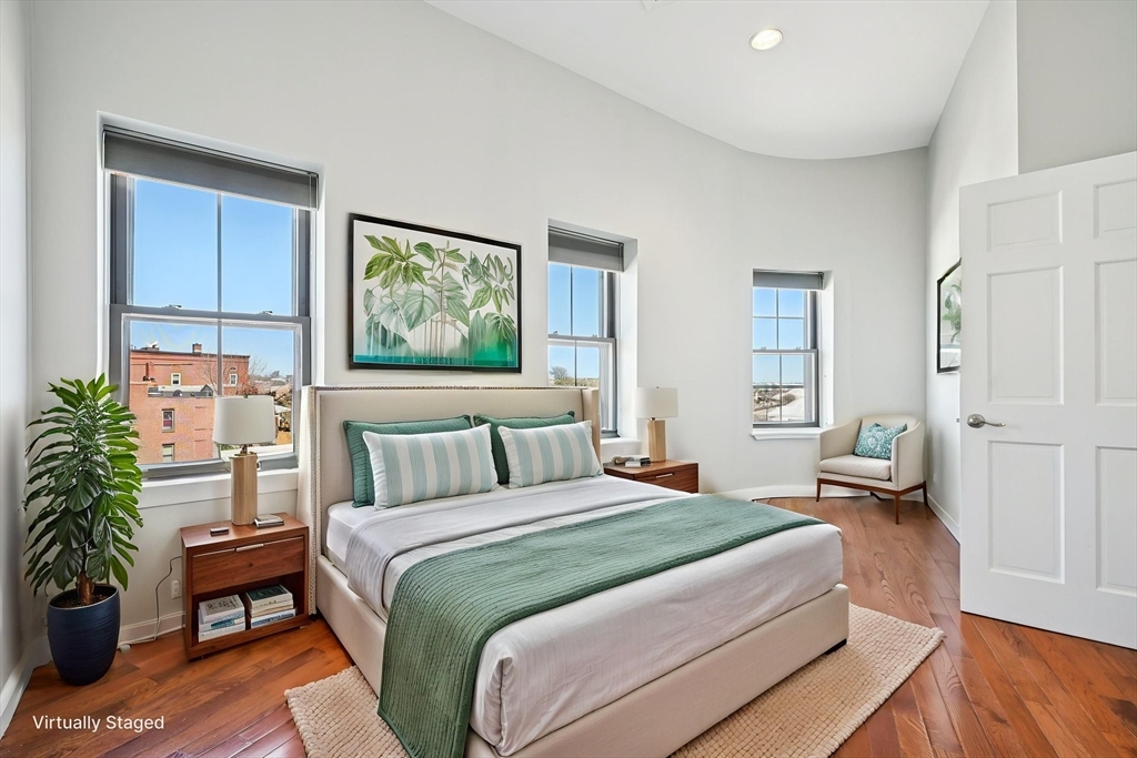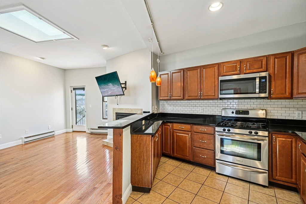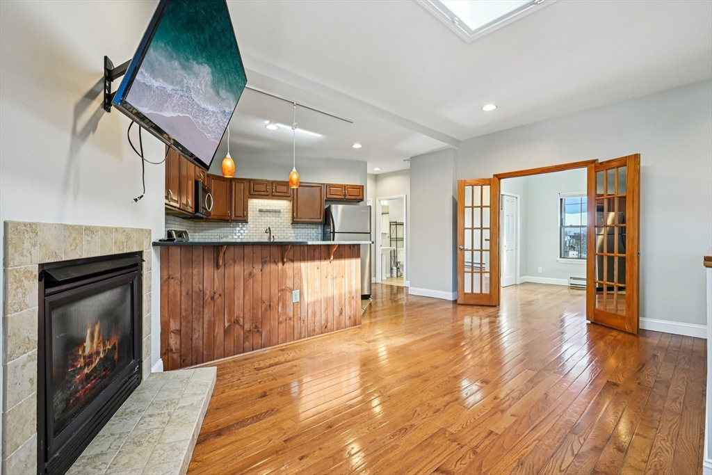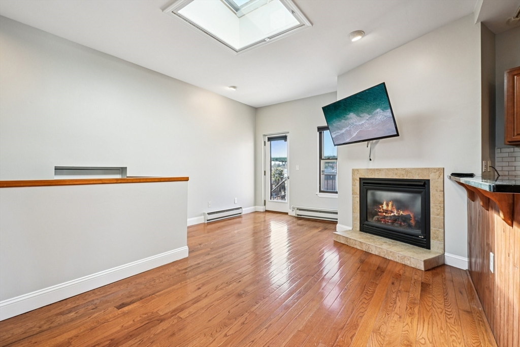Welcome to 1 Pembroke St, Unit 1D, a sun-drenched Chelsea retreat that perfectly captures the essence of urban loft living. This stunning residence features an airy open-concept plan amplified by dramatic high ceilings and a centerpiece skylight that drenches the space in natural light. The inviting living area, anchored by a warm fireplace, flows seamlessly into a kitchen equipped with stainless appliances and breakfast bar seating. Practicality is a priority here with the convenience of in-unit laundry, a dedicated off-street parking space, and a well-managed association that ensures peace of mind for any resident. Step outside to your private outdoor space, featuring a retractable awning that provides shade as you enjoy great views of the iconic Tobin Bridge and the city skyline. You are just minutes from the heart of Boston via the Silver Line or Commuter Rail. Whether you are looking for a savvy investment or a move-in-ready sanctuary for an owner-occupant, this home is it!