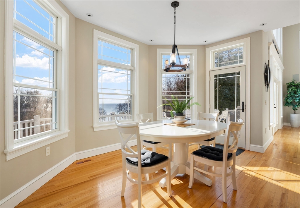 Oceanview private estate perched above Cape Cod Bay, offering deeded sandy beach access—no stairs required. This Nantucket style masterpiece welcomes you with a grand two-story great room featuring a gas fireplace, custom built-ins, and expansive walls of glass capturing panoramic coastal views. French doors open to the spacious deck & hot tub, perfect for relaxation. The newly renovated chef’s kitchen is adorned with granite, high end appliances, breakfast bars flows into a sunlit dining area w/ pantry Hardwood floors guide you to a first-floor guest bedroom w/ adjacent full bath. Sunlit office, Bonus room above 2 car garage has a wet bar. Upstairs, the opulent primary suite includes a private balcony, spa bath, and walk-in closets. Two additional bedrooms share a full bathroom and an open office/library/ exercise room boast ocean vistas. The 3rd level flex space is s perfect artist loft, music room or 5th bedroom The walkout lower level offers a half bath, laundry & storage.