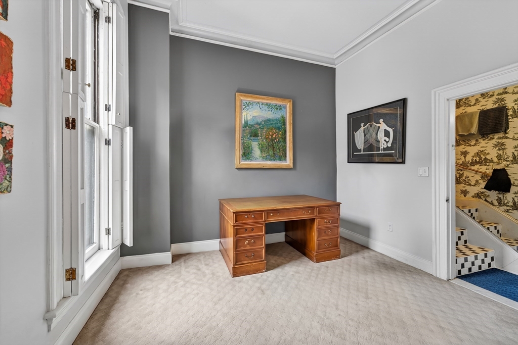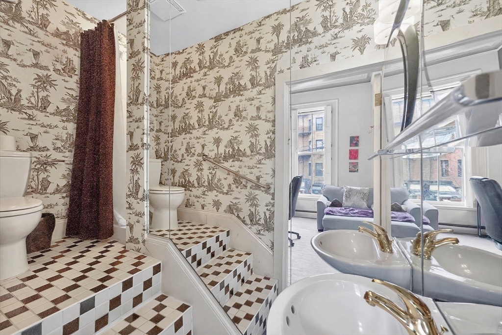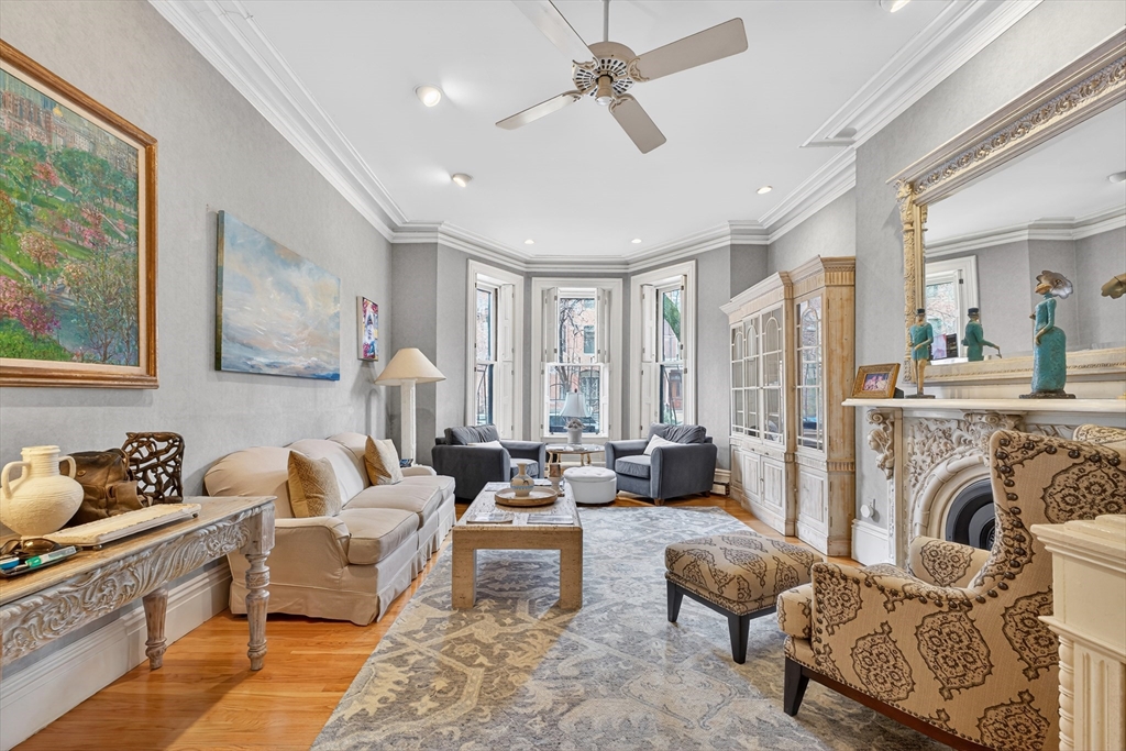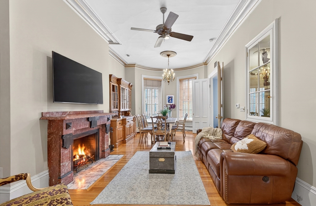 Located within a classic five-unit brownstone on the sunny side of Marlborough Street, this 1,809 SF 3 bed, 3 bath residence offers an ideal blend of historic character and modern livability in the heart of Back Bay. Set on a quiet, tree-lined street, yet just a 4-minute walk to the boutiques, cafés, and restaurants of Newbury Street and moments from the scenic waterfront paths of the Charles River Esplanade, the location defines true walkable city living. Spanning two floors across the first and garden levels, the home features soaring ceilings, detailed crown moldings, rich hardwood flooring, abundant natural light, and a working fireplace, complemented by central A/C and in-unit laundry. The layout lives like a private townhouse, enhanced by a private patio, deeded off-street parking directly outside the entrance, and a professionally managed association with heat and hot water included. Recent improvements include a new façade, repointed steps, and a cobblestone entry.