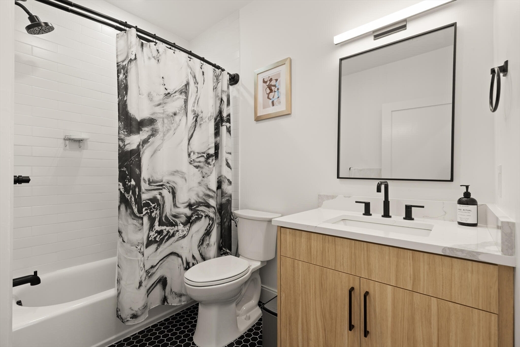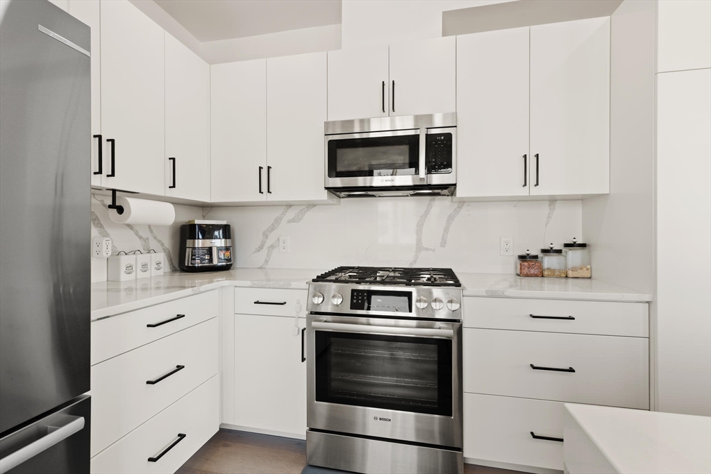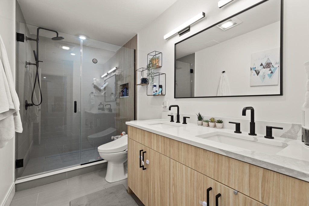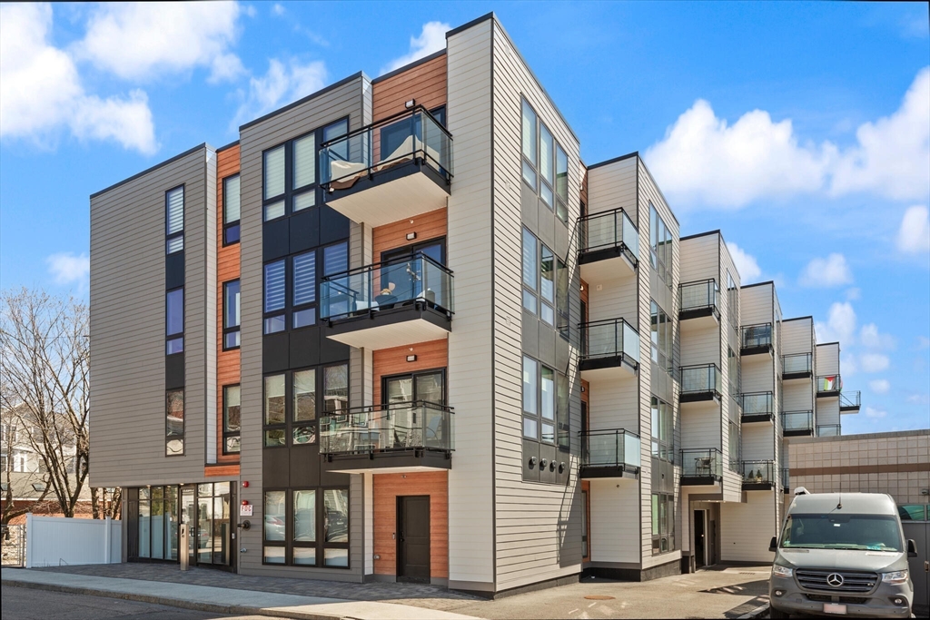 EXCEPTIONAL SINGLE-LEVEL CORNER residence with ELEVATOR in the heart of Roslindale Center. This sophisticated 2-bedroom, 2.5-bath home offers an elevated living experience. FLOOR-TO-CEILING WINDOWS that flood the space with natural light & 3 PRIVATE BALCONIES create seamless indoor-outdoor living.Thoughtfully designed for comfort & style. Expansive living areas, refined finishes, and a layout that feels both open & private. Each bedroom offers an EN-SUITE bath, the half bath adds convenience for guests. The corner positioning provides added PRIVACY and a sense of EXCLUSIVITY rarely found at this price point. Enjoy the ease of 1 GARAGE PARKING space in the building with plentiful parking & EV charging nearby. Ideally located close to the commuter rail, vibrant restaurants, boutique shopping, and everyday essentials. A Lux Seaport Style Condo just Minutes to downtown Boston, yet perfectly set in one of the city’s most charming neighborhoods. Built to impress, and built to last.