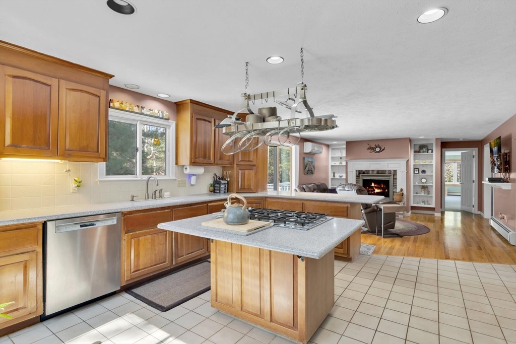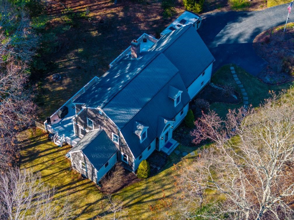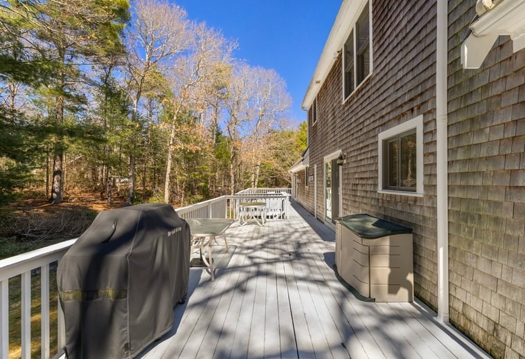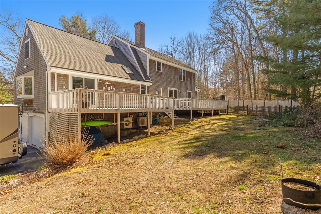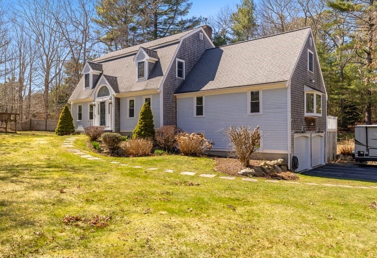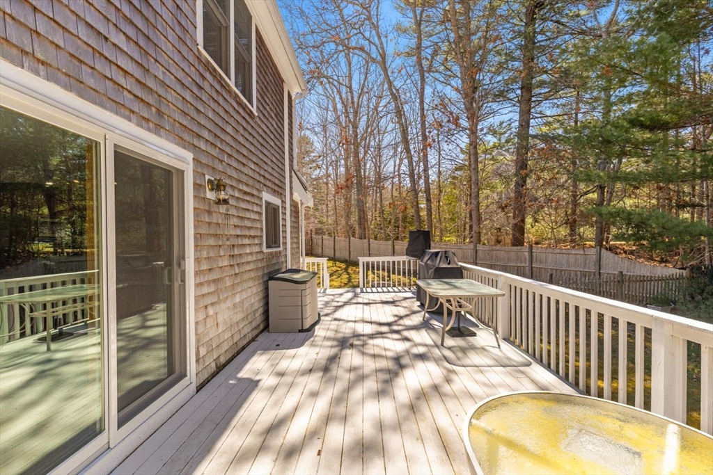 Located in the highly desirable Pimlico Pond Estates in Sandwich, this spacious 3,200+ sq. ft. Gambrel-style home sits gracefully on nearly an acre of beautifully landscaped land. The heart of the home is the well-appointed kitchen, featuring rich cherry cabinetry, Corian countertops, a professional-grade cooktop, and tile flooring--perfectly opening to a warm and inviting fireplaced family room with custom built-ins. Designed with flexibility in mind, the floor plan offers a sought-after first-floor primary suite complete with a private bath, oversized whirlpool tub, separate shower, and skylight for natural light. The second level provides four additional rooms, ideal for bedrooms, home office space, or guests. Step outside to enjoy the expansive deck that spans the length of the home, accessible from the primary bedroom, family room, and mudroom--perfect for entertaining or relaxing while overlooking the lush yard filled with mature perennials. Don't miss it!