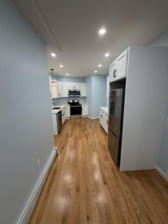 2 BEDROOMS + OFFICE. Brand-New Renovation, Steps to Revere Beach, 2BD + Office. Newly-renovated apartment located just steps from Revere Beach, Logan Airport, Kelly's, and the Wonderland Blue Line Station. Everything in the unit is brand new from top to bottom. Features 2 large bedrooms, a dedicated home office, a full bathroom, and an in-unit laundry room with W + D included. Brand-new hardwood floors and premium tiling throughout, with a sleek kitchen fitted with all-new stainless steel appliances. Gas heat from a new combi boiler system. Plenty of street parking available.Situated in a family-friendly neighborhood with a public park and highly rated public schools nearby.First, last, and security deposit required. Unit 1, 1,100 sq ft, Available May 1st