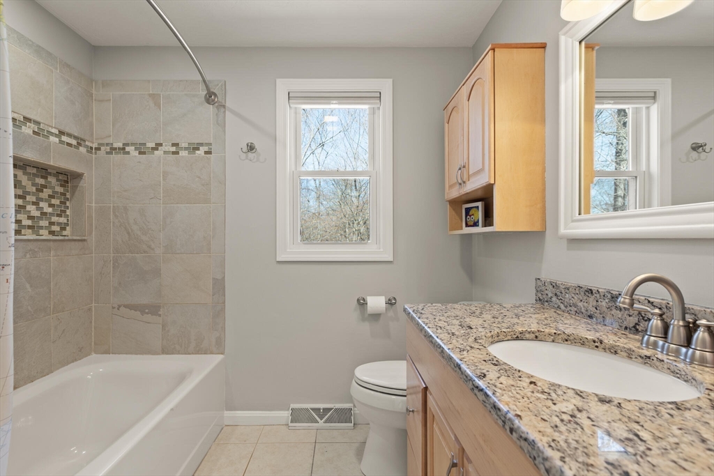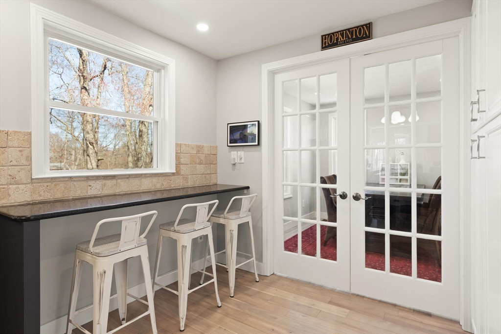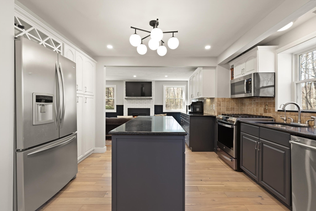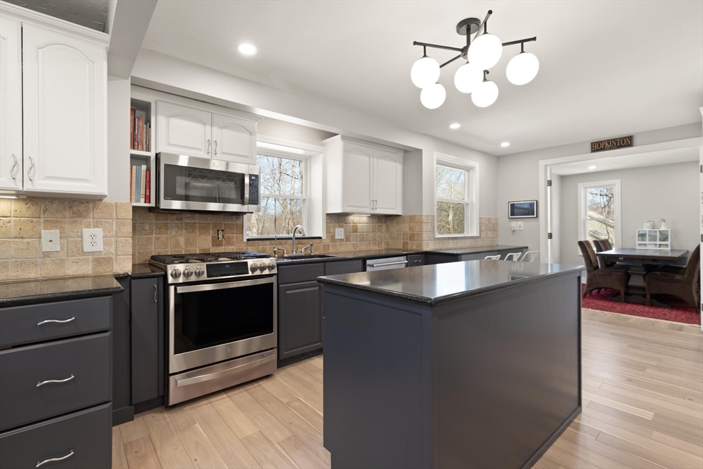 Step into this beautifully maintained home, set on a quiet cul de sac close to top-rated schools and the town center. A welcoming entry with a paved walkway and stone accents creates great curb appeal. Inside, a bright living area features large windows, glass-paneled doors, and custom built-ins.The kitchen spans the rear of the home with a center island, quality cabinetry, and ample storage, flowing into the dining area with a gas fireplace and access to the deck. A private office and half bath complete the main level.Upstairs, the sunlit primary suite offers vaulted ceilings, double closets, and an updated bath with dual sinks. Two additional bedrooms and a renovated full bath complete the second floor.Enjoy the spacious deck overlooking a fenced yard, plus a side yard with a fire pit and room to play. Convenient to town common and Hopkinton’s highly rated schools.