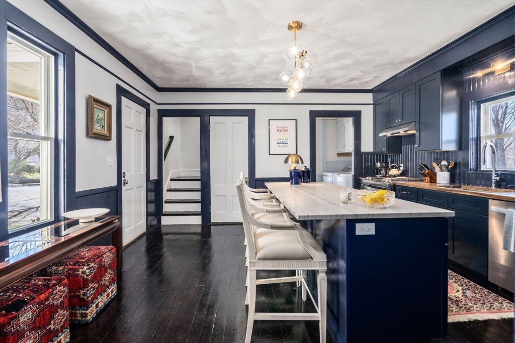 Townhouse-style condominium in a two-unit building offering the space and feel of a single-family home in Maynard. Converted from a multifamily in 2006–2007 with updates including replacement windows, roof, and heating system. Flexible 3-bedroom layout currently used as a 2-bedroom, with the option for a first-floor bedroom depending on lifestyle needs. The main level features a bright kitchen with quartzite island, new cabinetry, butcher block work surfaces, designer lighting, dark-wash maple flooring, and high ceilings. Adjacent formal dining room with wide pine floors and updated lighting, plus a living room with full bay window. The second floor offers two bedrooms (one with walk-in closet) and a large family room or home office. Additional highlights include efficient gas heat, newer windows, a full walk-out basement for workout space/storage, and a spacious, exclusive-use backyard.