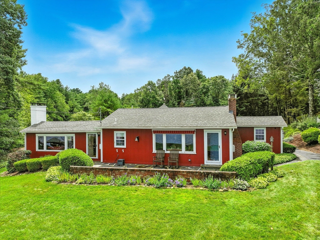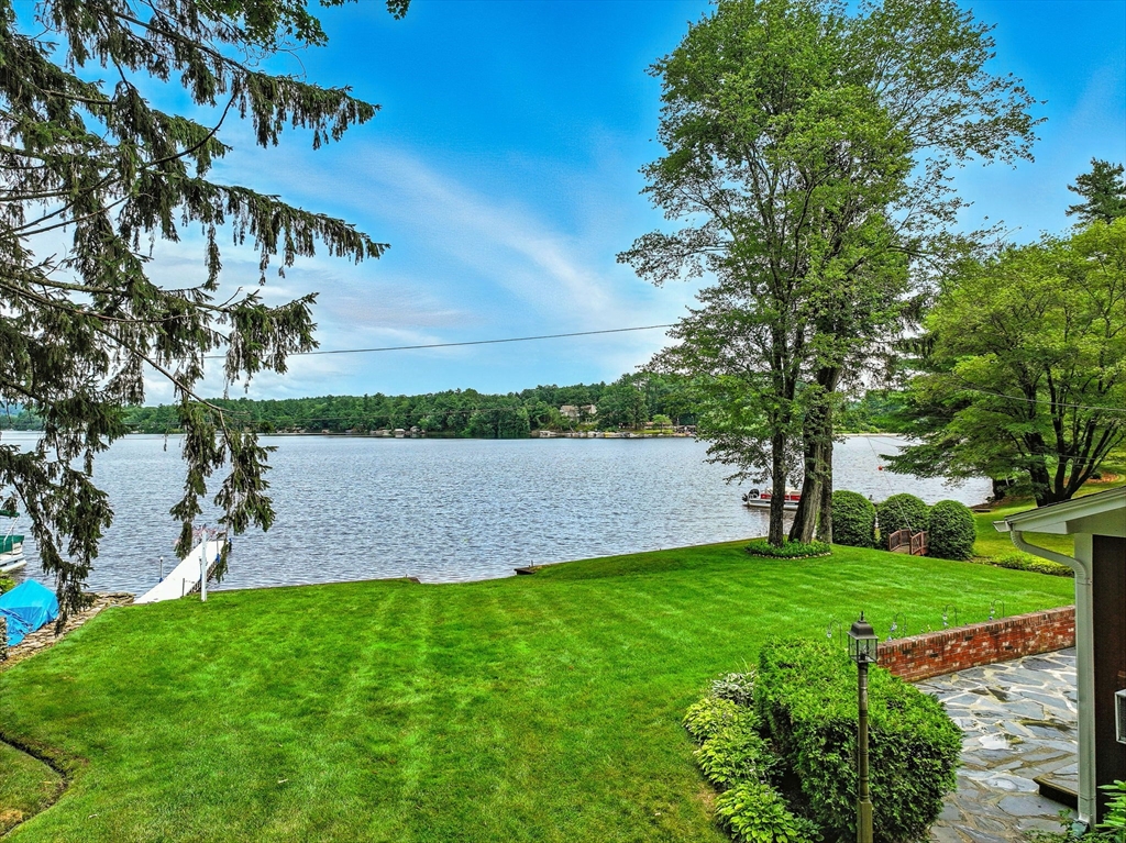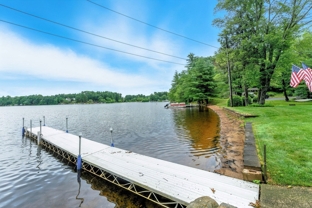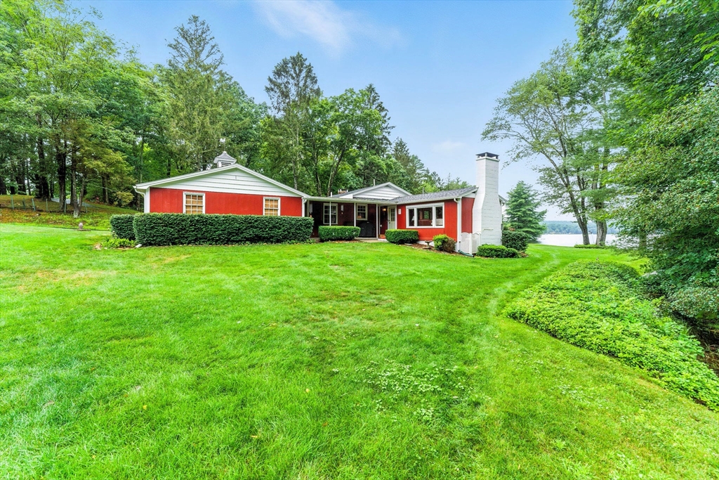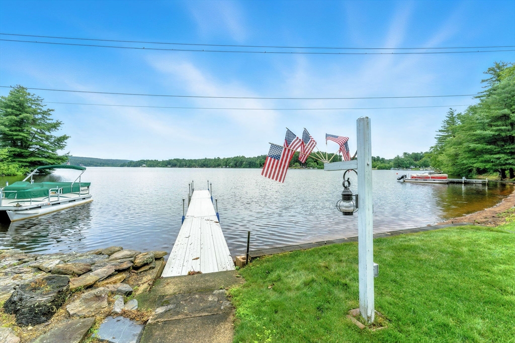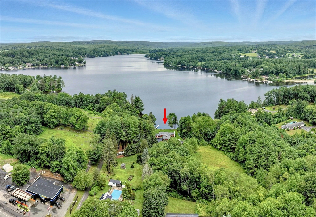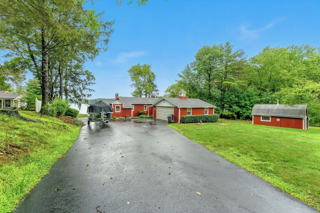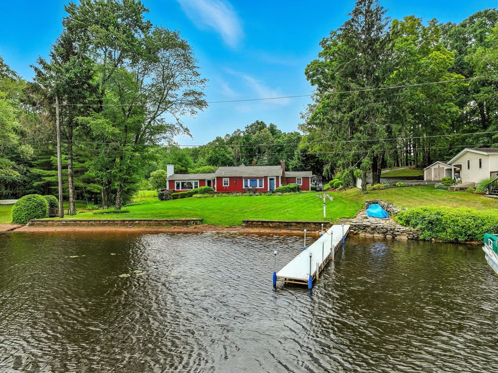 Escape to a peaceful waterfront retreat on Lake Wickaboag in West Brookfield! AMAZING opportunity to own waterfront property! This lovingly maintained one-level home built in 1951 is on a nice level 1.19 acre lot. The yard is perfect for entertaining many guests too on those summer days! As you enter in the front door from the covered patio, you have lake views from the den area that has a gas fireplace, hardwood flooring. The fully applianced kitchen has wood cabinetry, wood ceilings and tile flooring. Main bathroom has a shower. Bedrooms are good sizes with plenty of storage space. The bedroom suite has a nice office area leading into the bedroom with another full bathroom that has a tub. Custom millwork radiators thru-out. This home has an updated roof, windows, doors and gutters. There is a barn on the property as well. Garage has a shower. The patio overlooking the lake has an awning to enjoy some shade on those hot summer days! Generator and AC window units included. Don't wait!