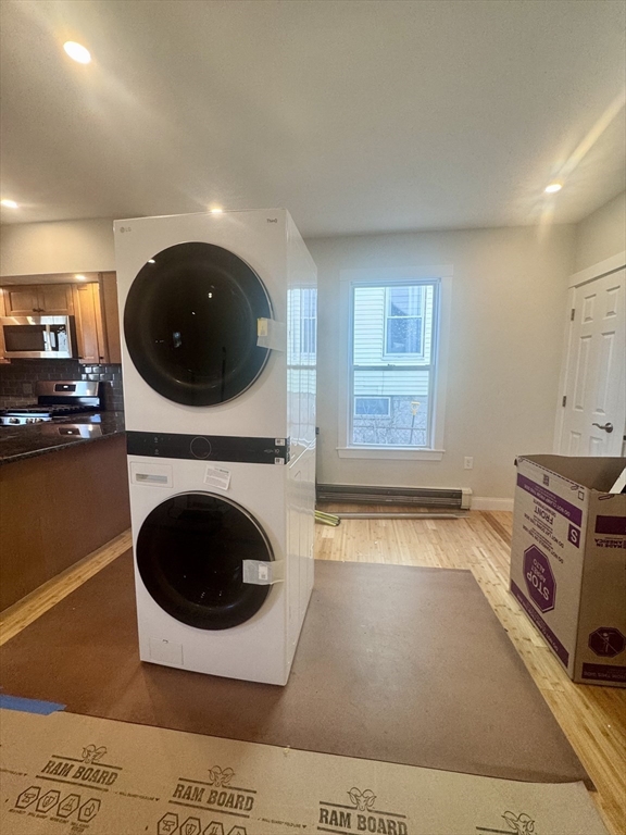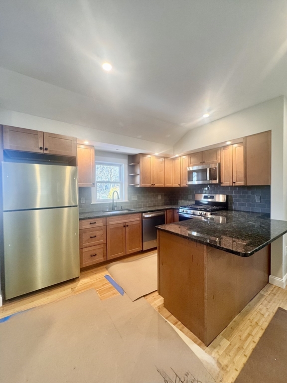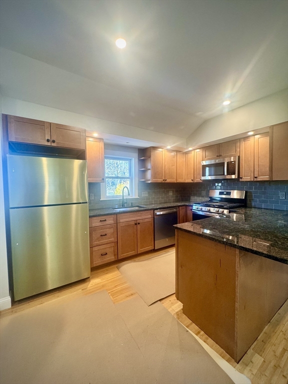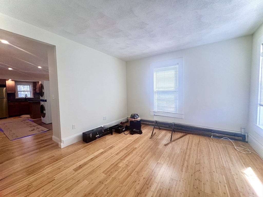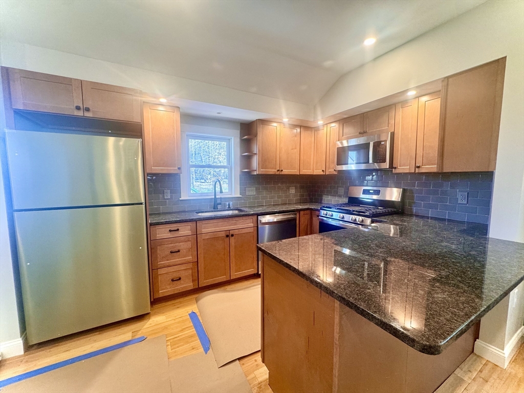 Located in highly sought after S. Waltham, steps from vibrant Moody Street, this beautifully renovated 2 BR , 1.5 BA DUPLEX offers the perfect blend of style, comfort, & convenience! Ideal for commuters w/ easy access to public transportation & major highways.This spacious unit features a fully S/S applianced brand-new kitchen w/ granite countertops,& breakfast bar seating. Formal DR is enhanced w/ built-in custom cabinetry & a granite countertop, adding both elegance & functionality.The sun-filled LR boasts abundant natural light, creating a warm and inviting atmosphere. A convenient half bath on the first floor includes a brand-new front-loading washer and dryer.Upstairs, the primary bedroom impresses w/ vaulted ceilings and a modern ceiling fan, while the 2nd BR offers comfortable living space. The completely renovated full bathroom completes the second floor.Private parking area w/ 2 included spaces, a charming front porch, and a back deck—perfect for outdoor entertaining.