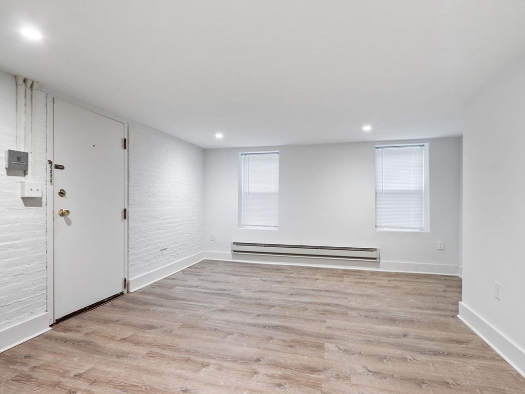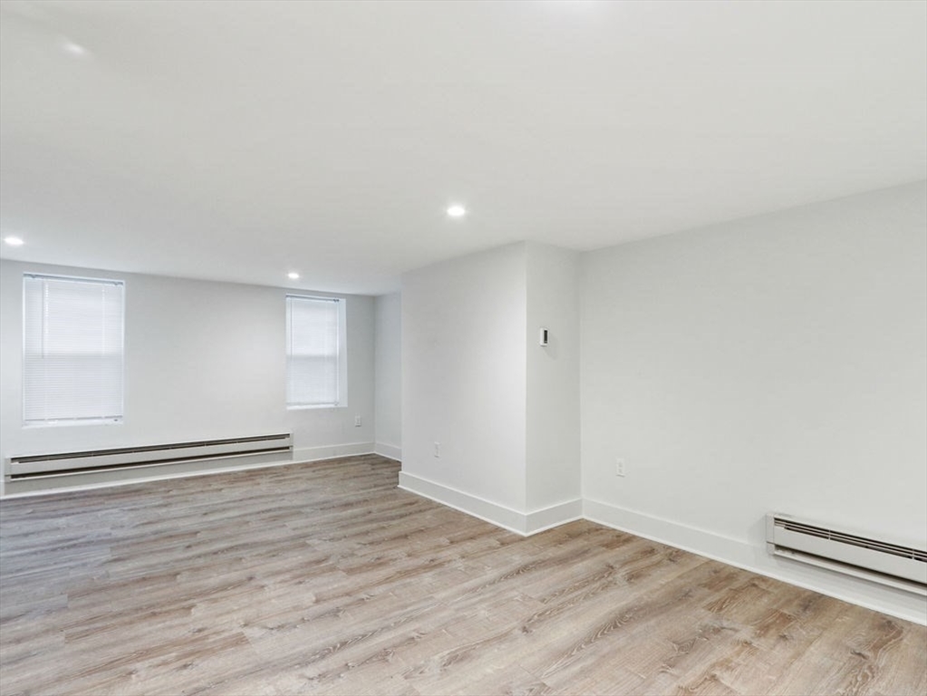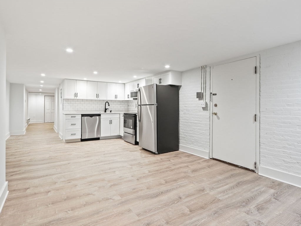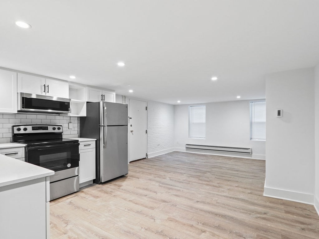 Completely gut-renovated unit featuring a modern open-concept layout with high-end finishes throughout. Bright and spacious living area with recessed lighting and luxury vinyl plank flooring. Stunning kitchen with white shaker cabinets, granite countertops, stainless steel appliances, and subway tile backsplash. Updated bathroom with sleek glass-enclosed tiled shower and contemporary fixtures. Efficient hydronic baseboard heating with digital controls. Clean, minimalist design with great usable space throughout. Convenient location close to shops, restaurants, and public transportation. Pets considered with landlord approval. Tenant responsible for electric; water and sewer included. Private off street parking available not included