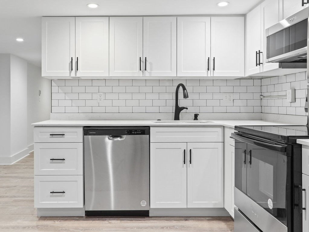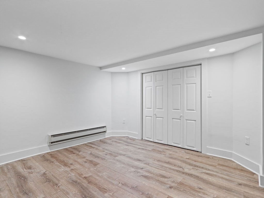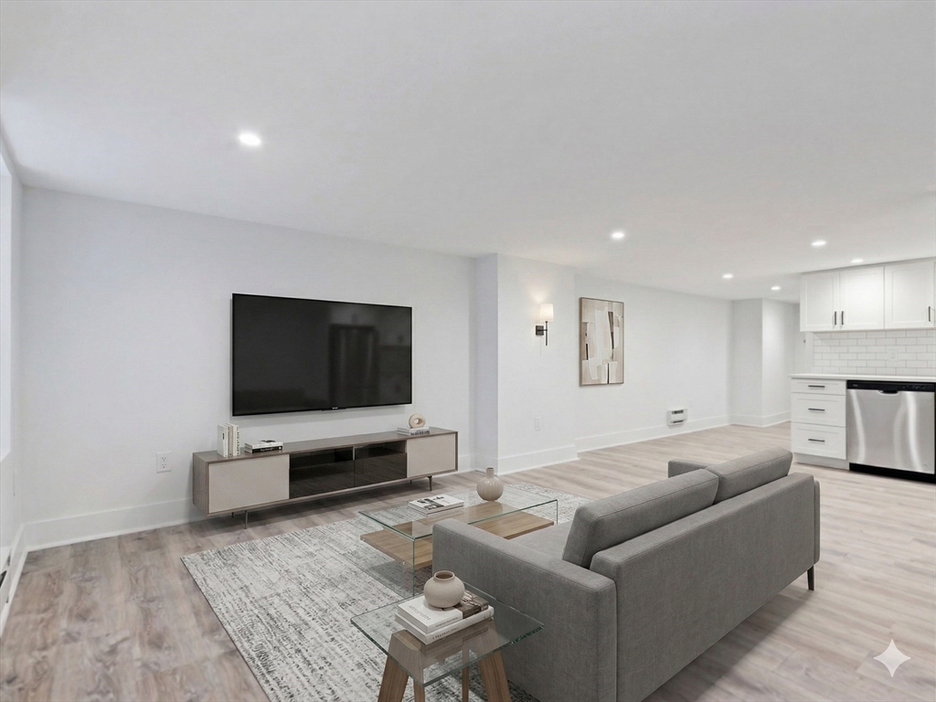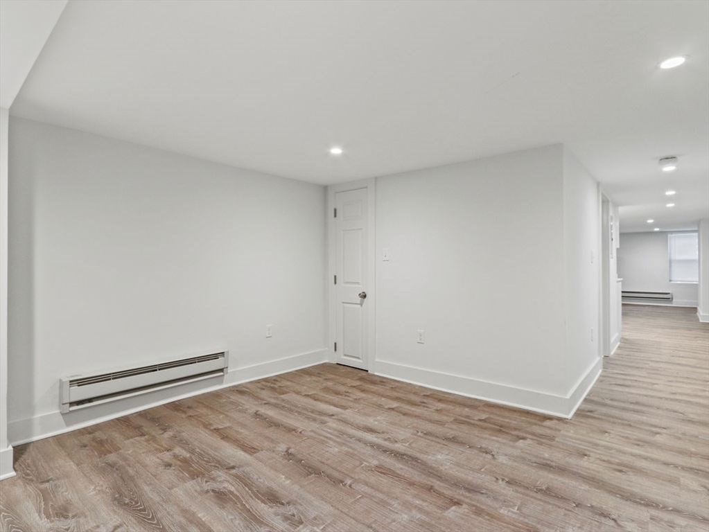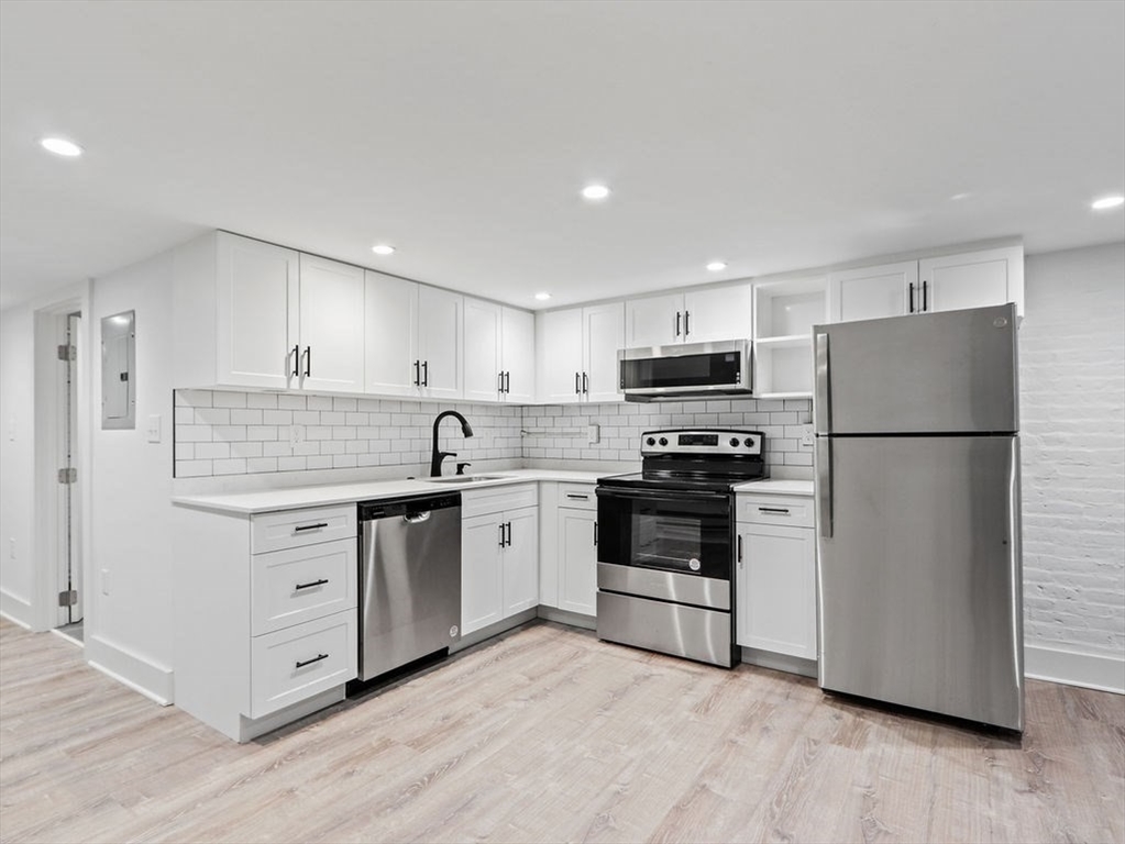 Completely gut-renovated unit featuring a modern open-concept layout with high-end finishes throughout. Bright and spacious living area with recessed lighting and luxury vinyl plank flooring. Stunning kitchen with white shaker cabinets, granite countertops, stainless steel appliances, and subway tile backsplash. Updated bathroom with sleek glass-enclosed tiled shower and contemporary fixtures. Efficient hydronic baseboard heating with digital controls. Clean, minimalist design with great usable space throughout. Convenient location close to shops, restaurants, and public transportation. Pets considered with landlord approval. Tenant responsible for electric; water and sewer included. Private off street parking available not included