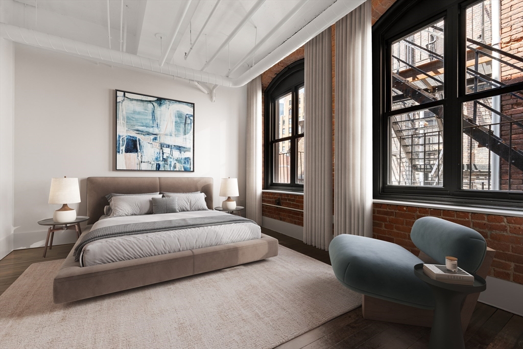 Completely renovated 3 bed / 2 bath Downtown loft steps to Financial District, Waterfront & Greenway. Direct elevator access leads to 5th floor condo with 10' concrete ceilings, exposed brick & original hardwood floors. Open floorplan with large living / dining area with views of Finanical District and peeks towards Rowes Wharf & Boston Harbor. Beautifully renovated kitchen with white cabinets, quartz waterfall counters & GE Profile appliances. Primary suite features en-suite tile bathroom. 2nd bedroom has exposed brick walls with adjacent bathroom with large glass door shower. Third bedroom overlooks High Street & downtown Boston. Laundry room with storage and additional refrigerator. Located in the heart of Boston with easy access to dining, shopping & major transportation. This new condo conversion provides a unique opportunity for owners & landlords: no short term rental restrictions.