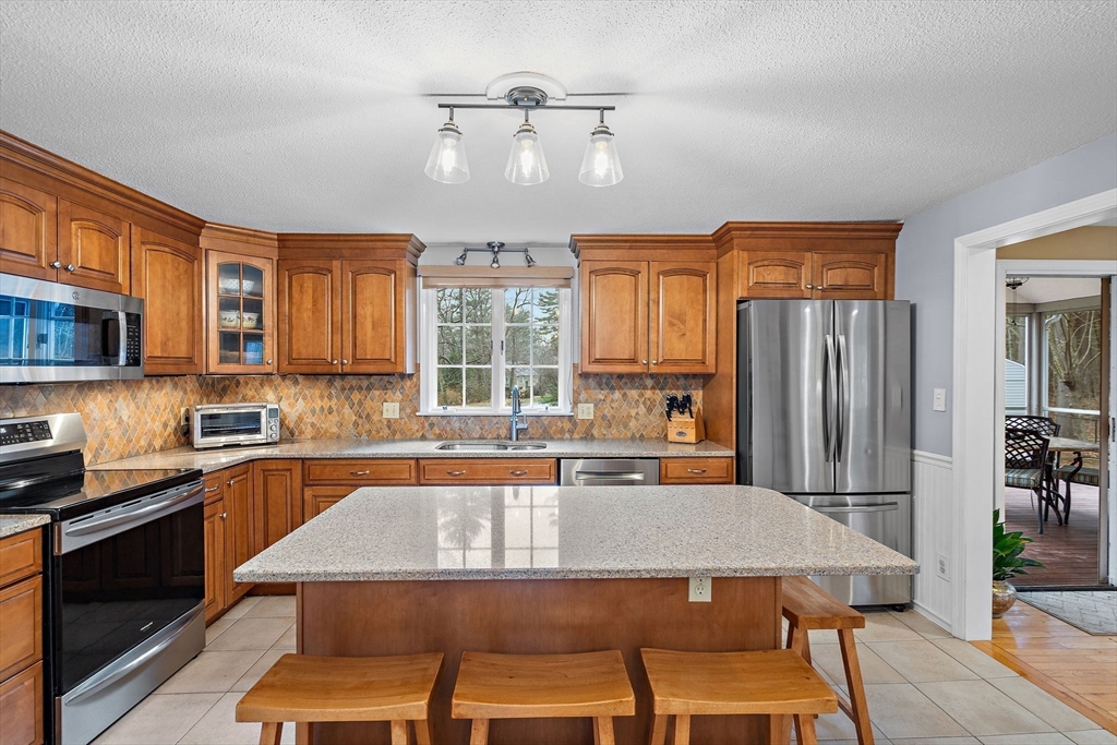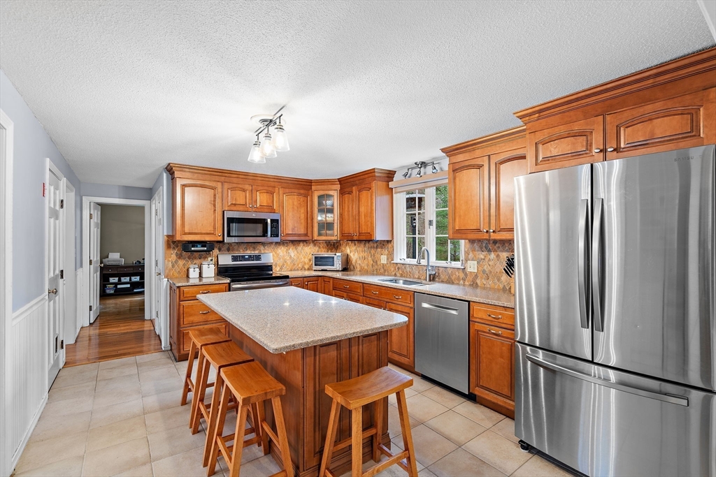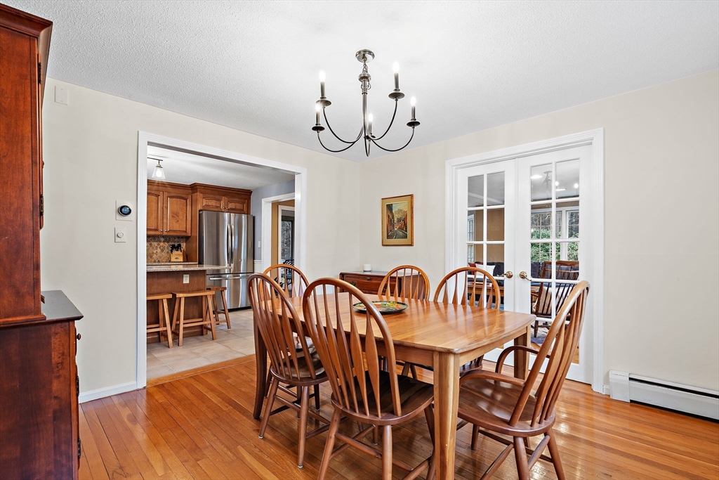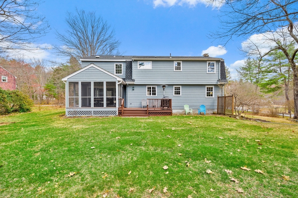 This wonderful gambrel home is located on a quiet cul-de-sac and is set well back off the road. Inside, you'll find a welcoming first floor with versatile spaces perfect for entertaining. Light and bright, the living room features a brick fireplace and hardwood floors. The dining room and family room also have hardwood with a set of French doors that connect the two spaces. A slider leads out onto the screened porch with attached deck. The kitchen features stainless steel appliances, quartz counters and a generously sized island. There is an additional home office space with custom built-ins. The second floor primary suite is accented with vaulted ceiling and features an ensuite bath with shower, soaking tub, double sinks and attached laundry room. Three additional bedrooms and a full bath round out this floor. The finished basement has a large mudroom that leads directly out to the driveway. The detached two car garage has a second floor space ideal for studio, workspace or game room
