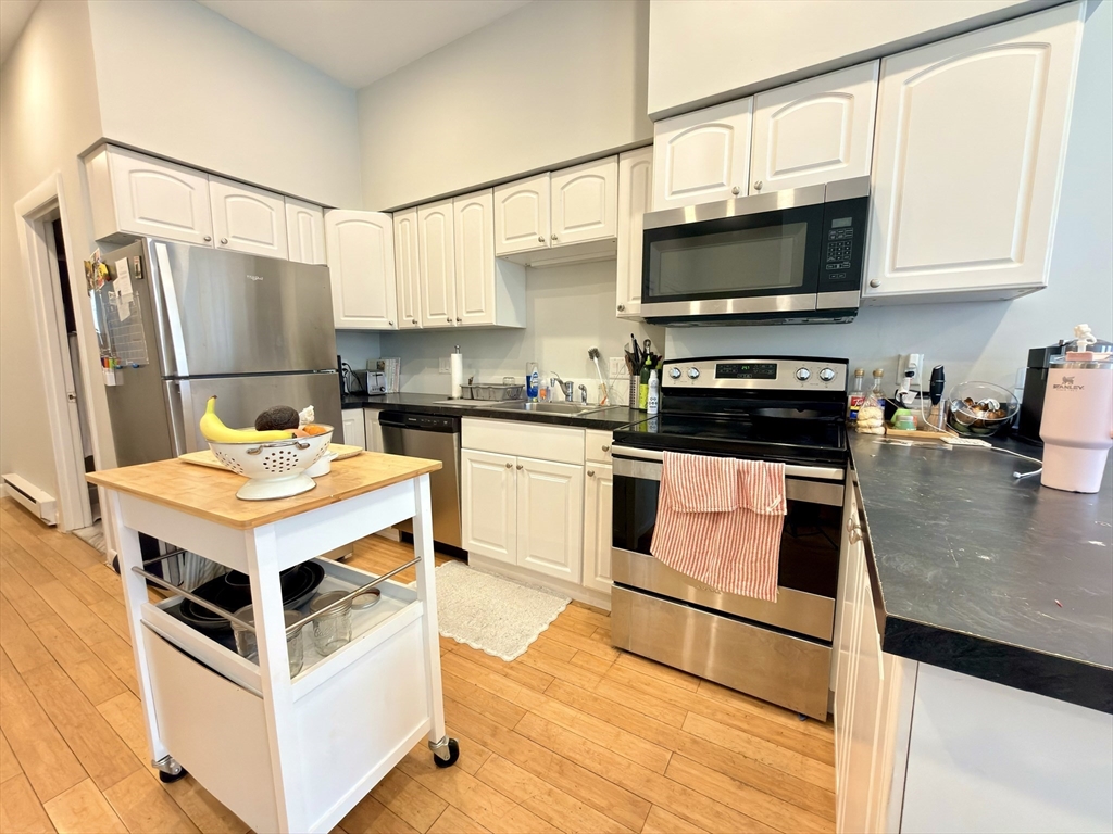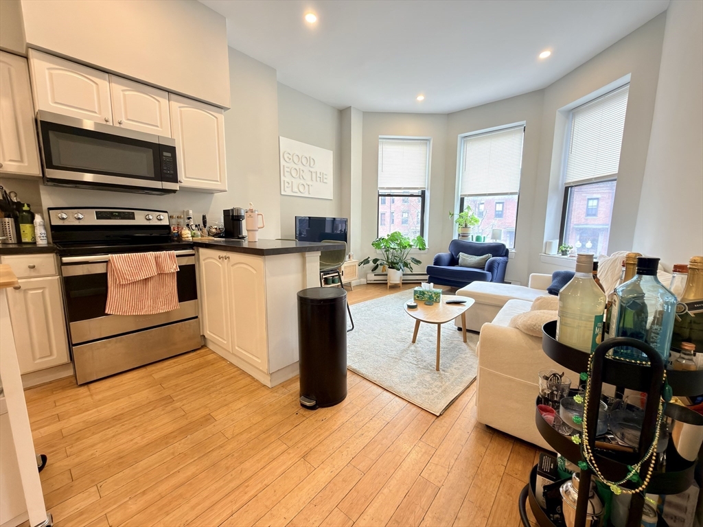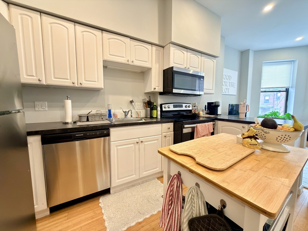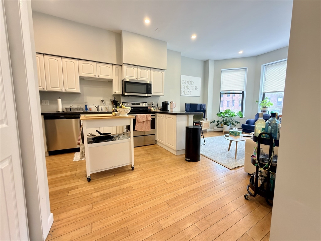 Beautifully renovated 3-bedroom apartment in a classic Boston brownstone featuring high ceilings, hardwood floors, and abundant natural light throughout. The unit offers a modern open-concept kitchen with stainless steel appliances, white cabinetry, and a spacious living area ideal for entertaining. Generously sized bedrooms with great closet space, along with a fully updated bathroom and in-unit laundry for added convenience. Located in a prime area close to public transportation, shops, restaurants, parks, and universities, with easy access to major highways. Off-street parking available, Available 9/1.