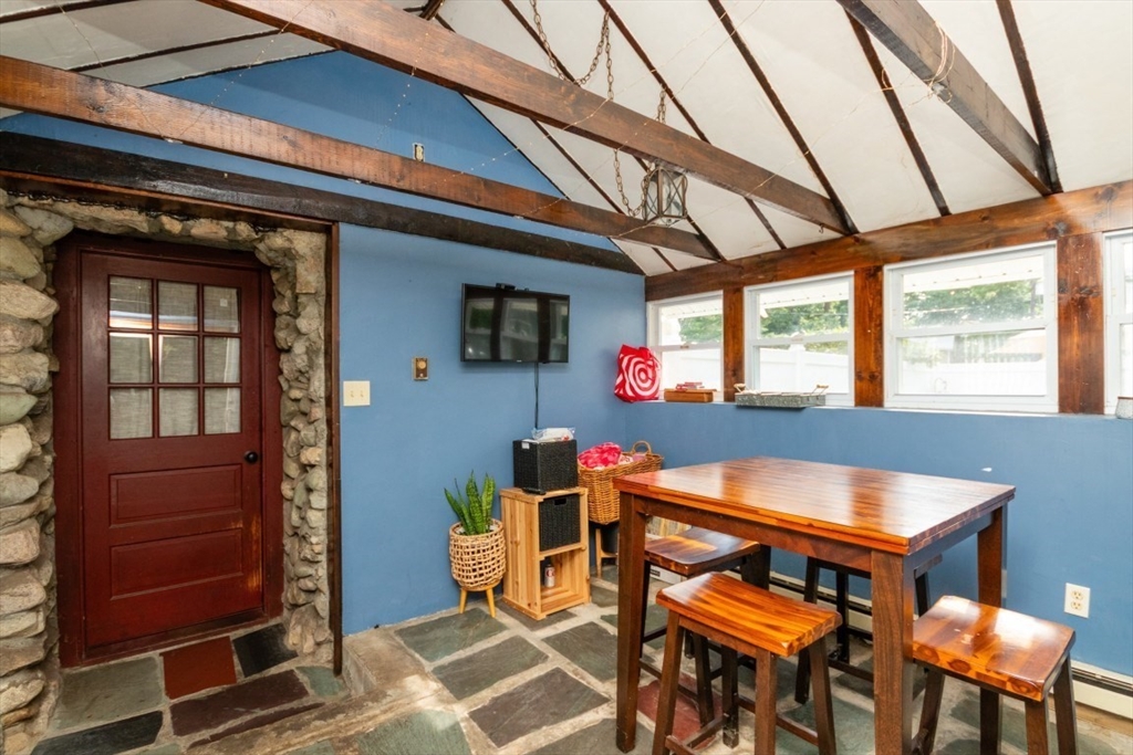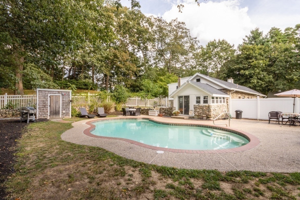 OPEN HOUSE SUNDAY 11 - 12:30! Welcome to 8 Old Fisher Lane! Spacious 8-room, 4-bedroom, 3-bath home offering over 2,000 sq. ft. of living space with classic stone siding and great character. First floor features a primary suite with updated en suite bath, modern kitchen with newer stainless steel appliances, dining room with wood stove, living room with wood-burning stove, and a family room with cathedral ceiling and loft. Additional highlights include first-floor laundry, second full bath, and a heated four-season room overlooking a private, fenced backyard with in-ground pool. Second floor offers three generously sized bedrooms and an updated full bath. Oversized two-car garage currently used for workshop and storage. Peaceful setting with numerous updates throughout. Conveniently located near town center, schools, major routes, Adam’s Farm, and scenic trails.