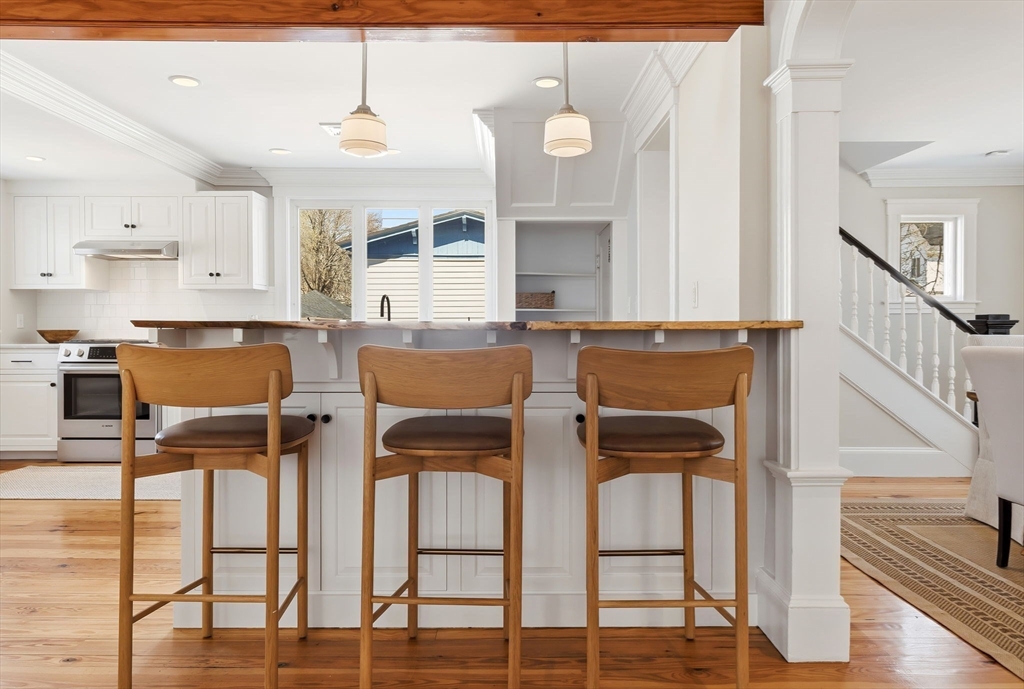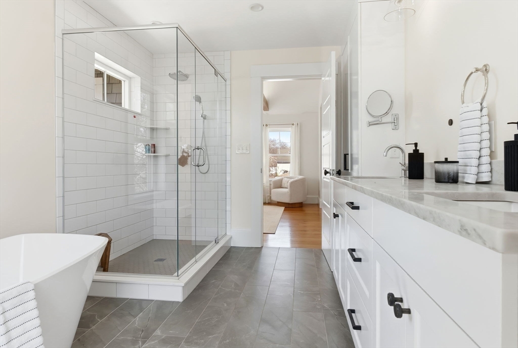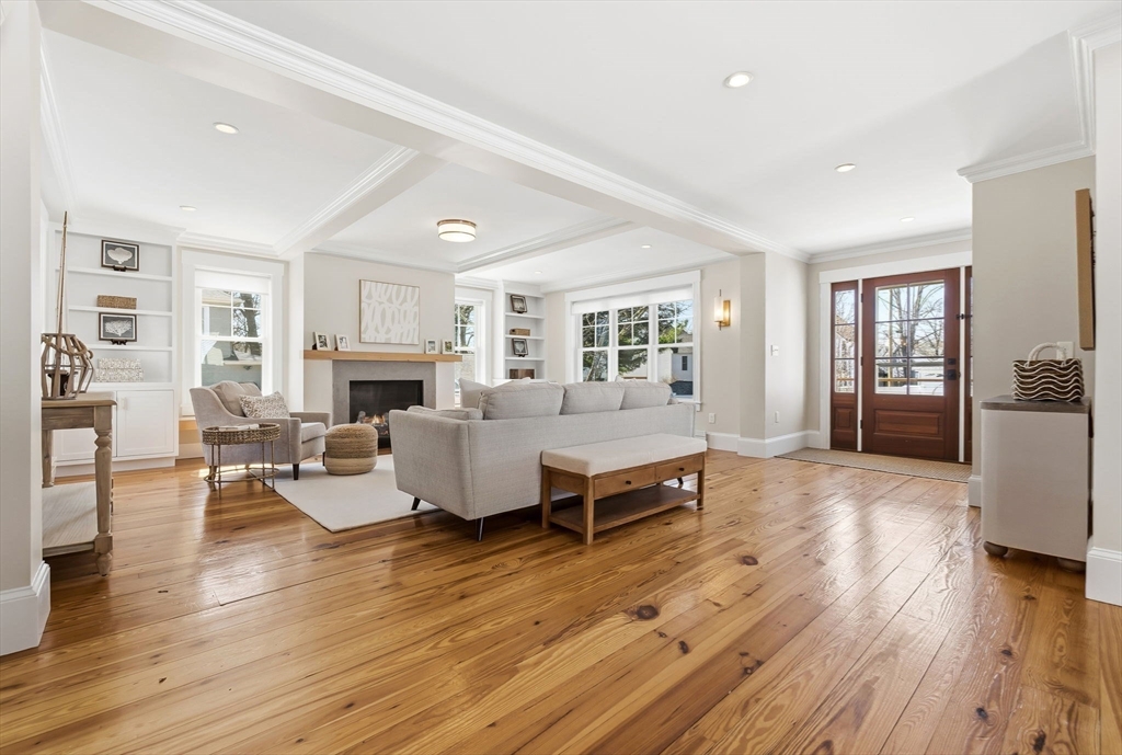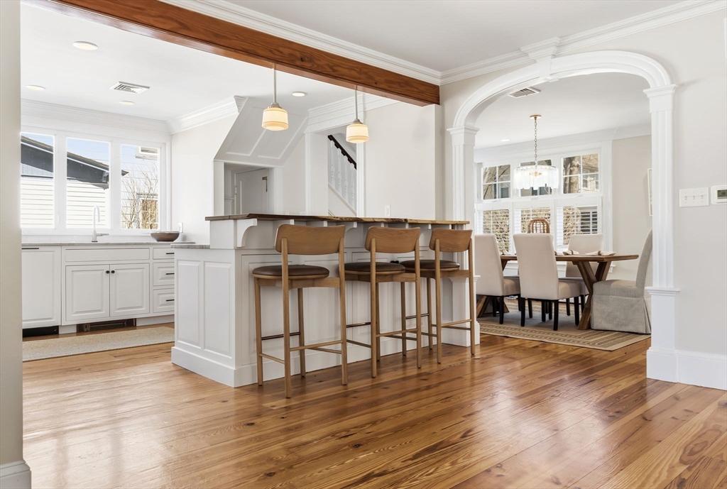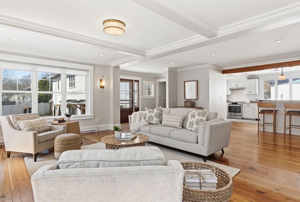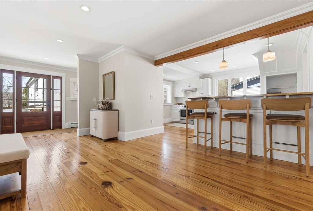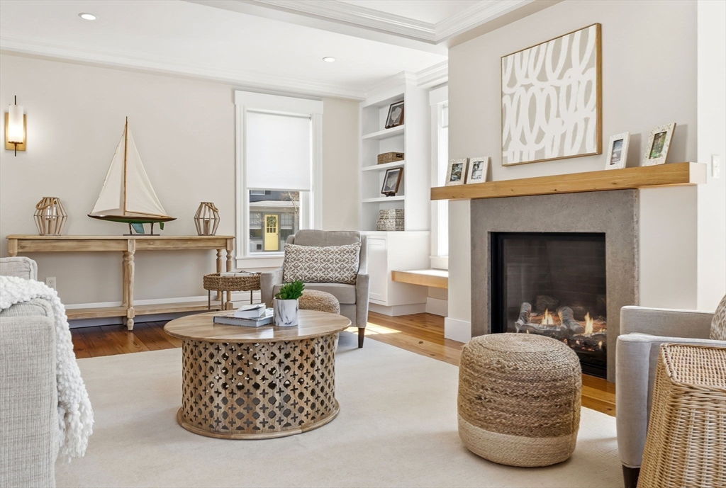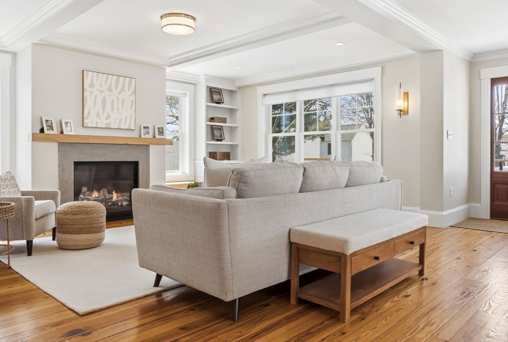Located just steps from downtown Amesbury, this exceptional property was the personal home of an award-winning builder, showcasing thoughtful design and craftsmanship throughout. The main residence offers 3 bedrooms and 3.5 baths, highlighted by elegant archways, coffered ceilings, and refined finishes. The primary suite features a spa-like ensuite, while the living room is anchored by a gas fireplace, custom built-ins, and crown molding. A standout feature is the beautifully renovated barn, offering a versatile bonus space ideal for a home gym, family room, or game room. Above, a well-appointed apartment includes a bedroom, full bath, and inviting living area with beverage bar and sink. A rare opportunity to own a truly unique and flexible property in a prime location.